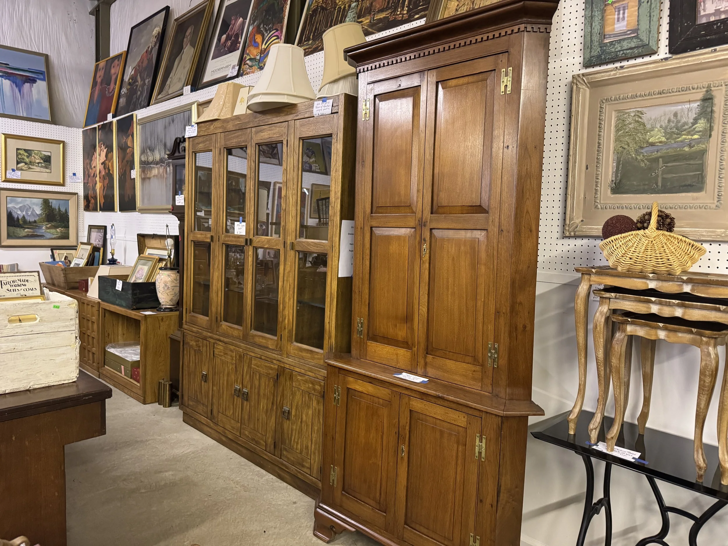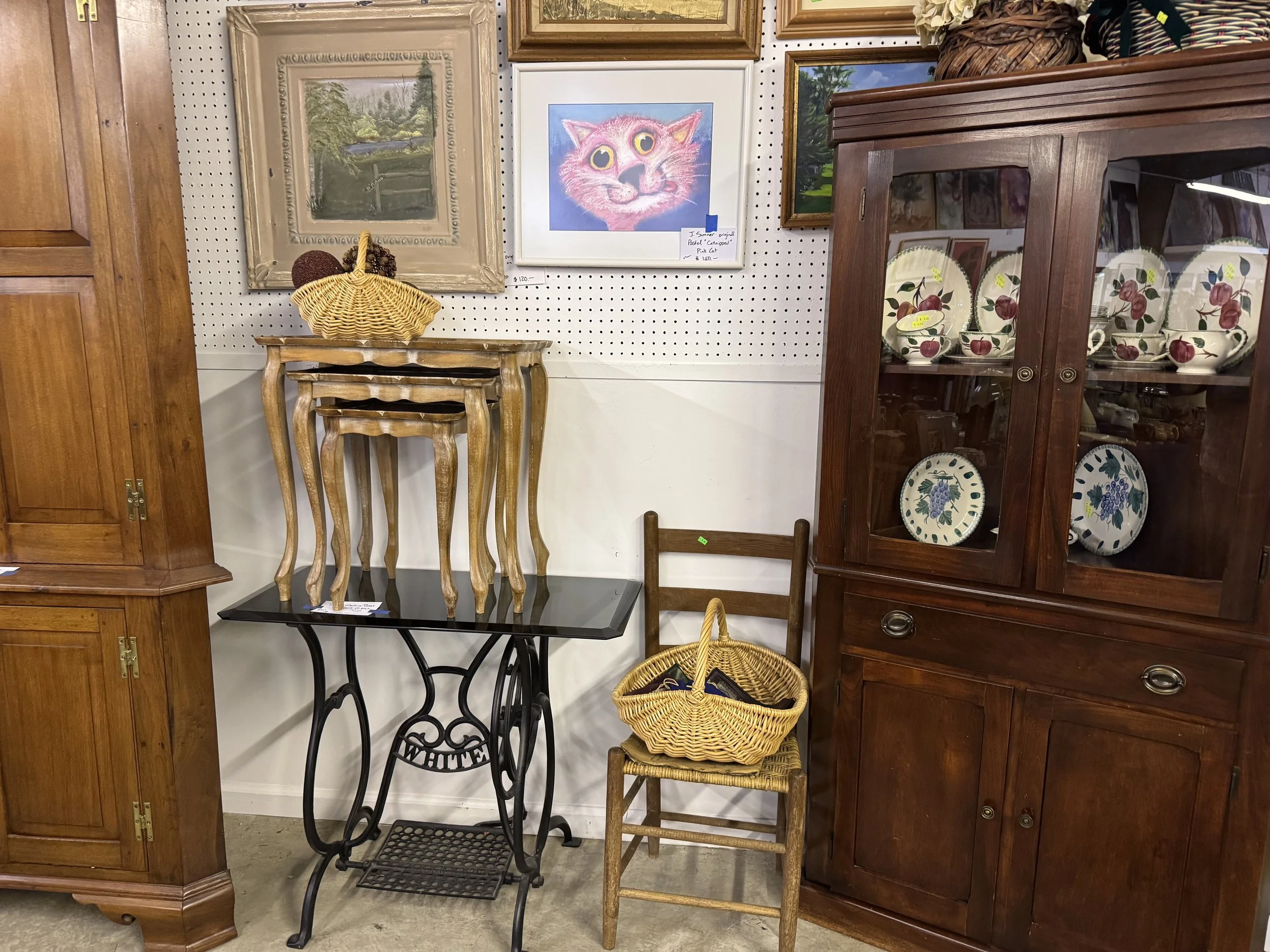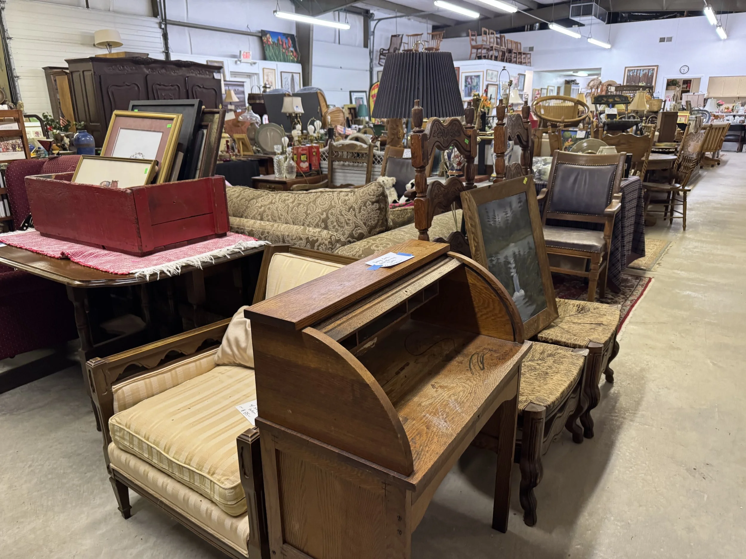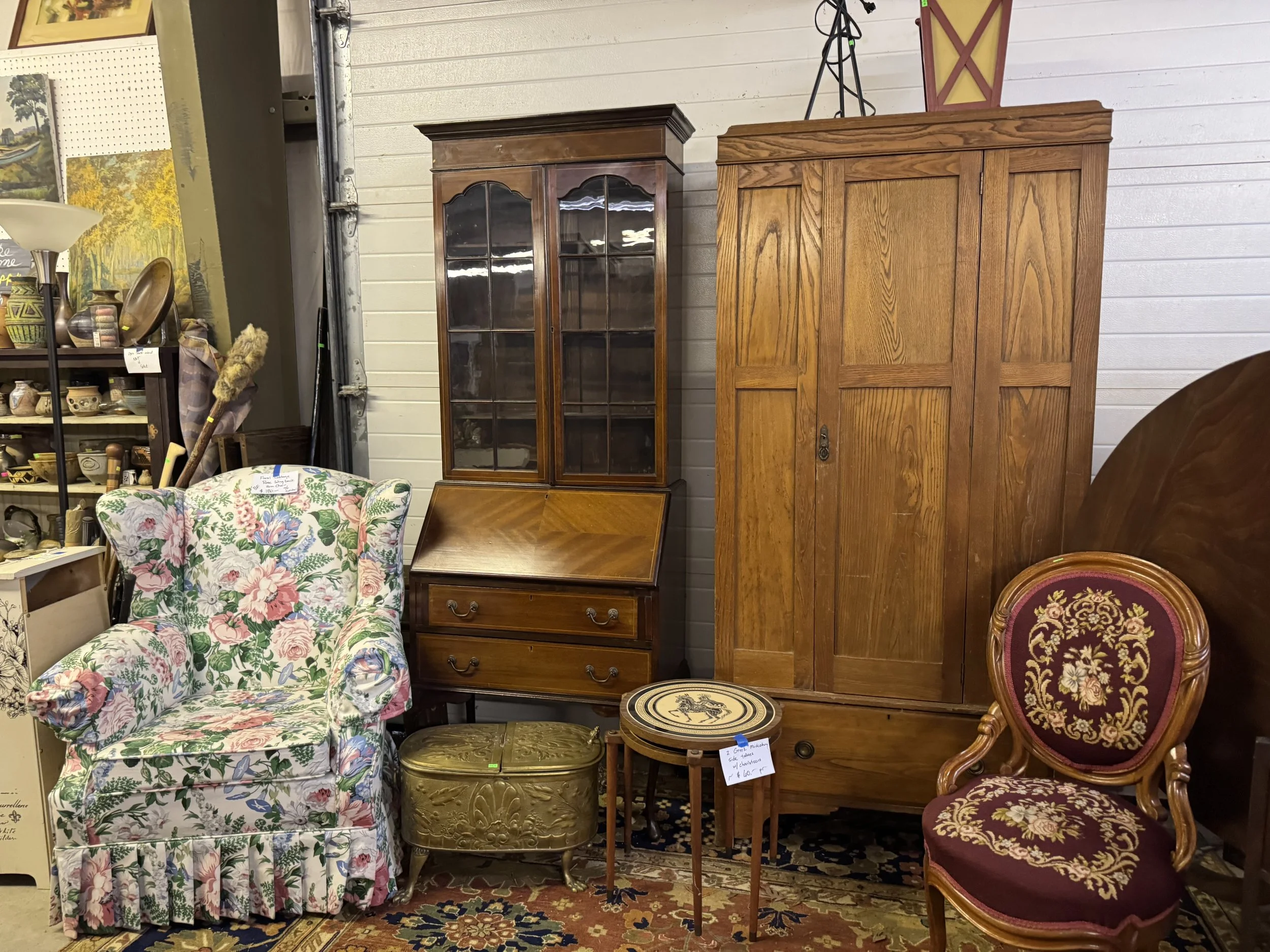 Furniture: Several corner cupboards, servers, dining room sets, Woody chairs, side tables, antique secretary, arm chairs, dressers, side tables, etc