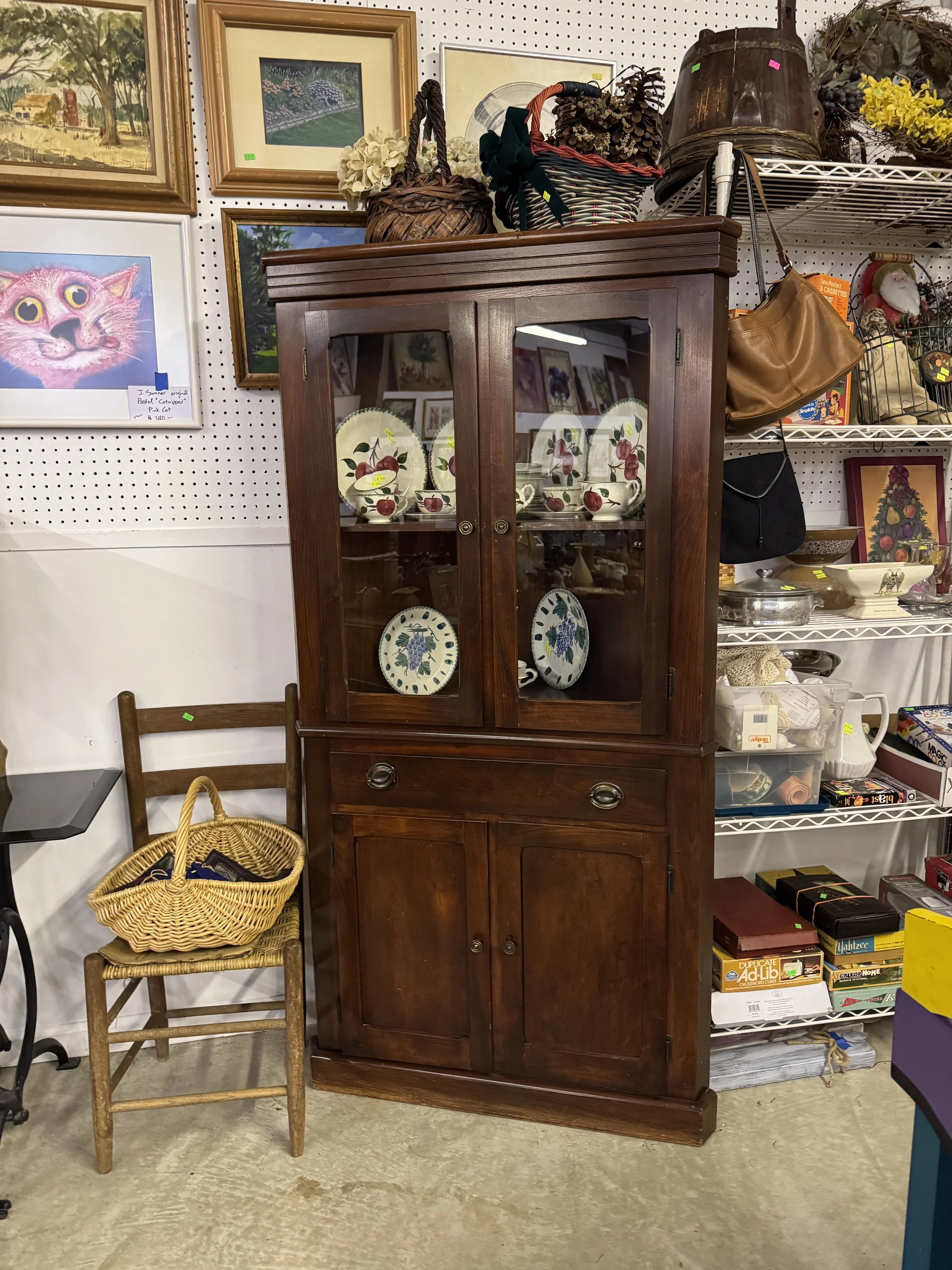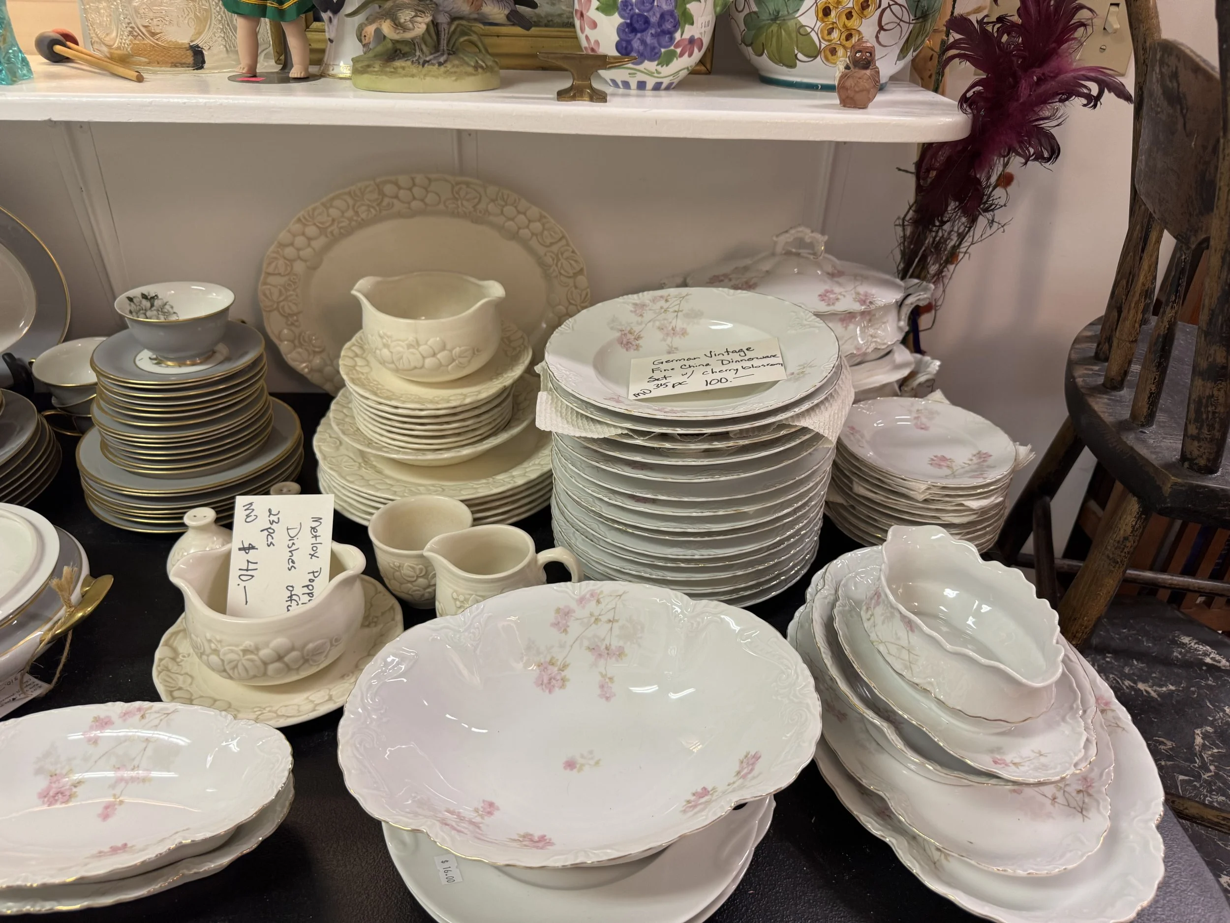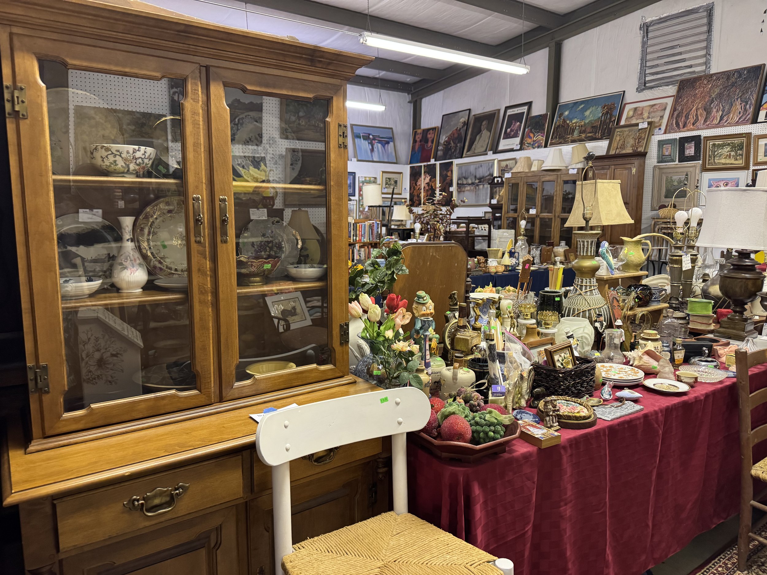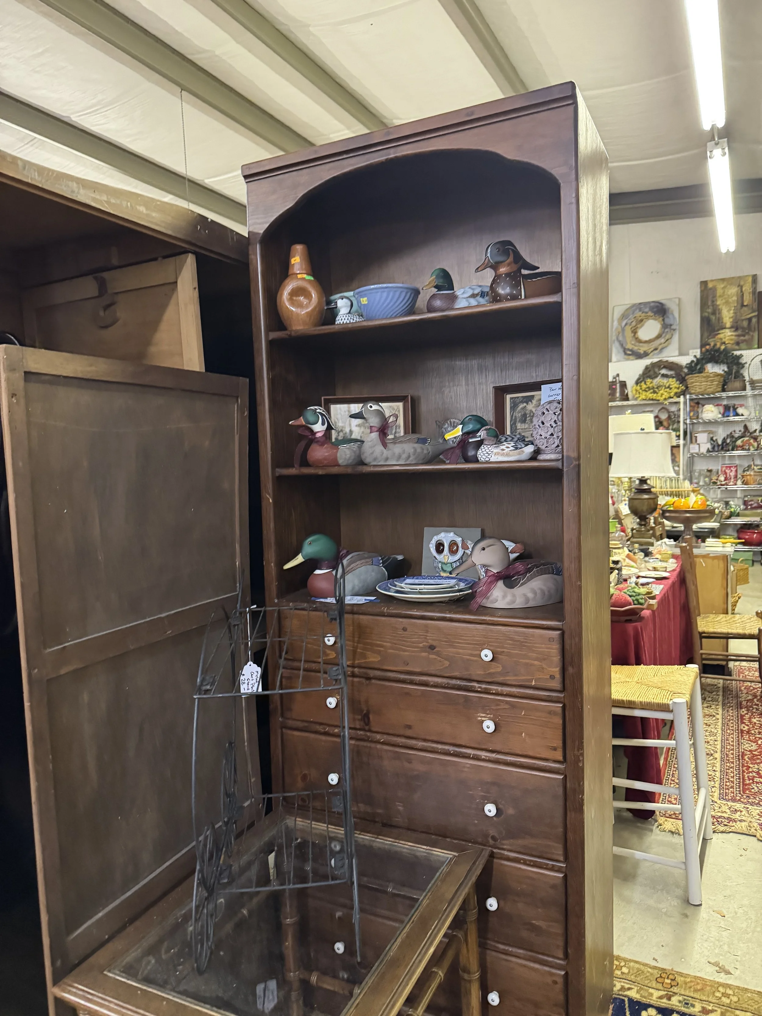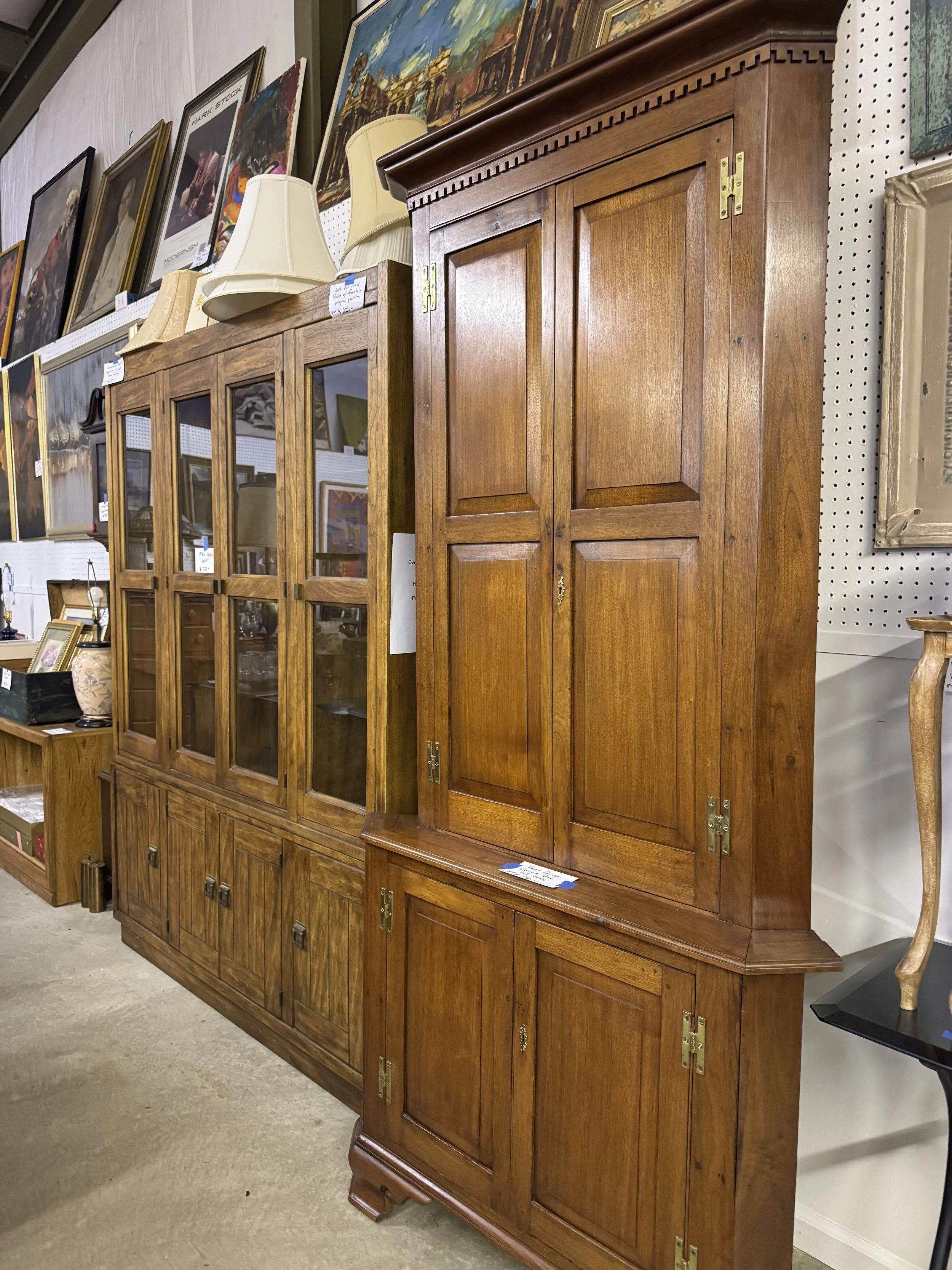 Furniture: Several corner cupboards, servers, dining room sets, Woody chairs, side tables, antique secretary, arm chairs, dressers, side tables, etc