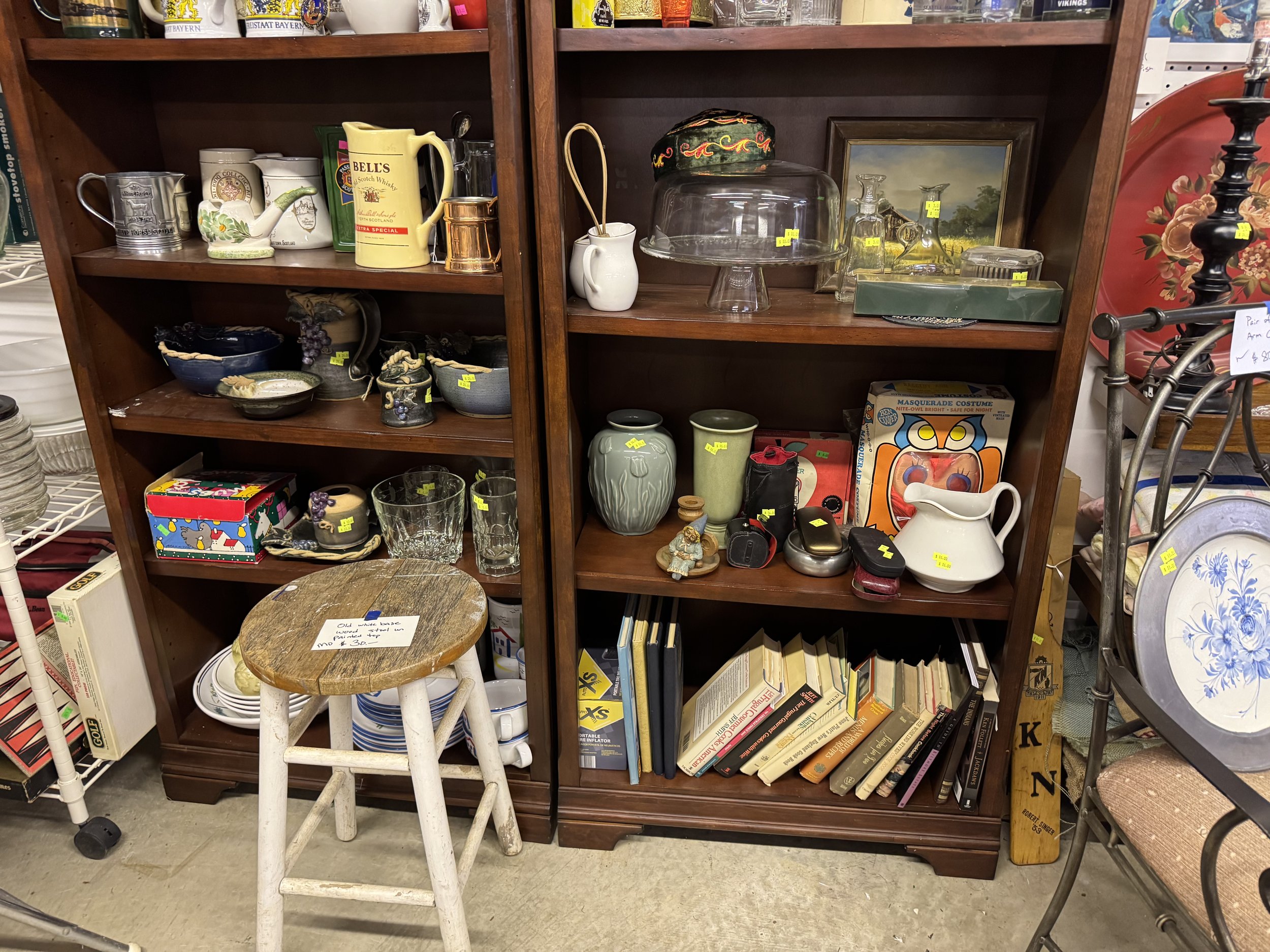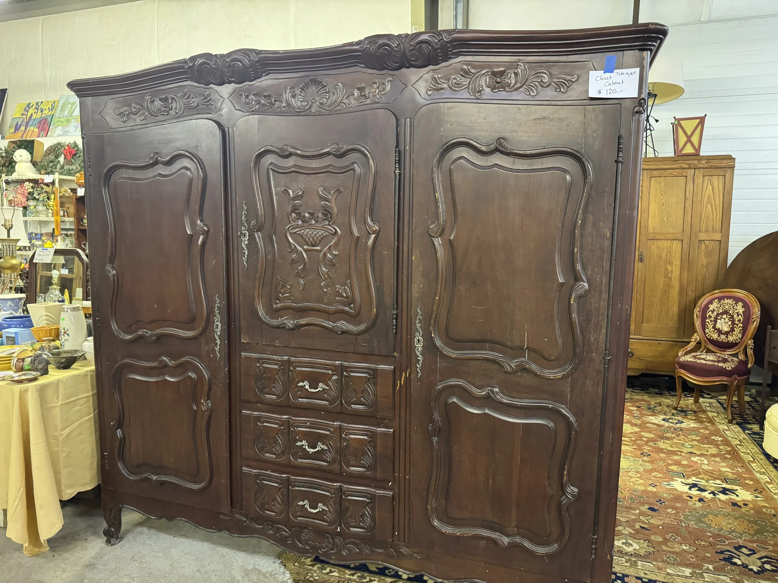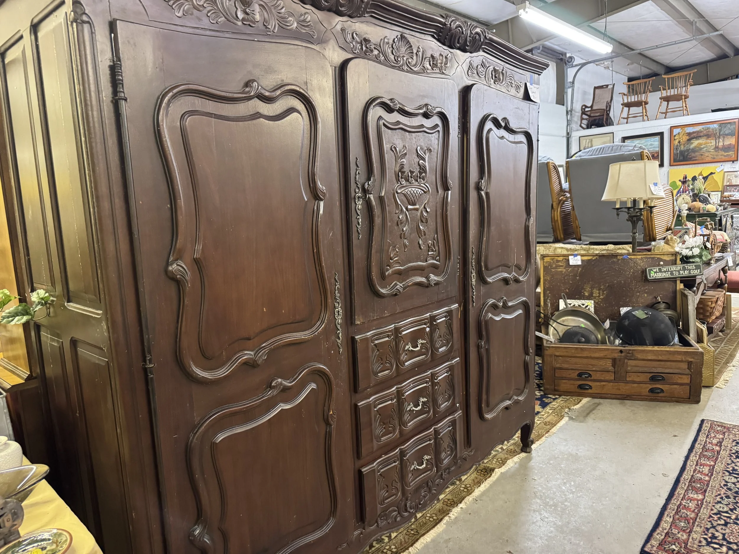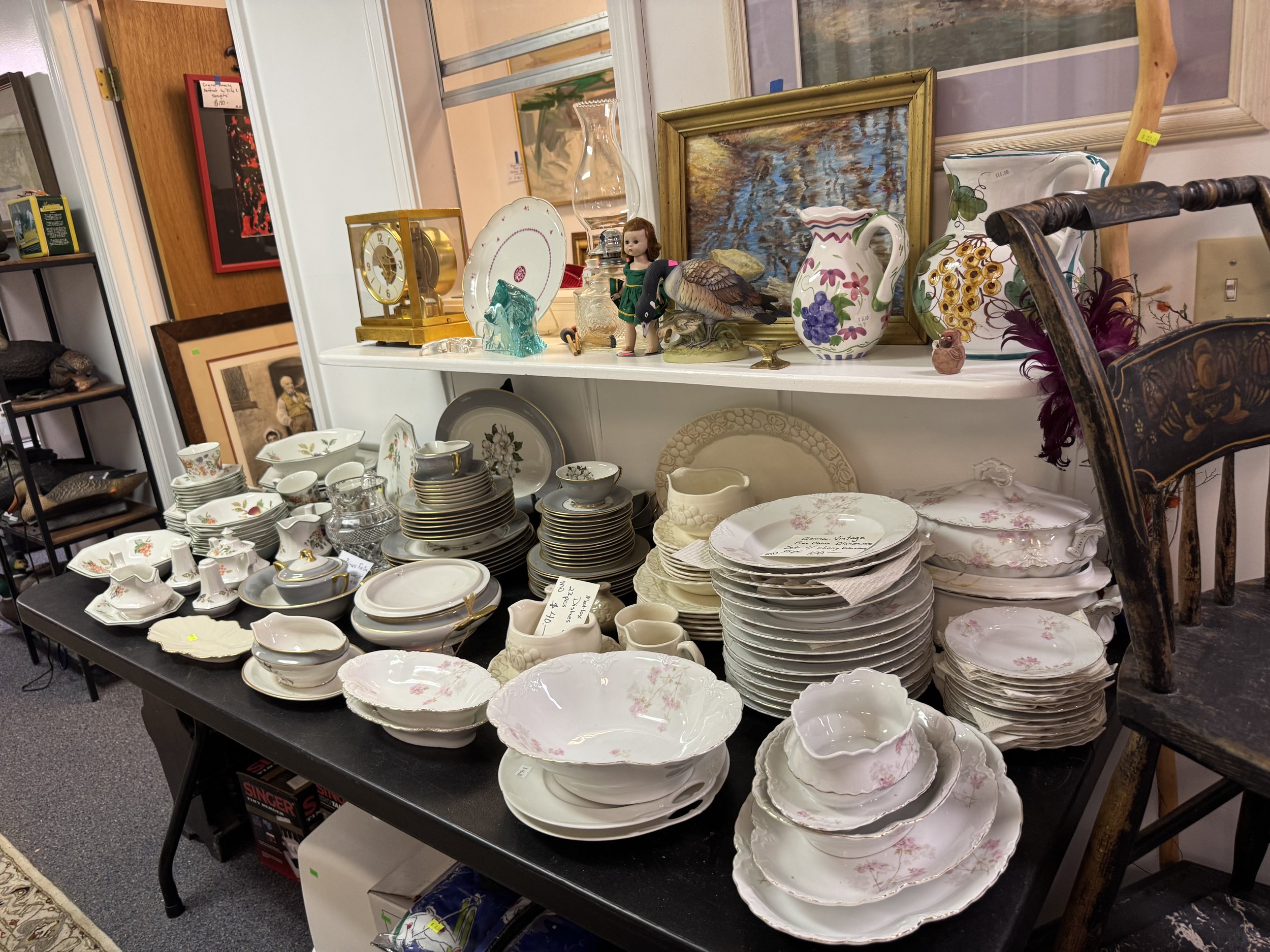 Furniture: Several corner cupboards, servers, dining room sets, Woody chairs, side tables, antique secretary, arm chairs, dressers, side tables, etc