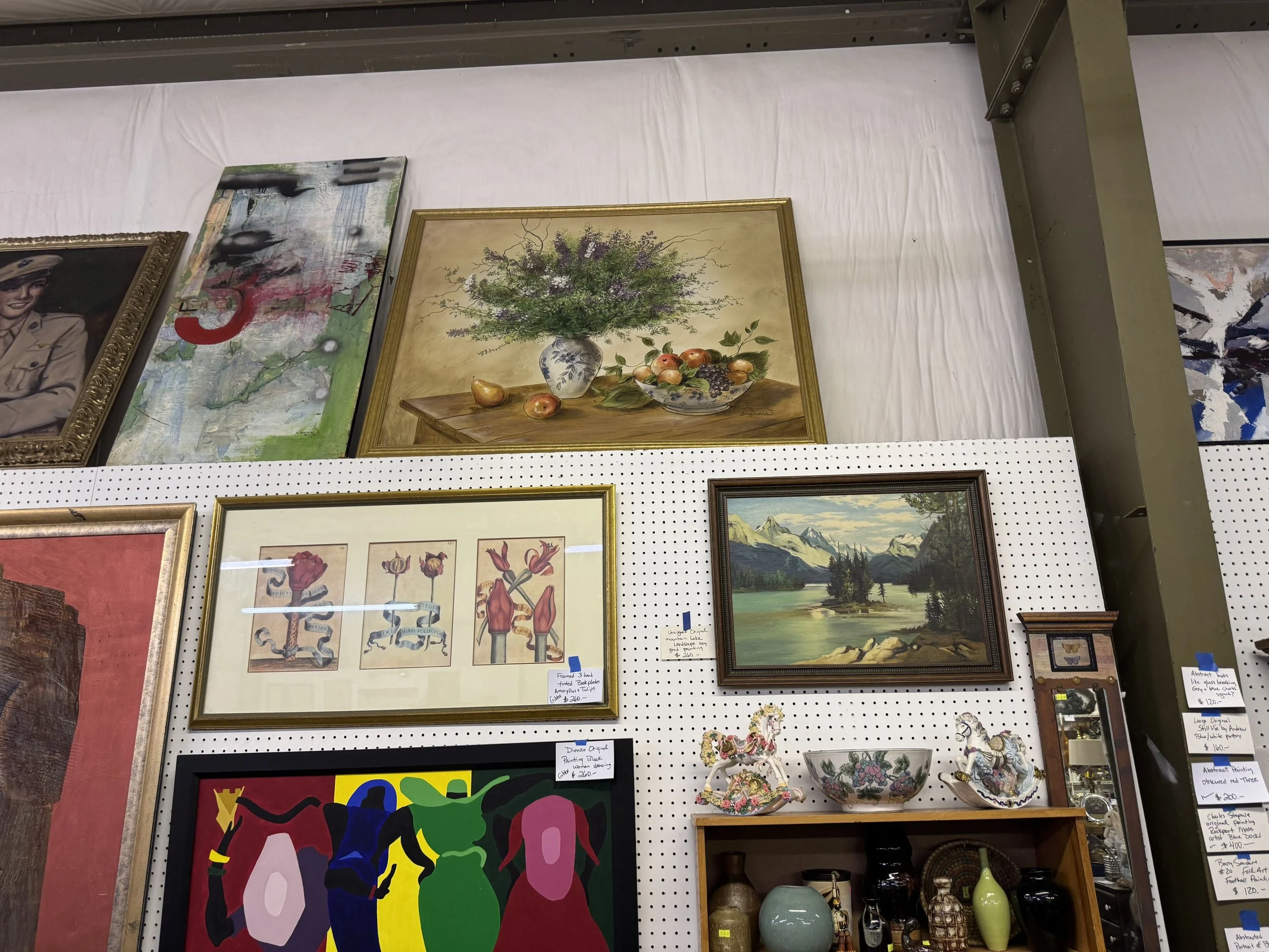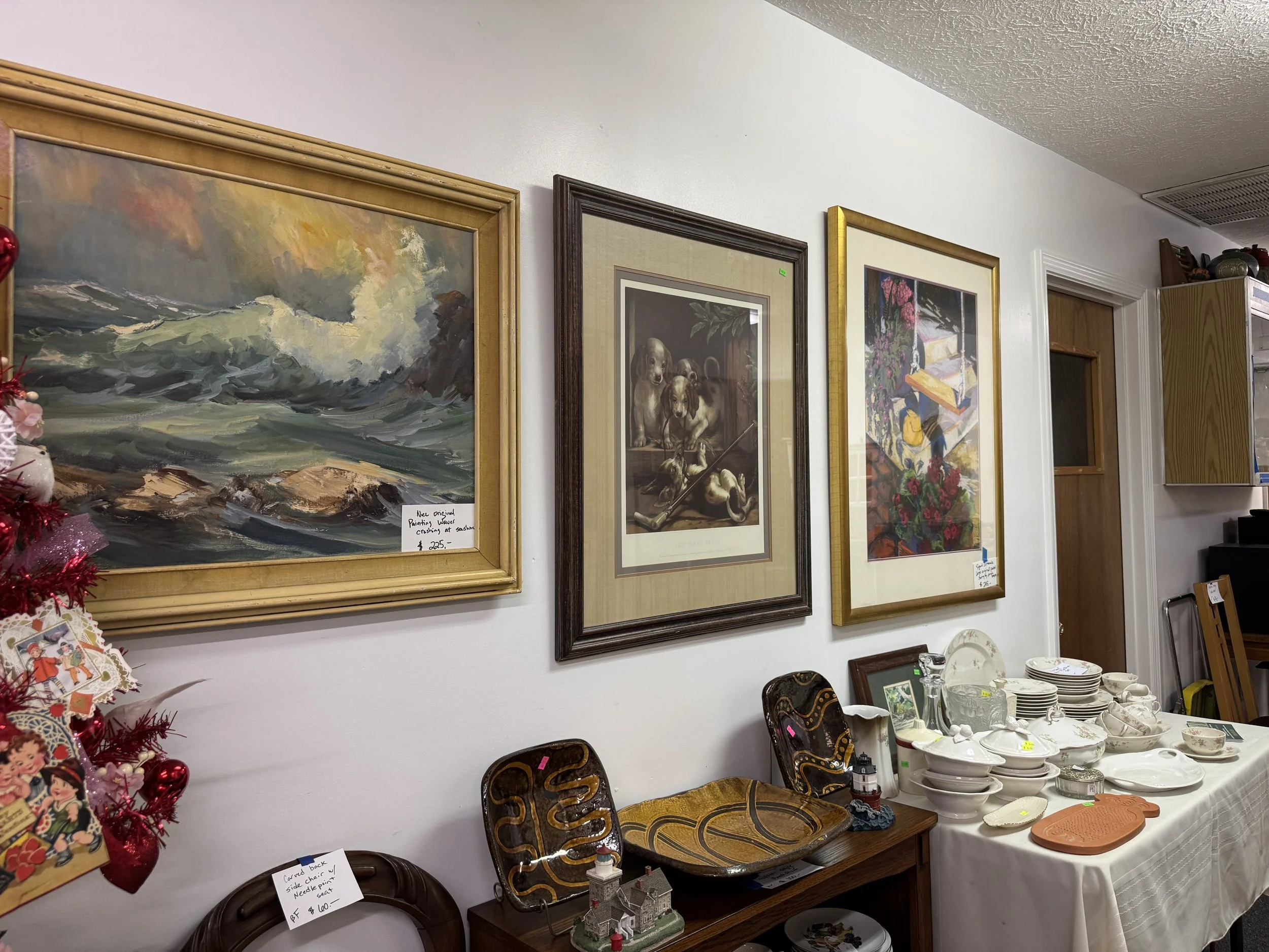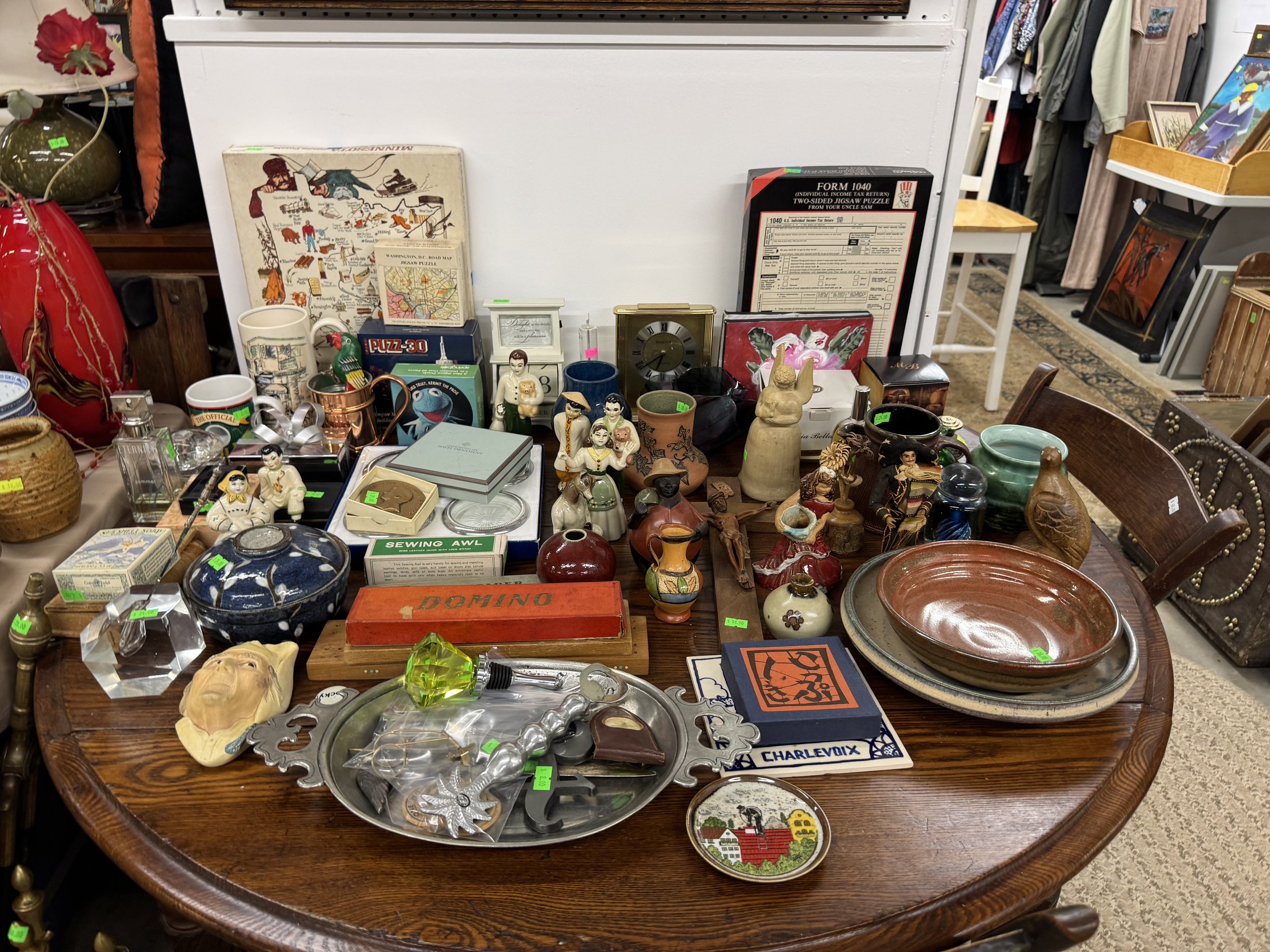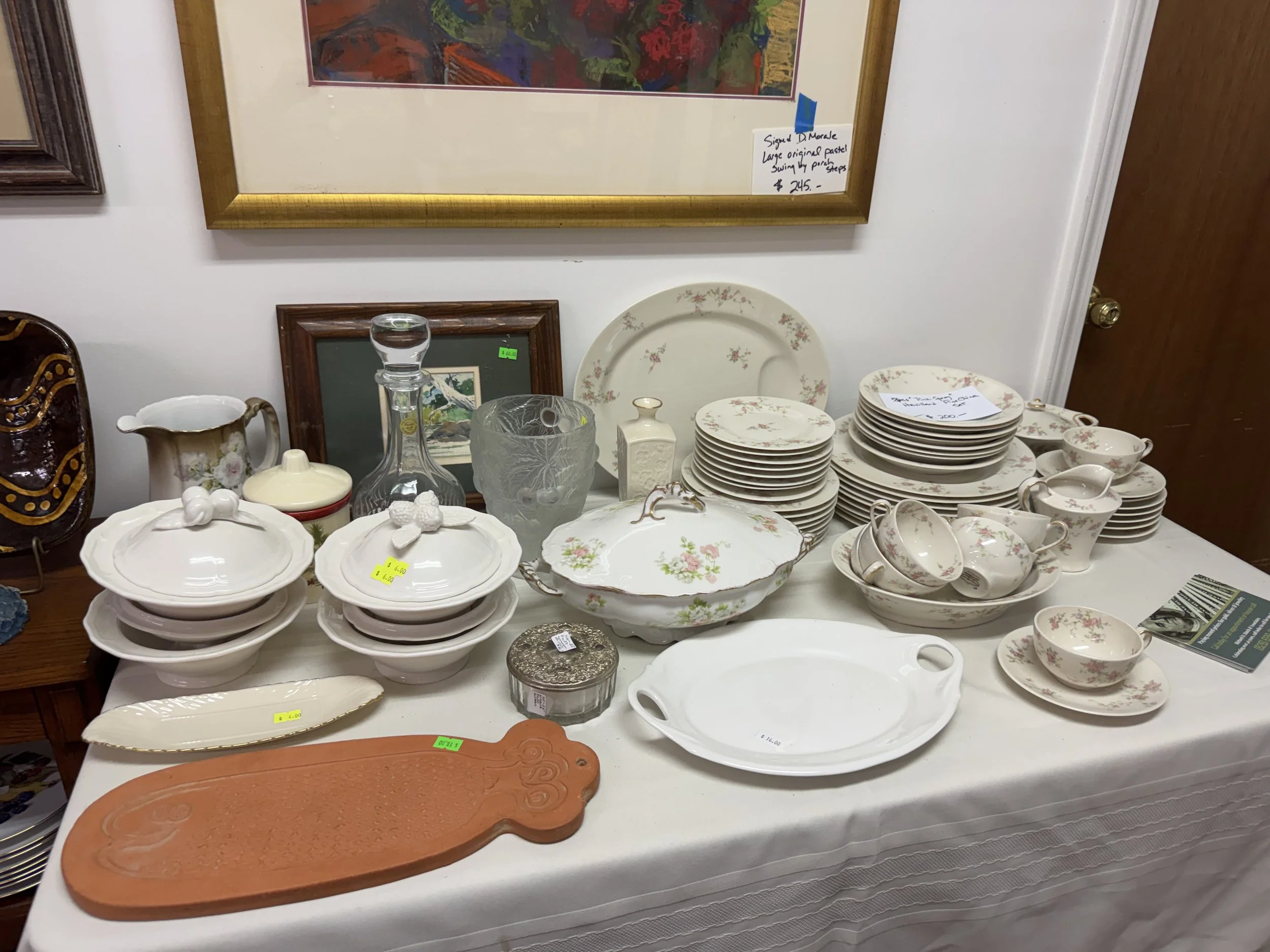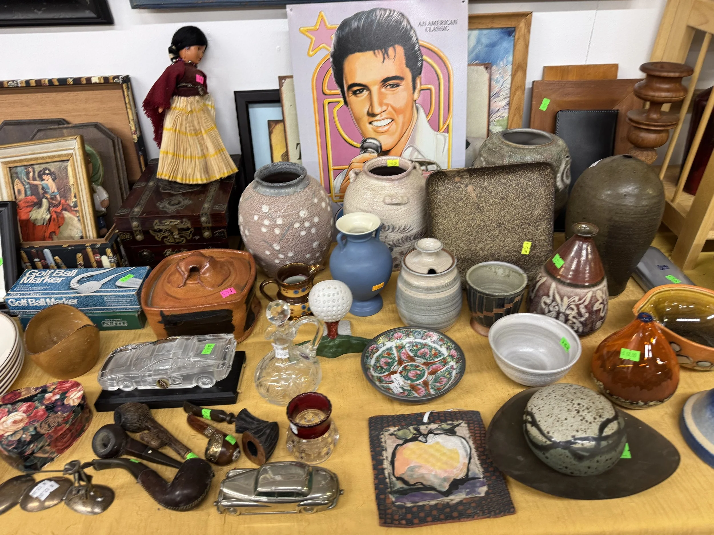 Misc: Original art -listed artists, quality prints, plastic duck decoys, books, Christmas items, Madam Alexander doll collection, Hummel collection, pottery collection, First Nations pottery, women's clothing and shoes, etc