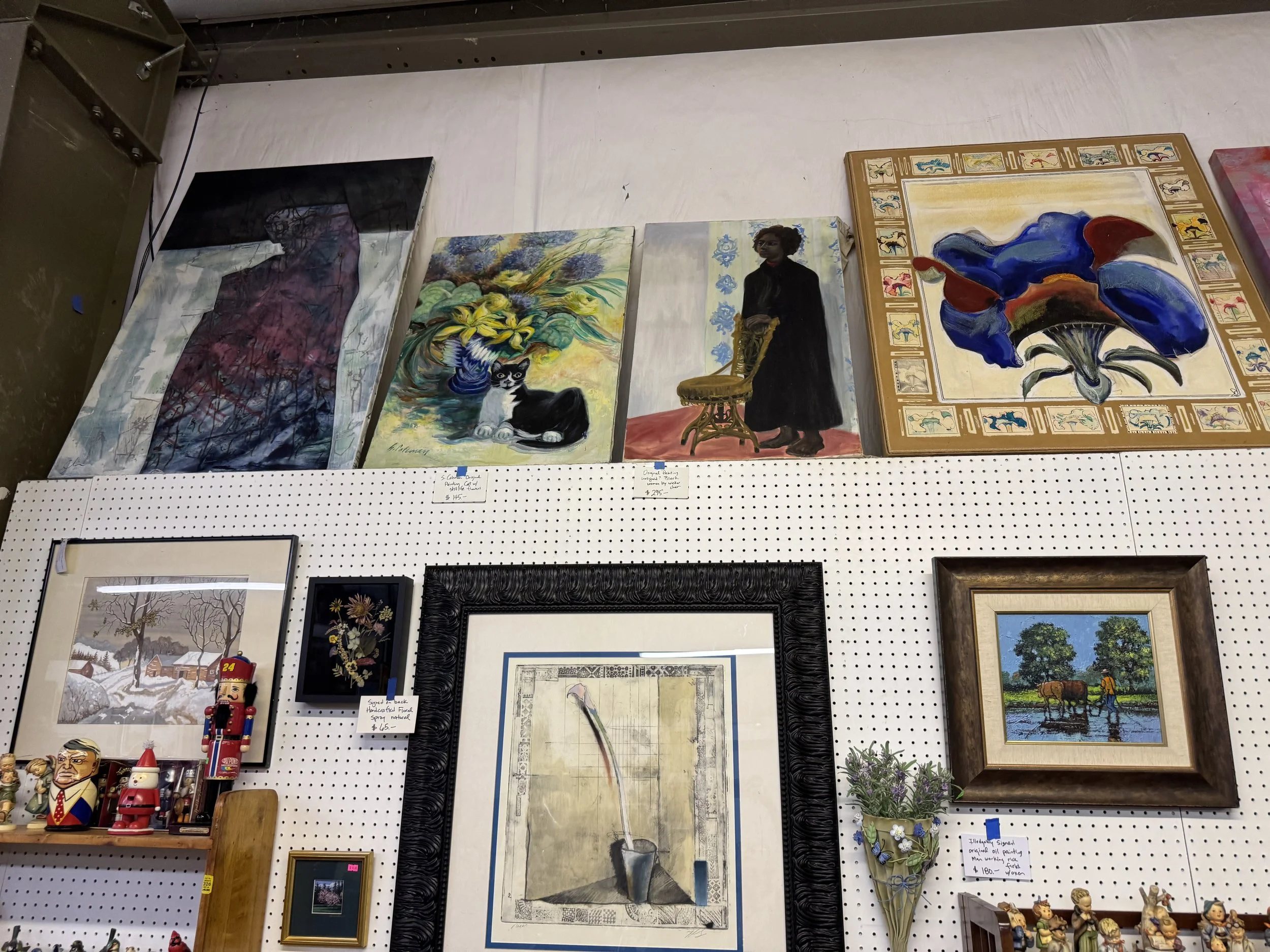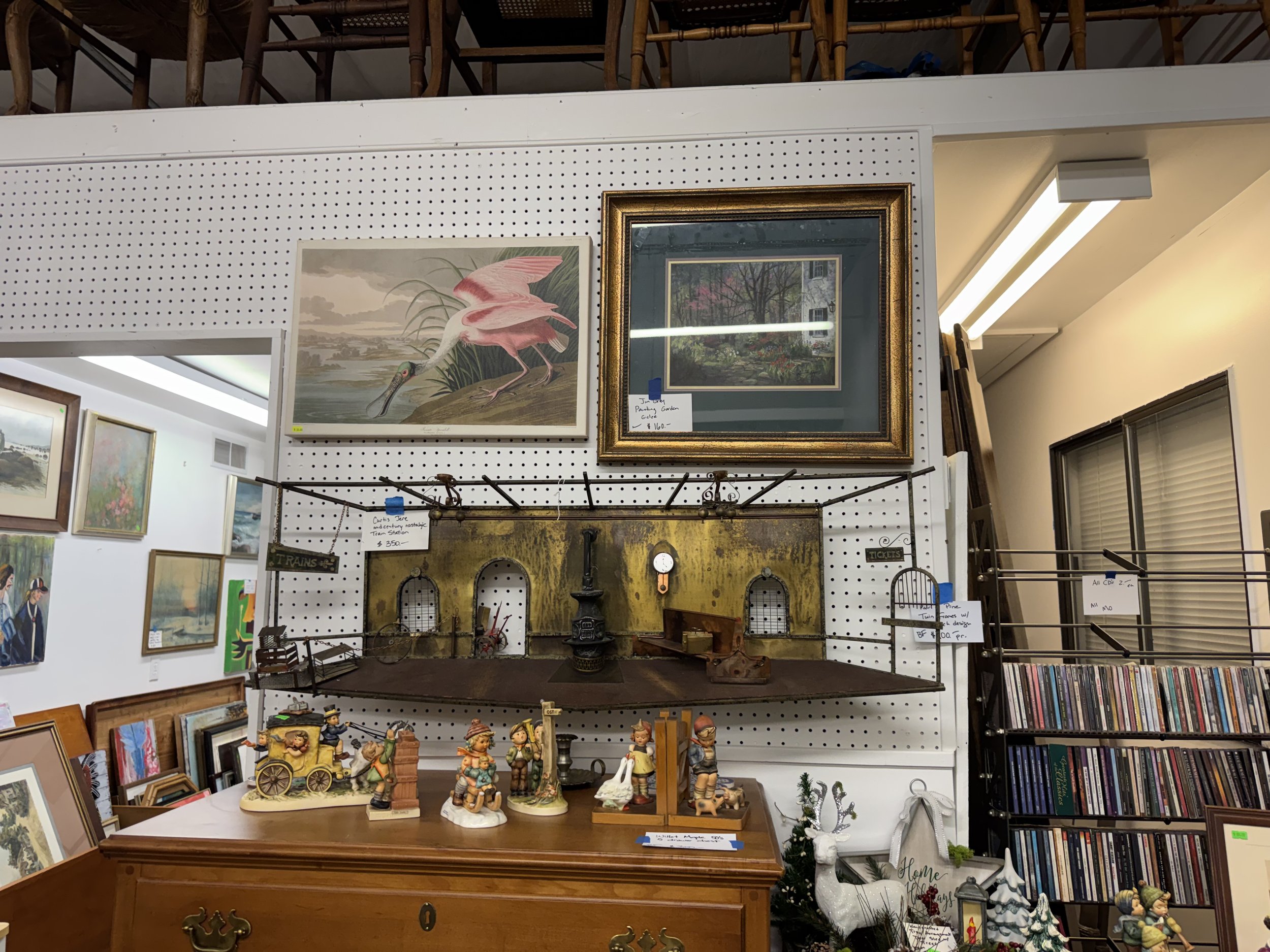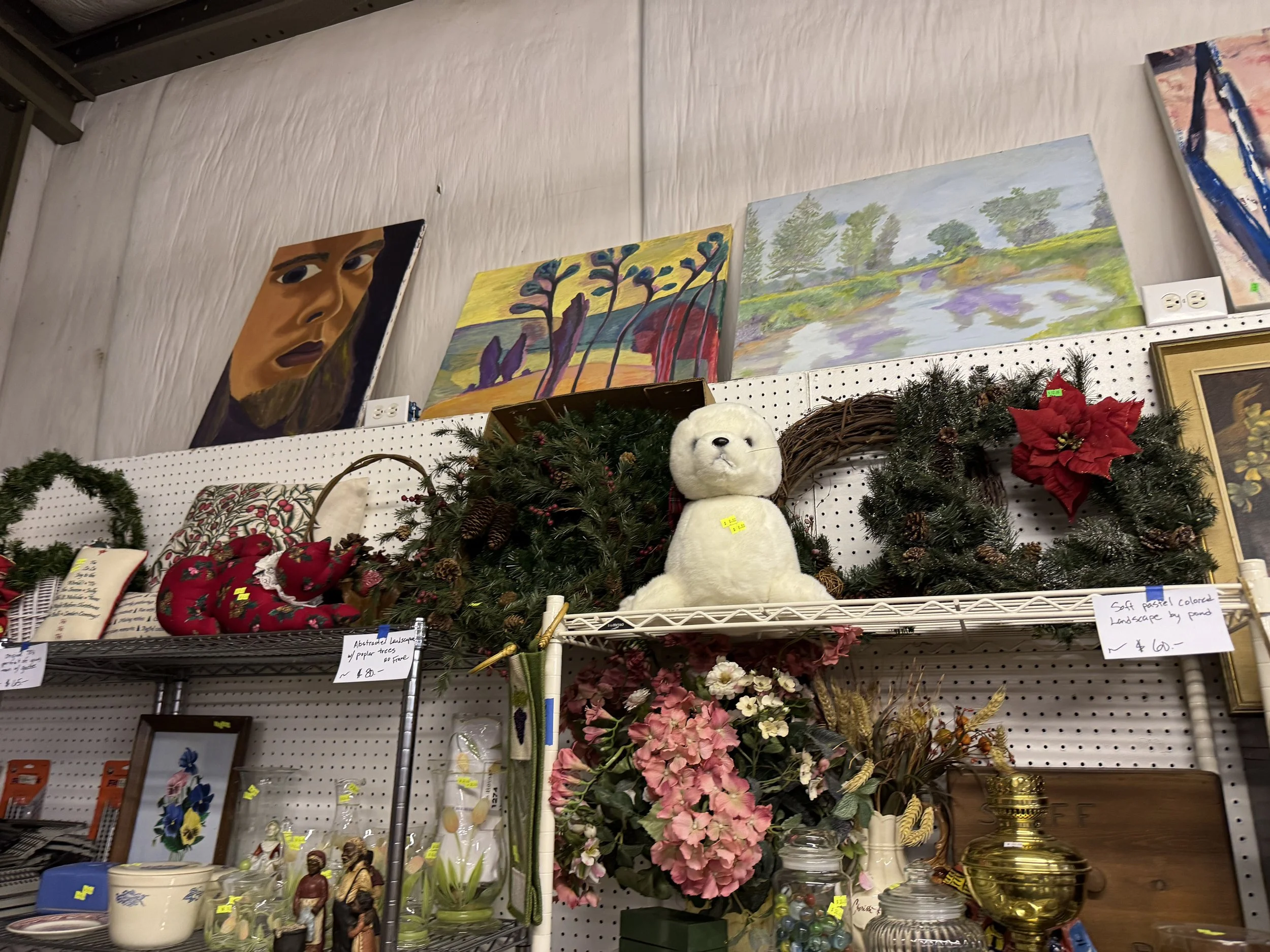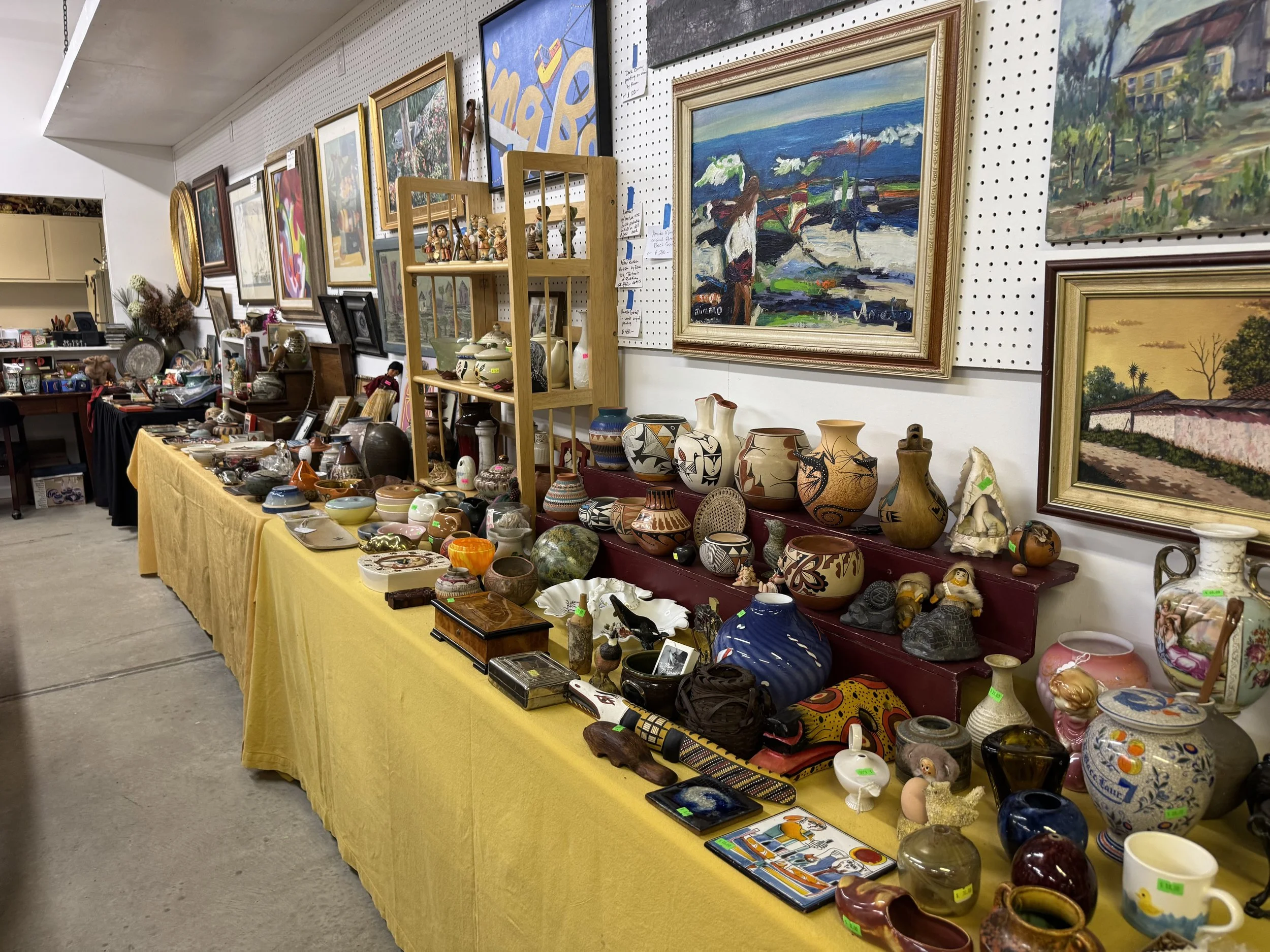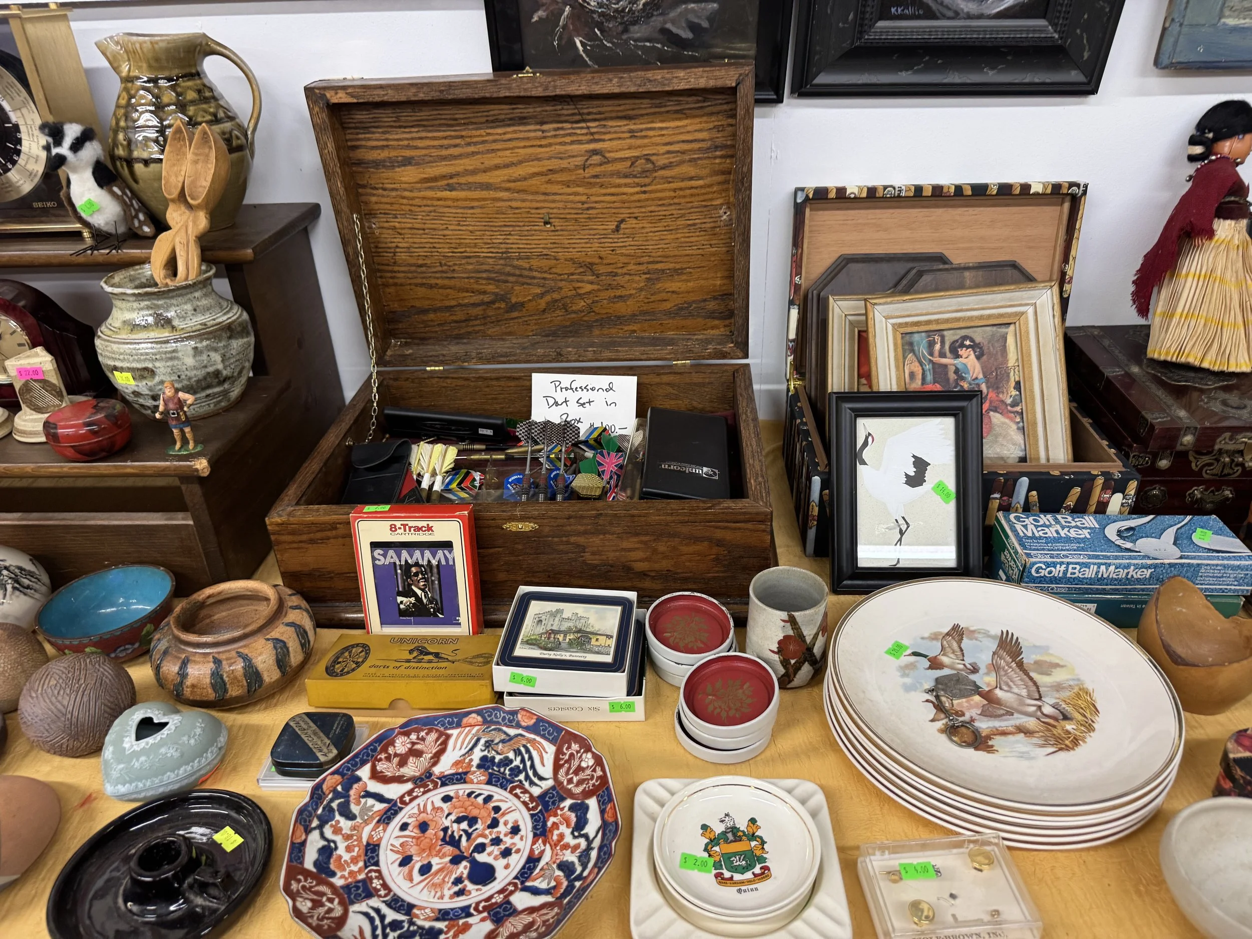Misc: Original art -listed artists, quality prints, plastic duck decoys, books, Christmas items, Madam Alexander doll collection, Hummel collection, pottery collection, First Nations pottery, women's clothing and shoes, etc