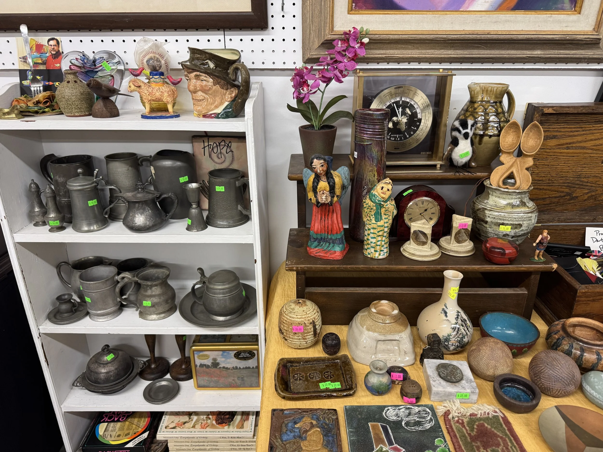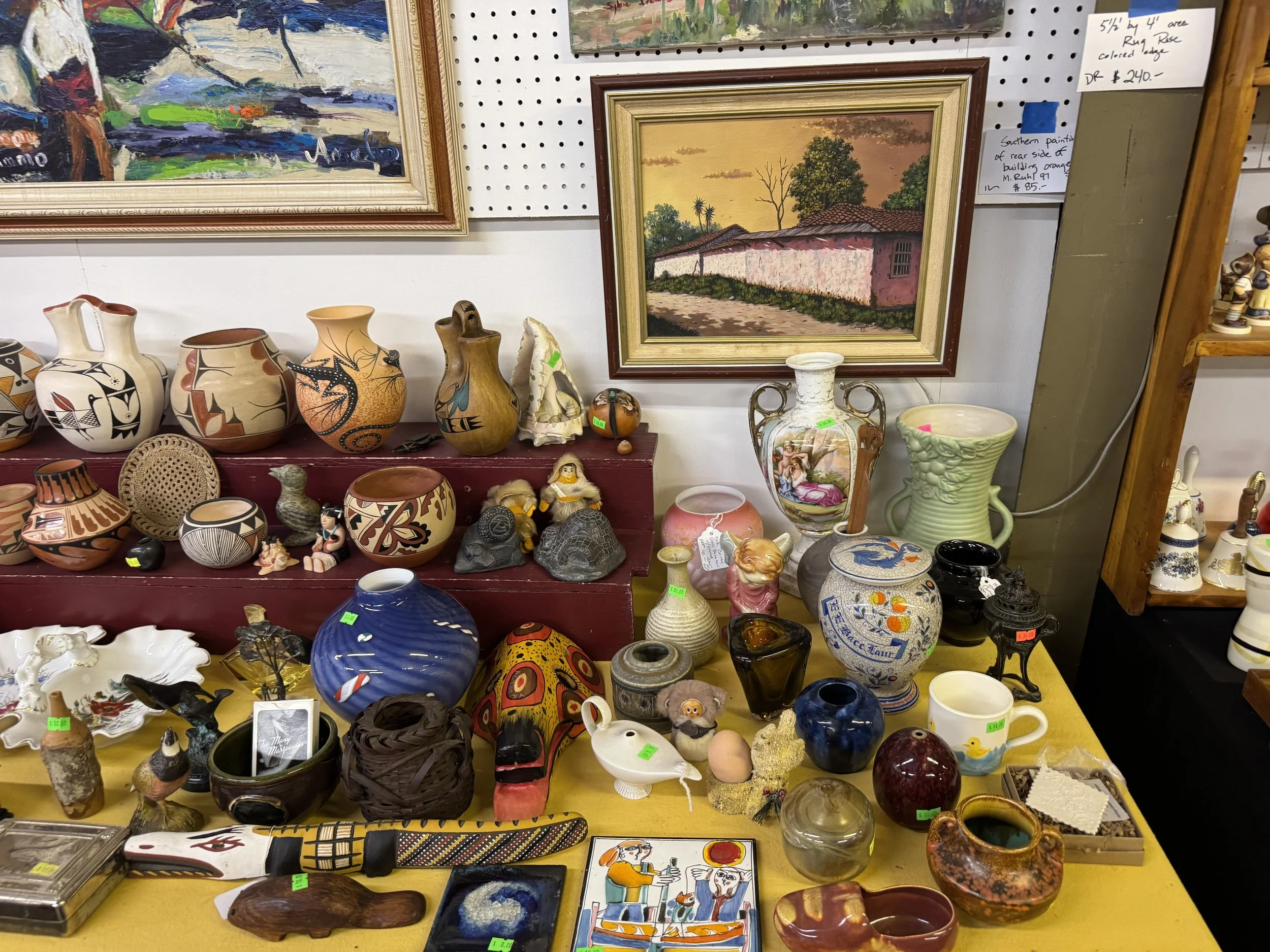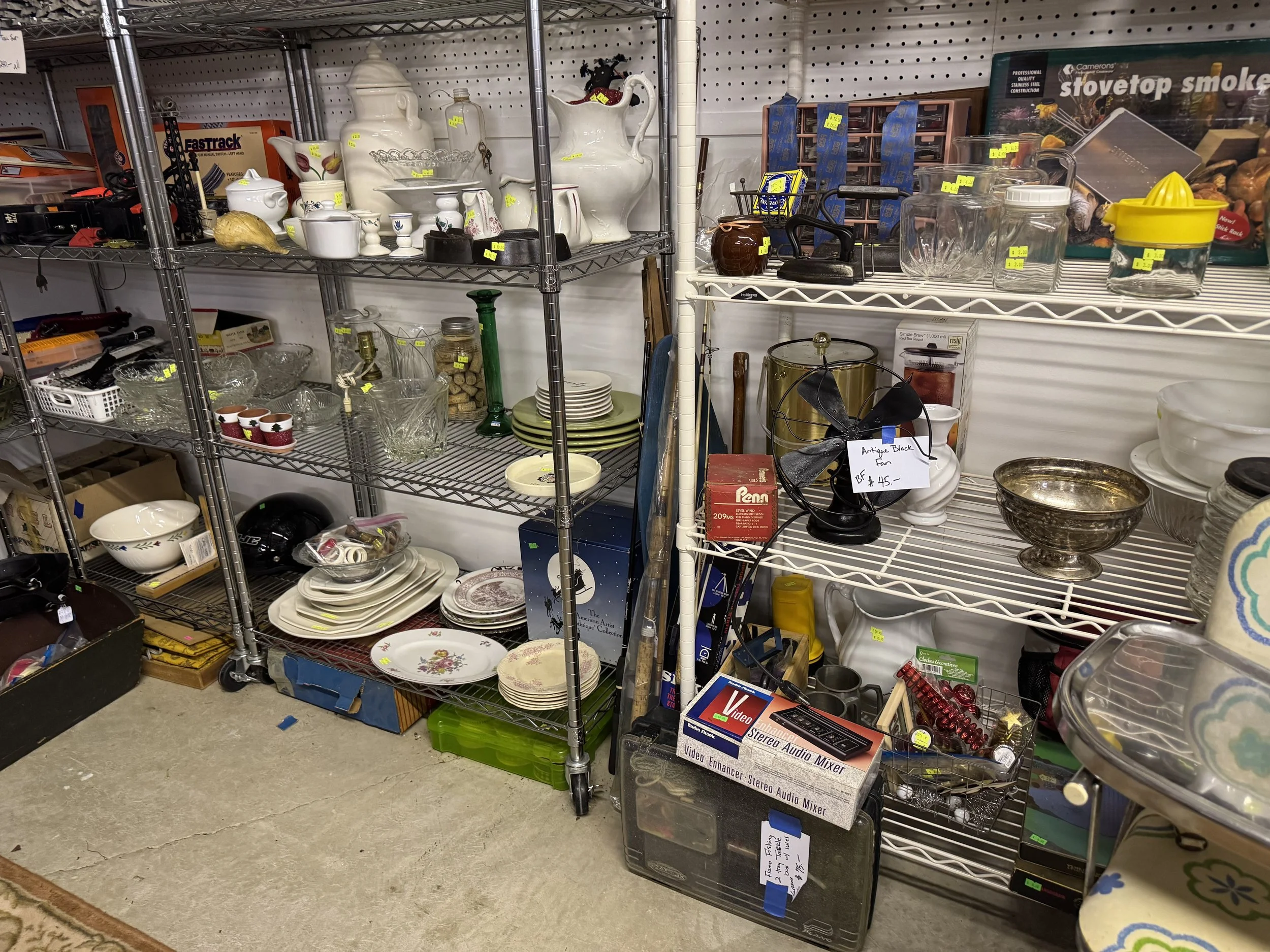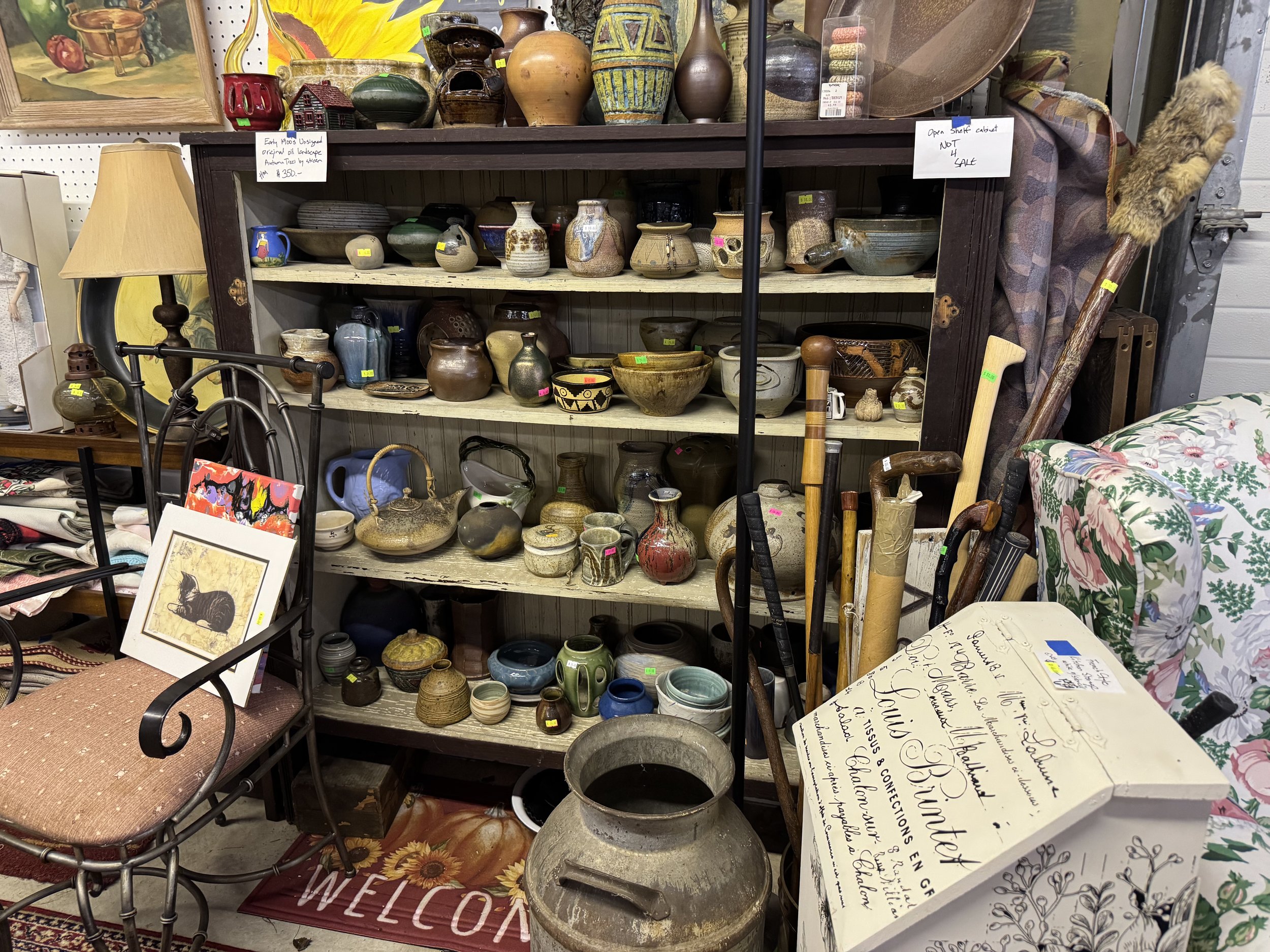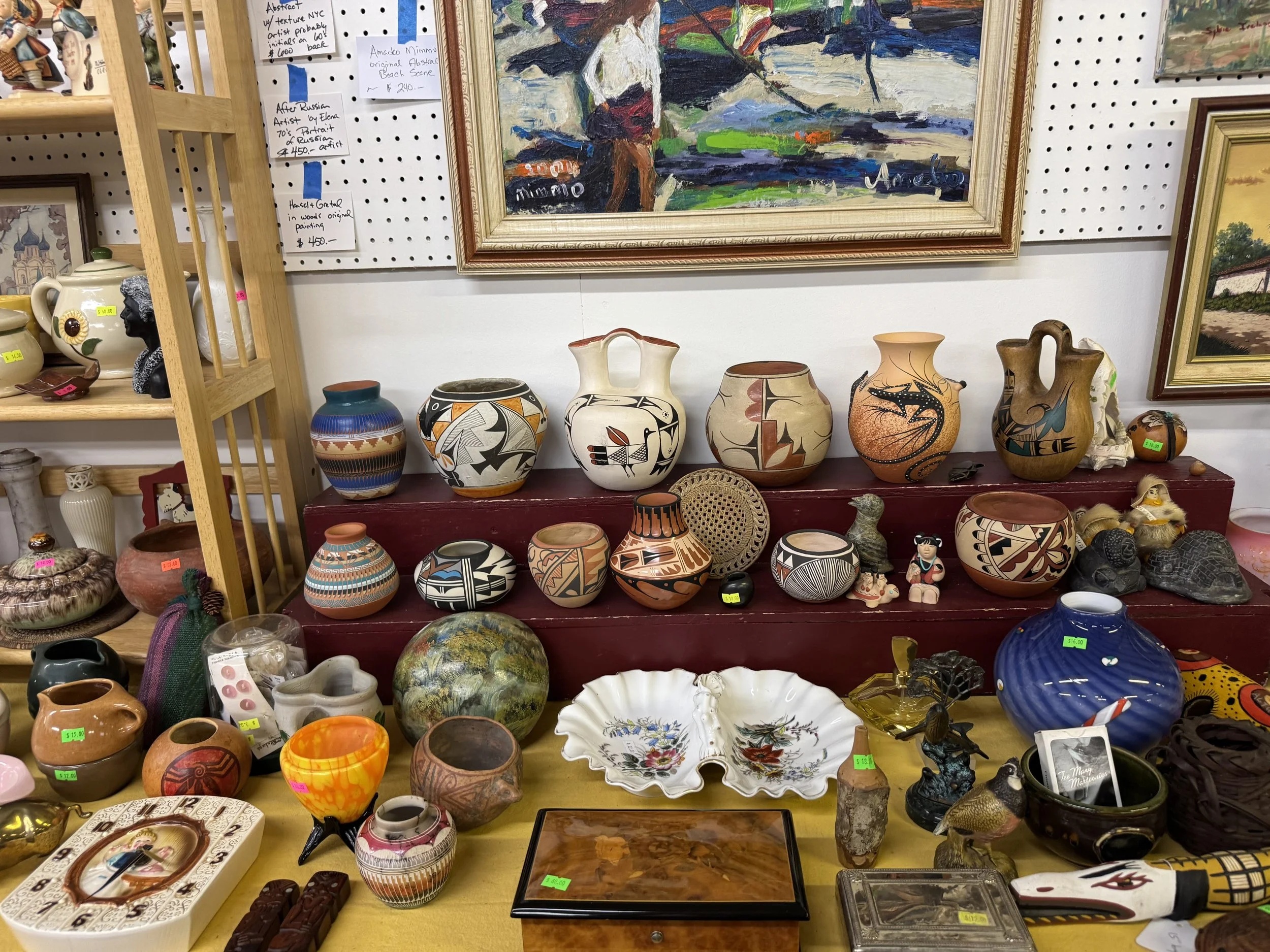 Misc: Original art -listed artists, quality prints, plastic duck decoys, books, Christmas items, Madam Alexander doll collection, Hummel collection, pottery collection, First Nations pottery, women's clothing and shoes, etc