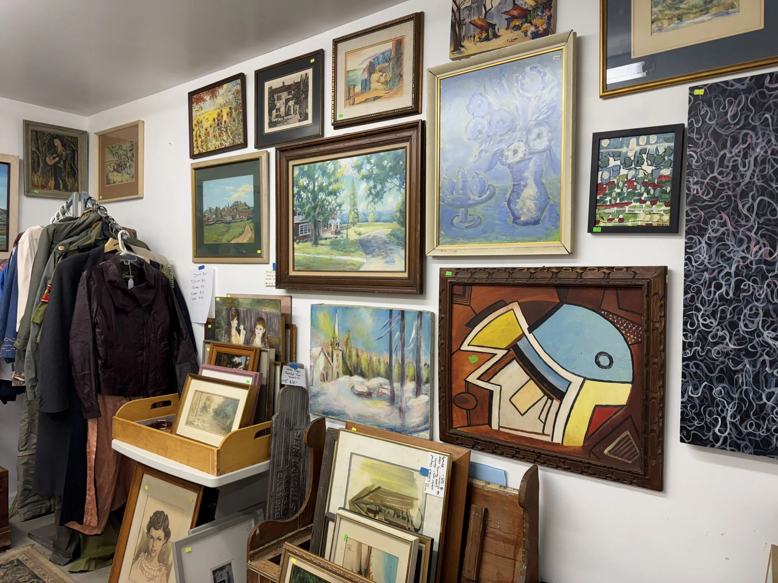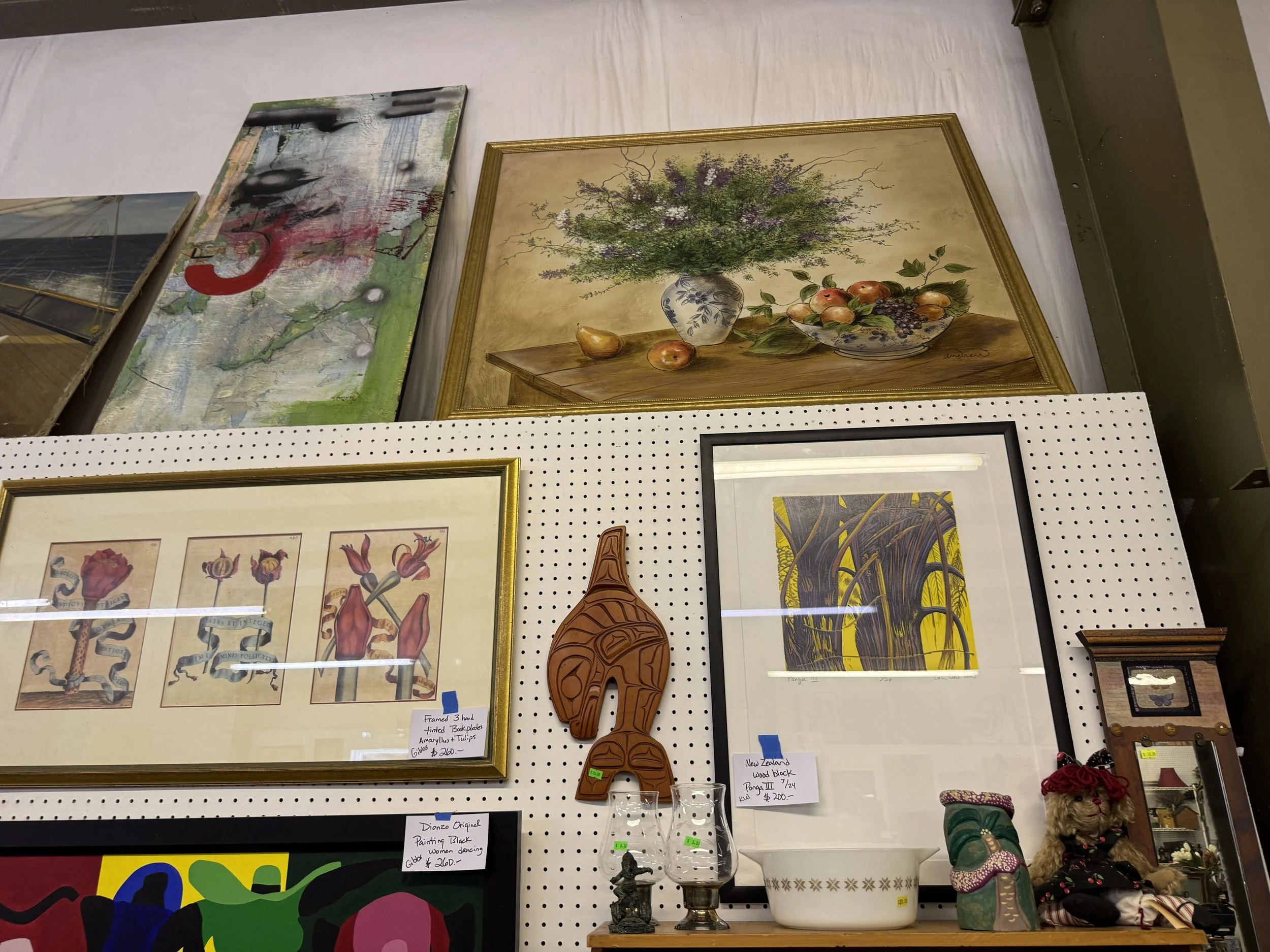 Misc: Original art, quality prints, decorator items, folk art, pottery collections, dads, some books, clothing women's size 10 shoes, Madam Alexander dolls, etc