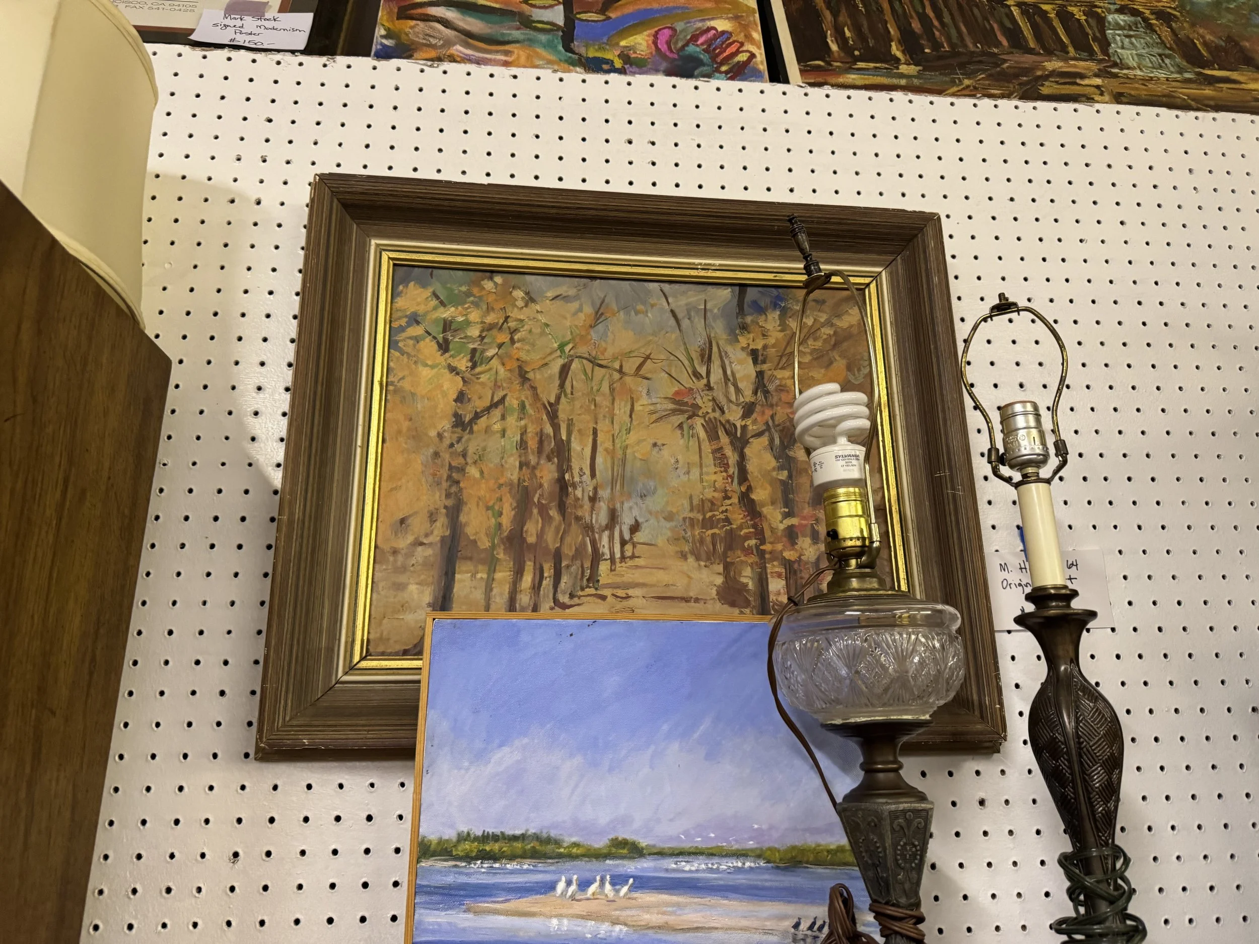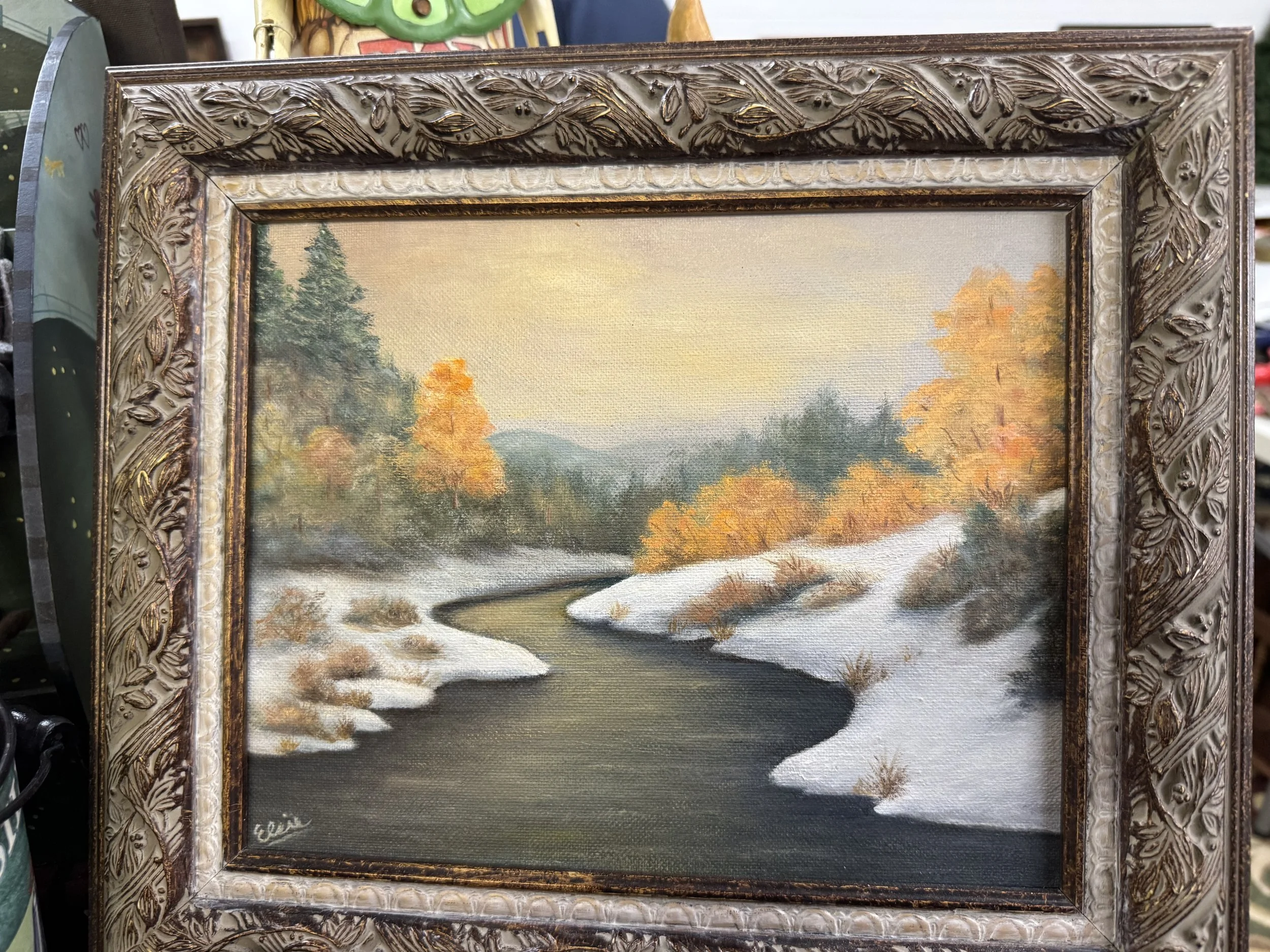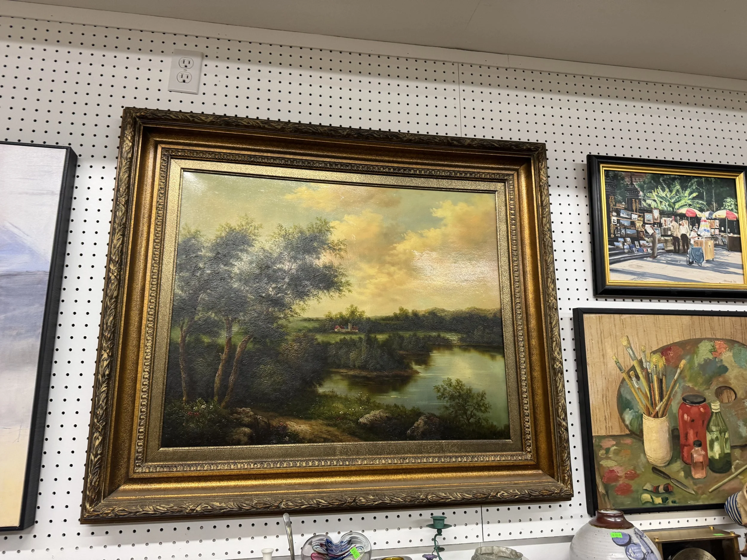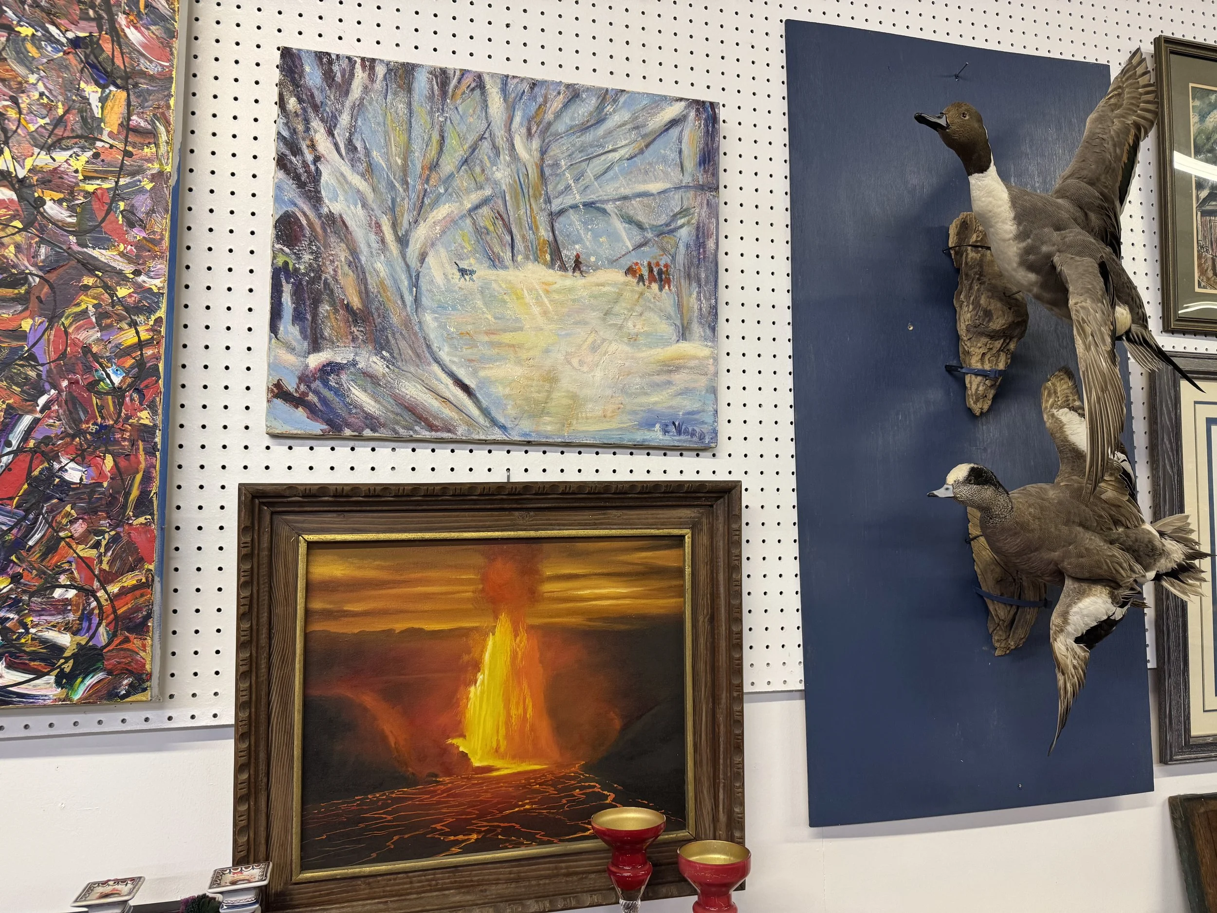 Misc: Original art, many listed artists, quality prints, duck decoys, men's waders, fly fishing poles, outdoor items, decorator items, Christmas items, vintage Christmas items, area rugs, lamps, vases, art pottery, etc