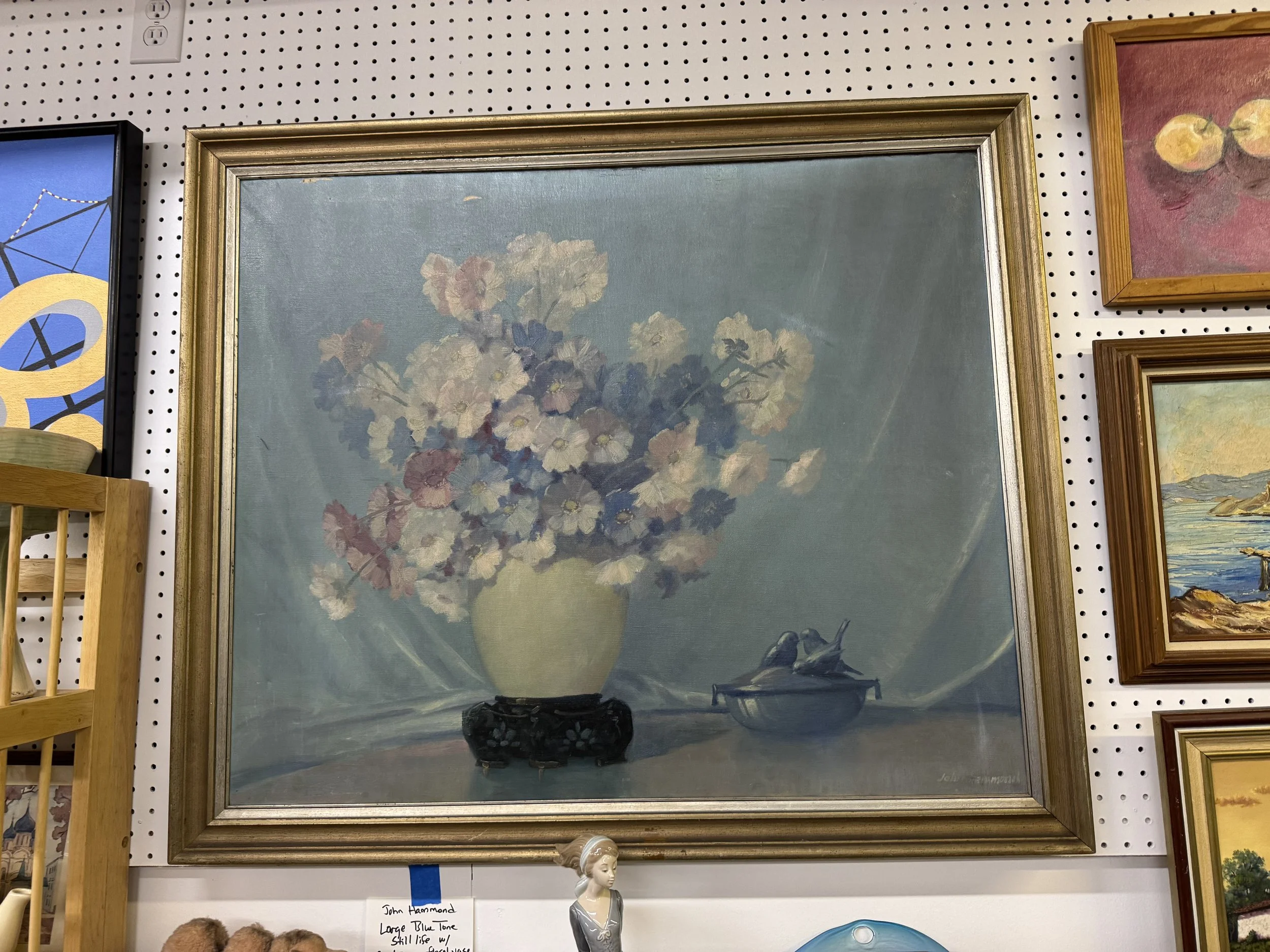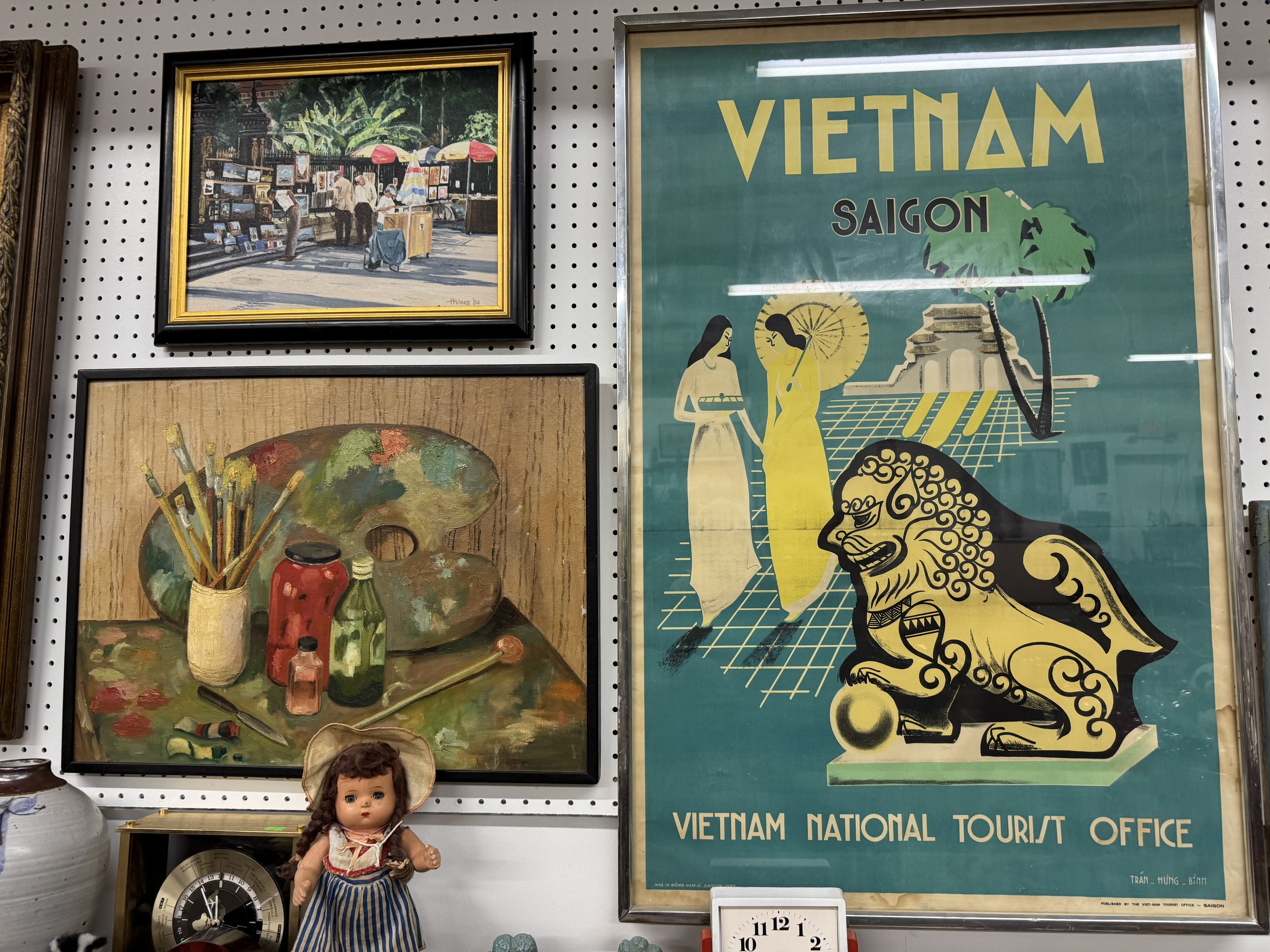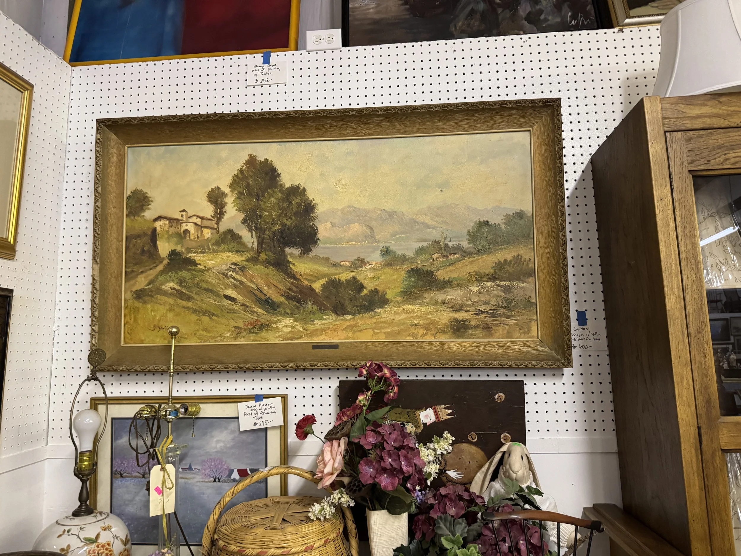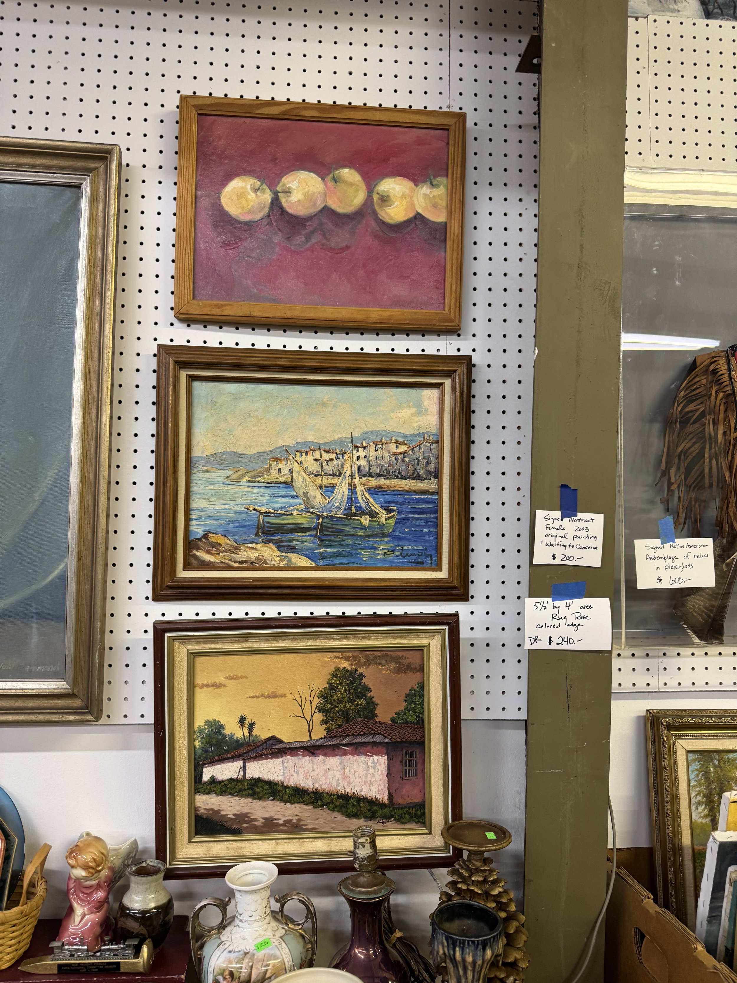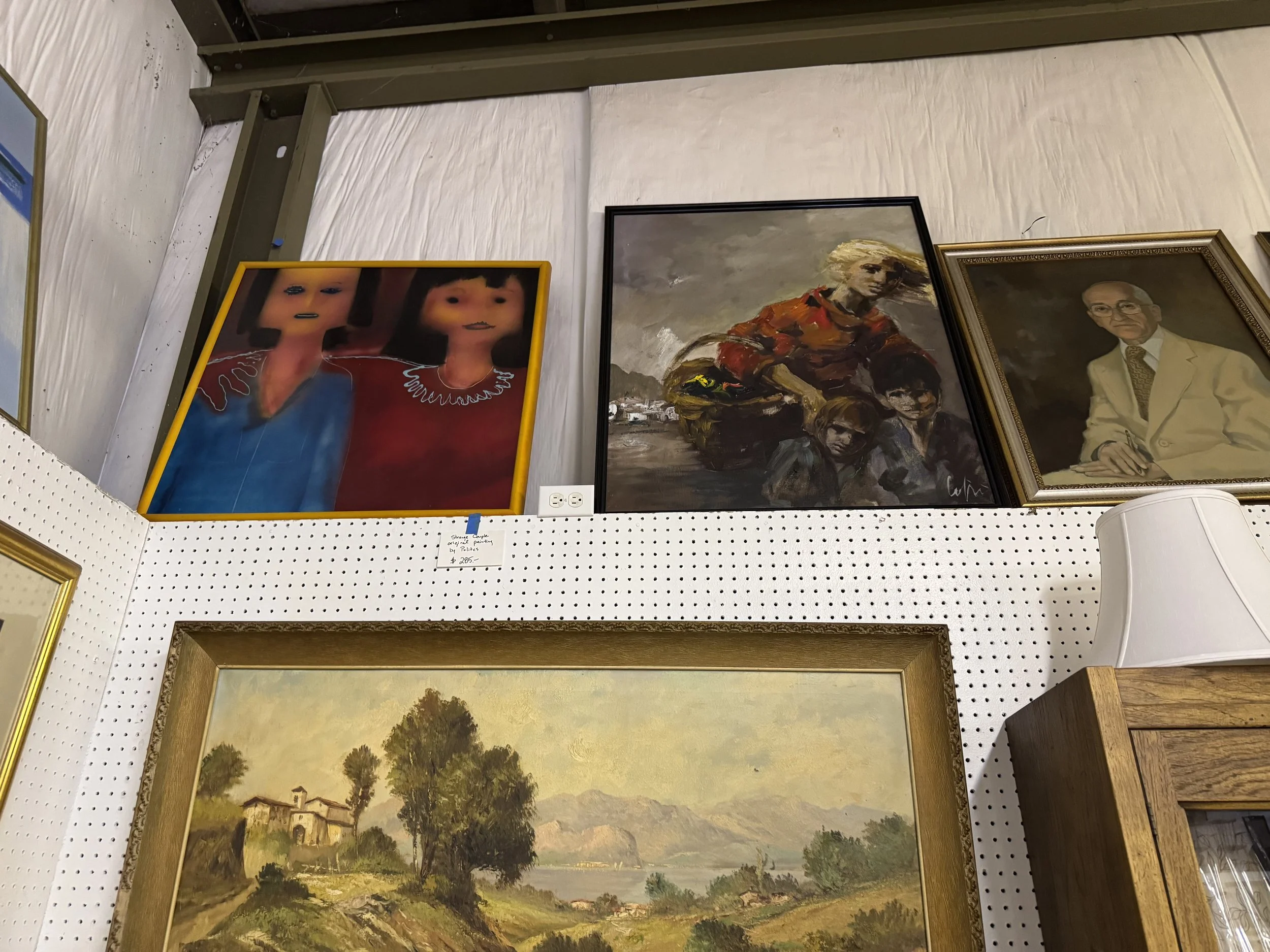 Misc: Original art, many listed artists, quality prints, duck decoys, men's waders, fly fishing poles, outdoor items, decorator items, Christmas items, vintage Christmas items, area rugs, lamps, vases, art pottery, etc