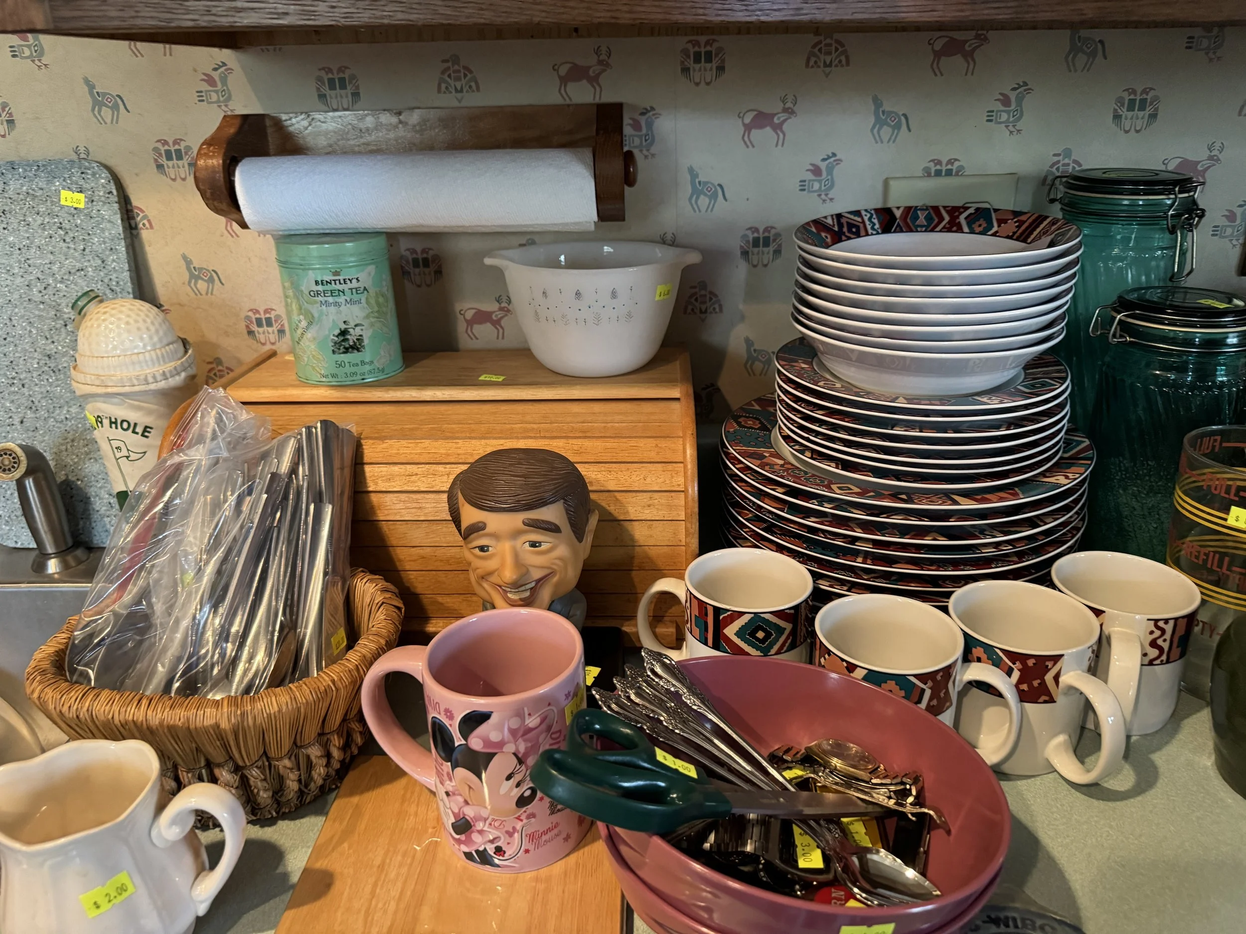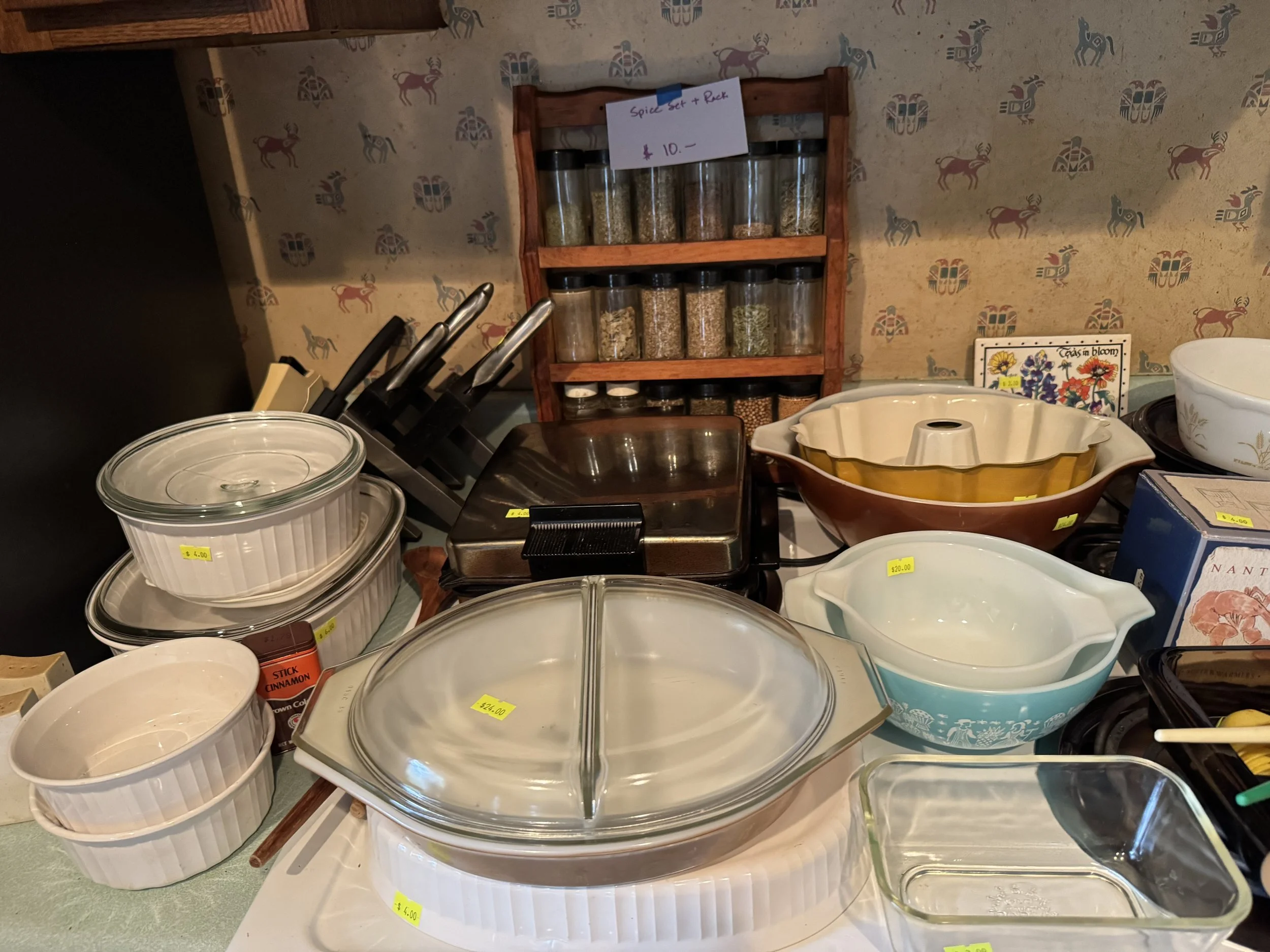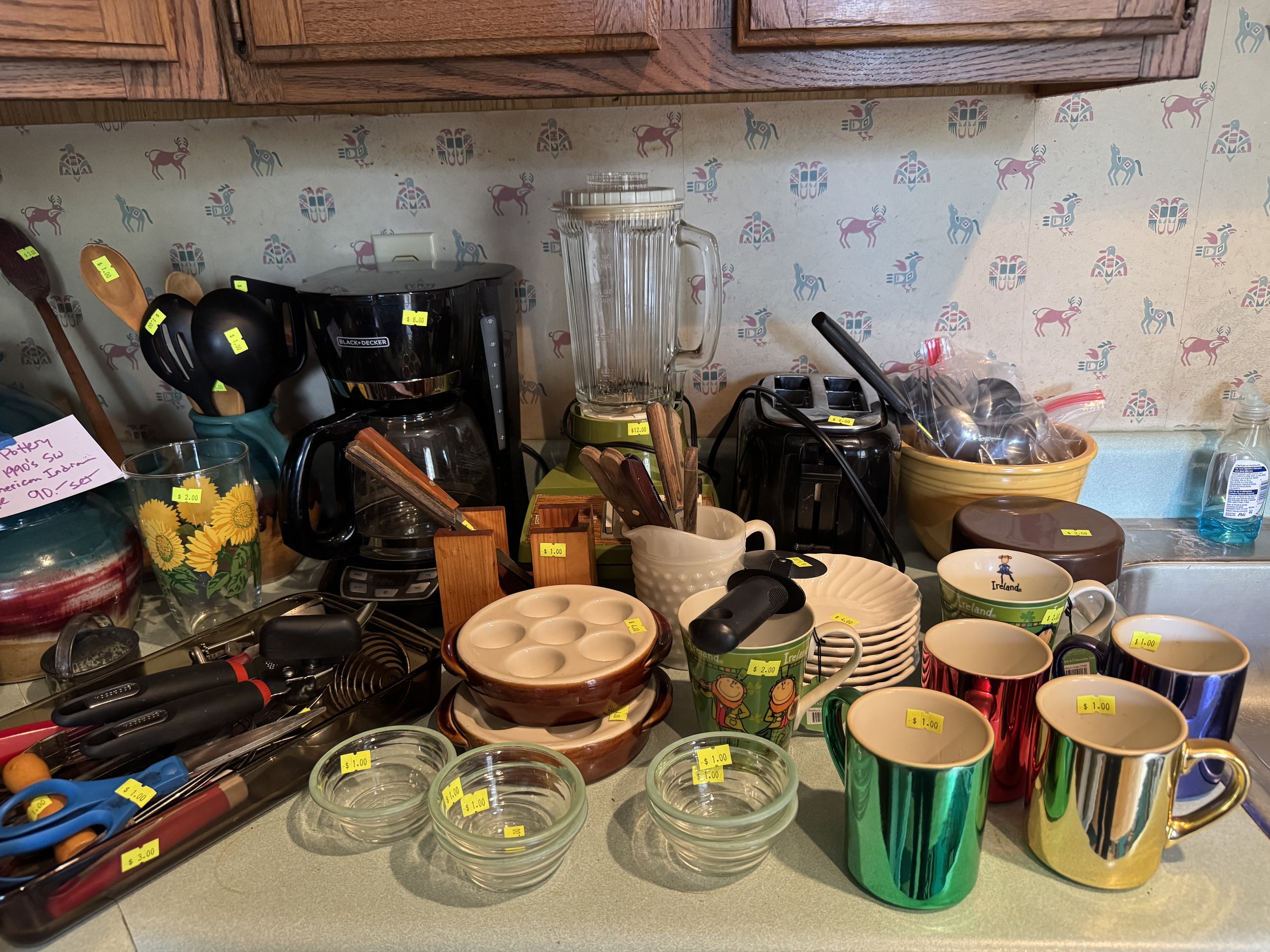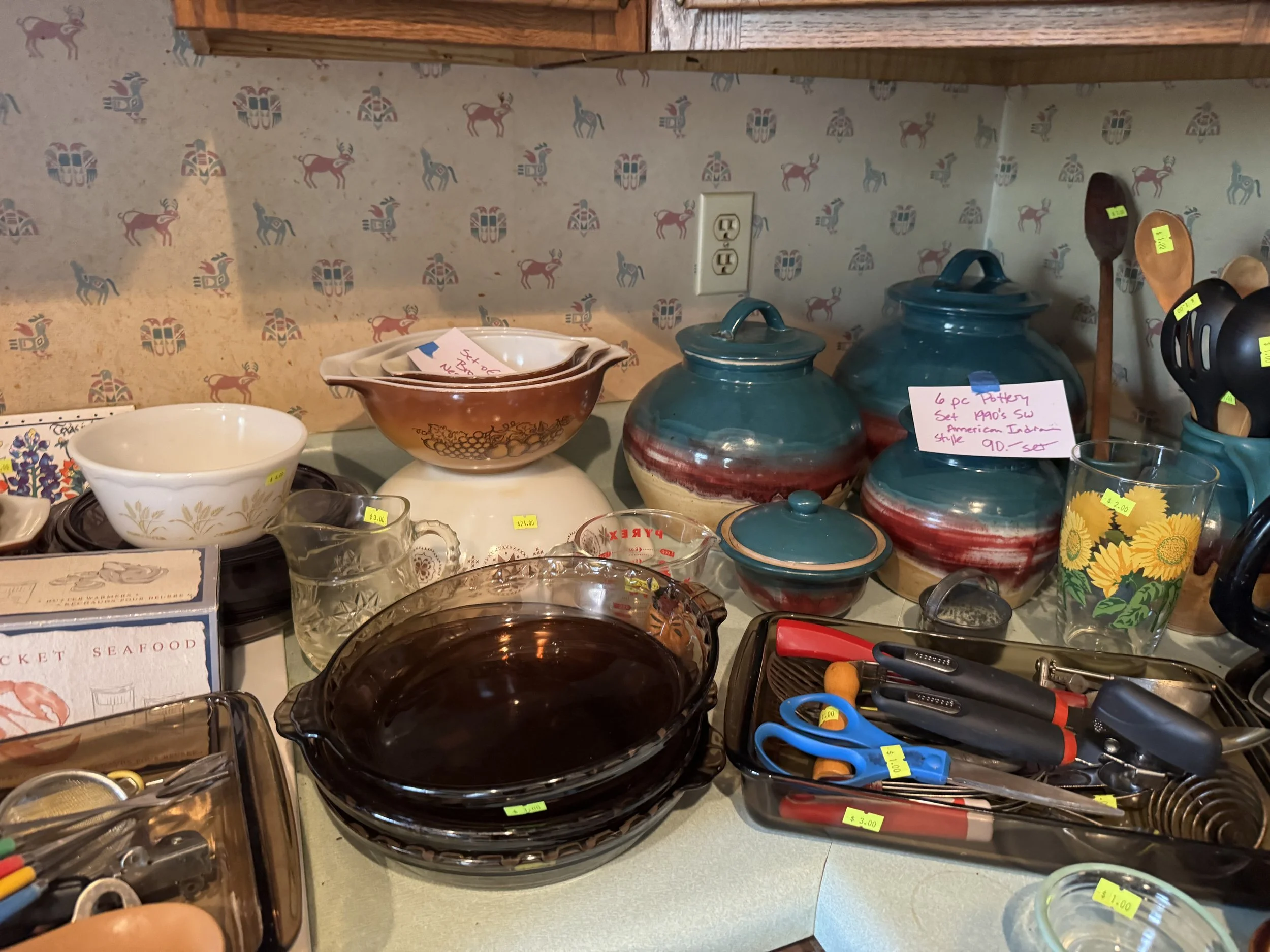Kitchen/Glassware: Pyrex, everyday dishes, barware, pots/pans, serving pieces, canisters, small kitchen appliances, etc