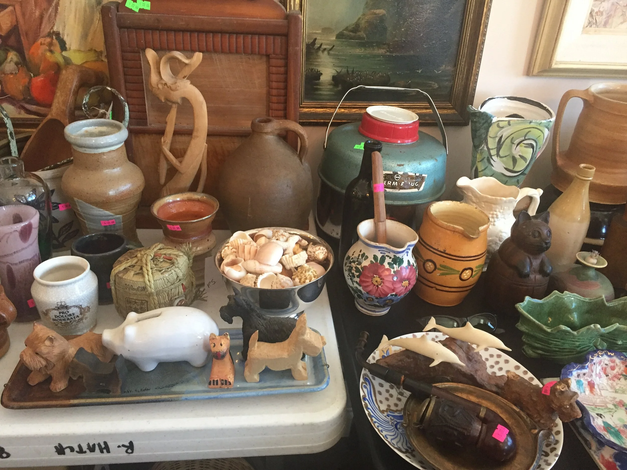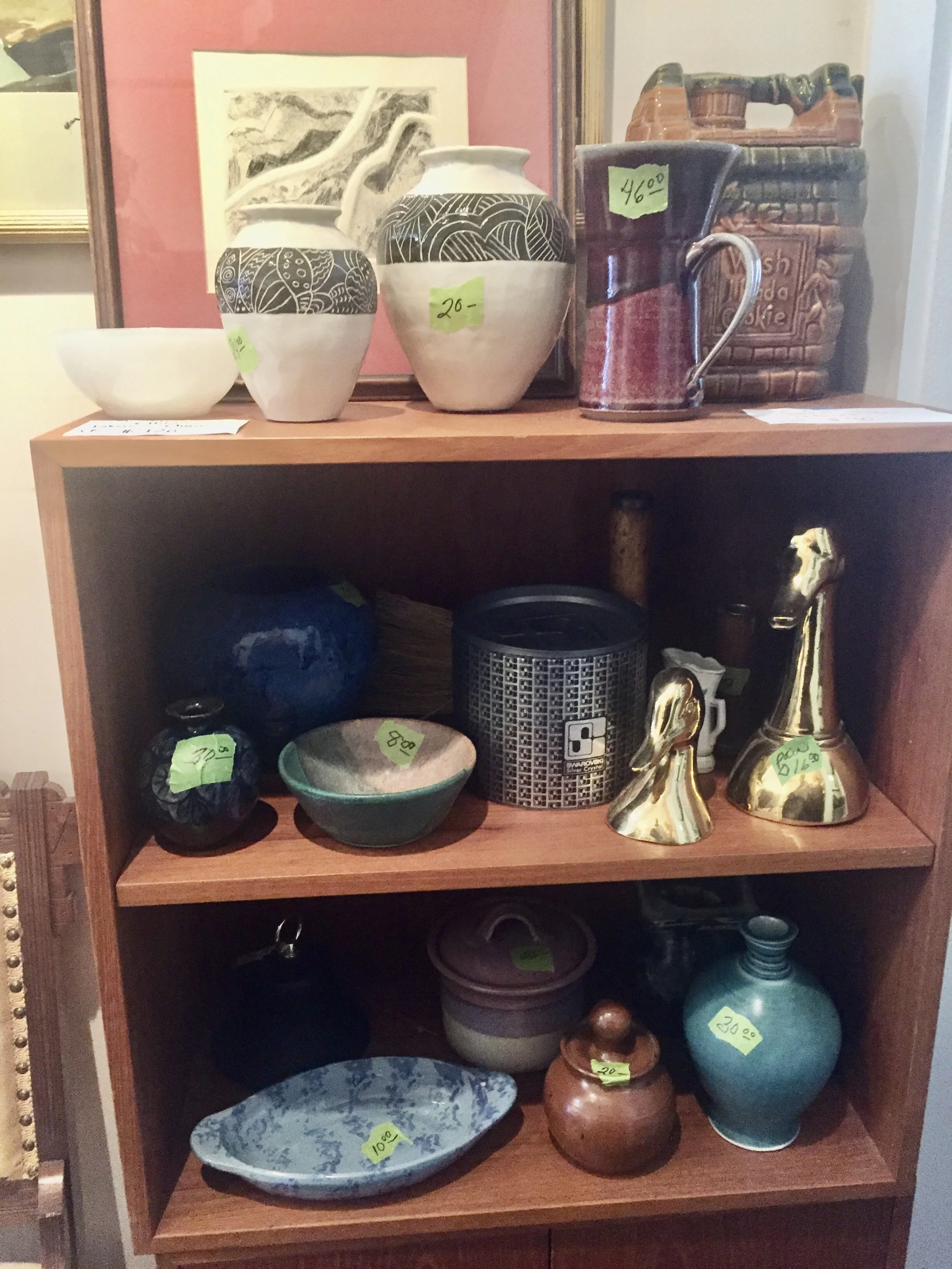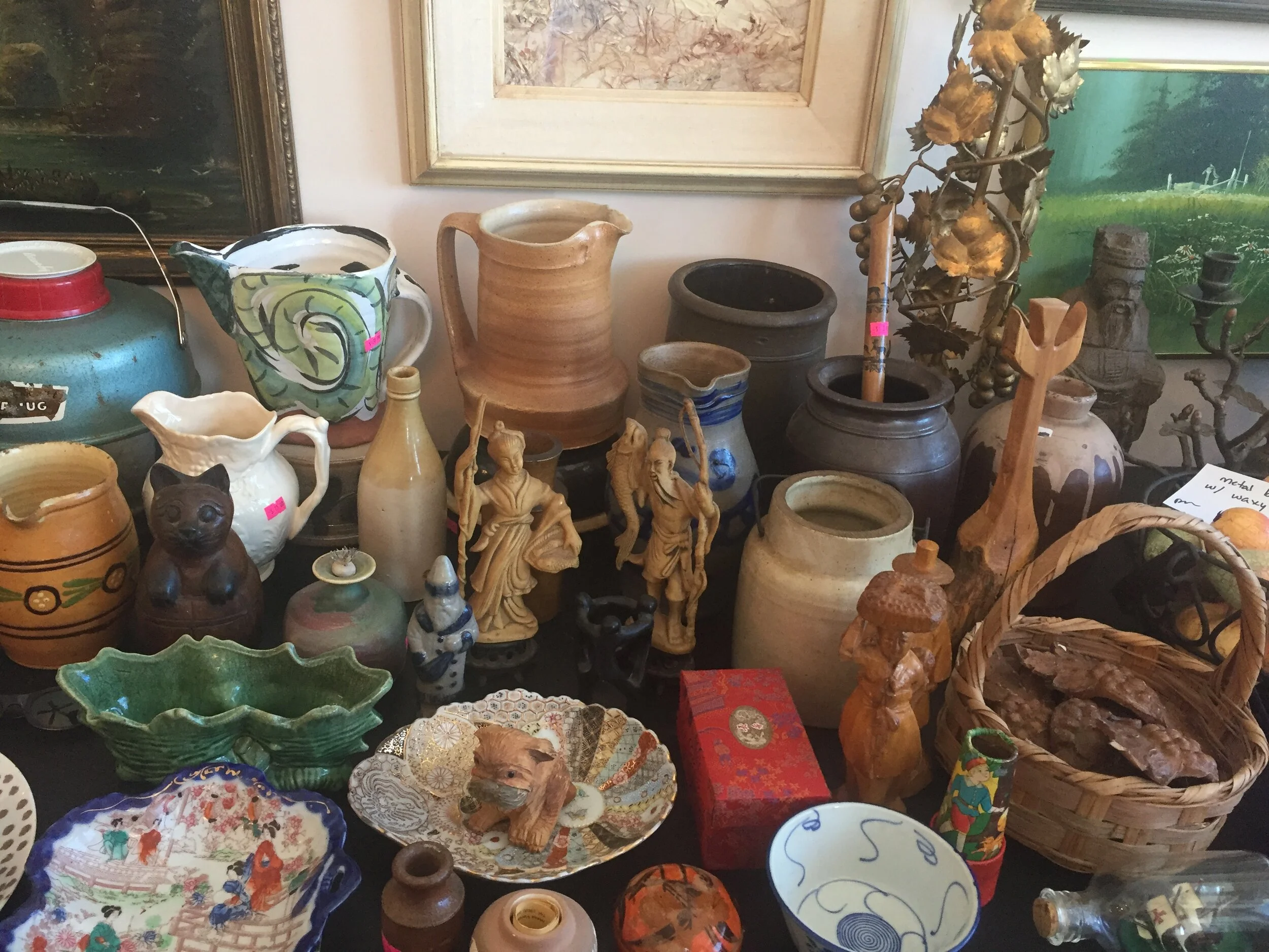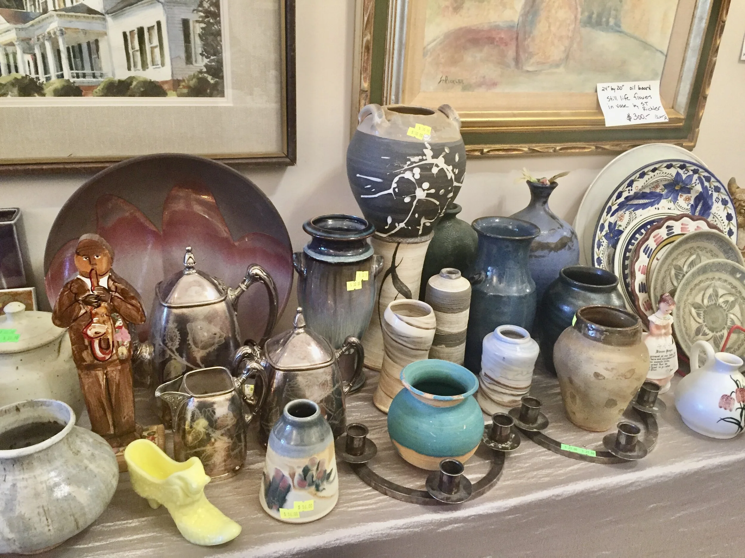 Misc: Large collection of NC pottery, crocks, face jugs, vintage games, costume jewelry, baskets, paperweights, original art: oils, acrylic, Japanese block prints, several listed artists, etc