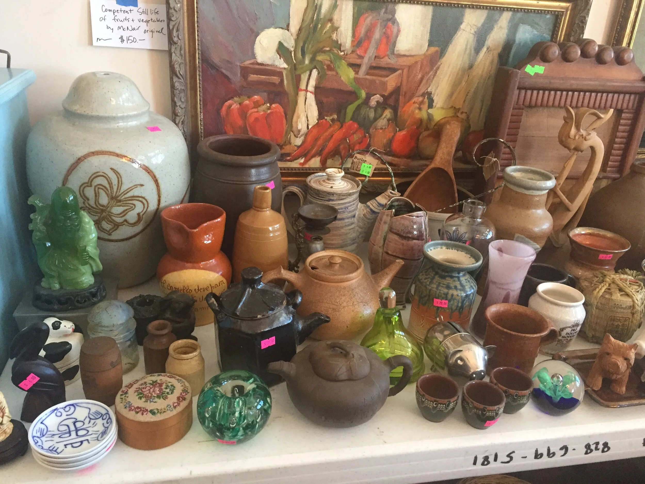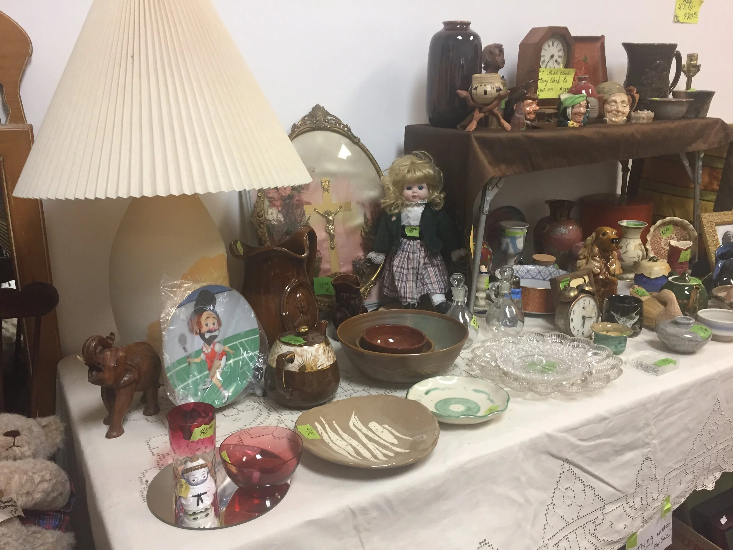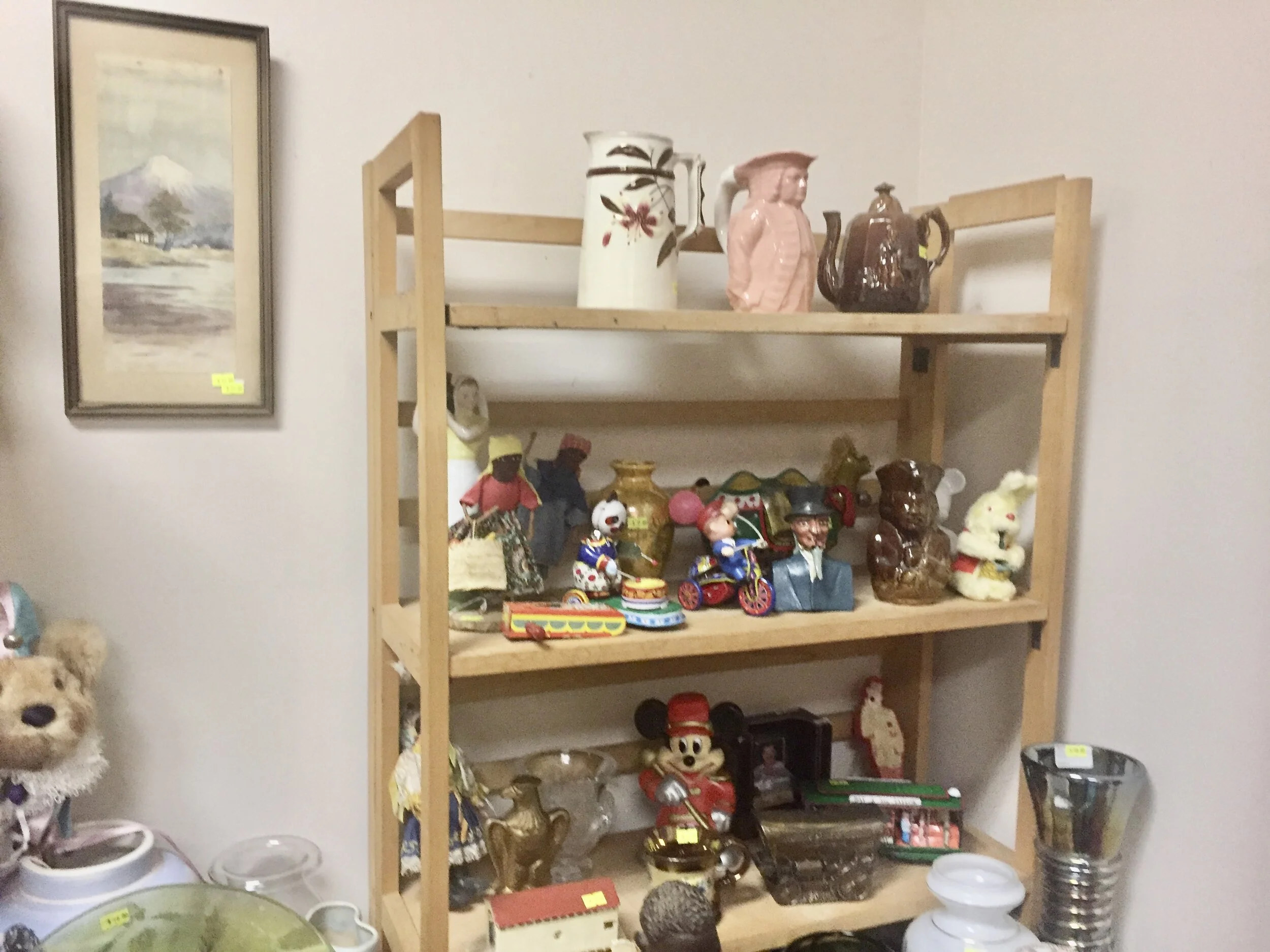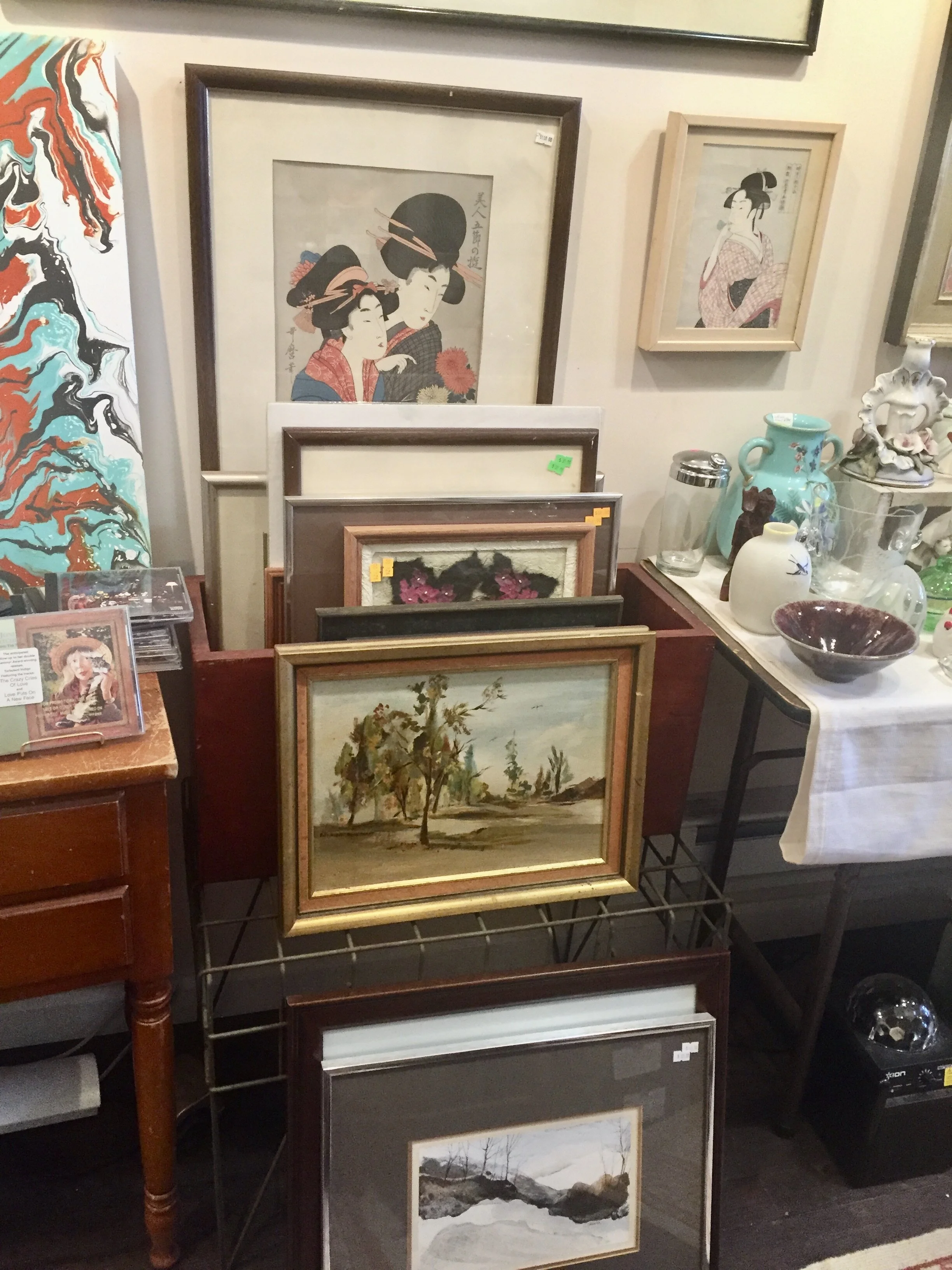 Misc: Large collection of NC pottery, crocks, face jugs, vintage games, costume jewelry, baskets, paperweights, original art: oils, acrylic, Japanese block prints, several listed artists, etc