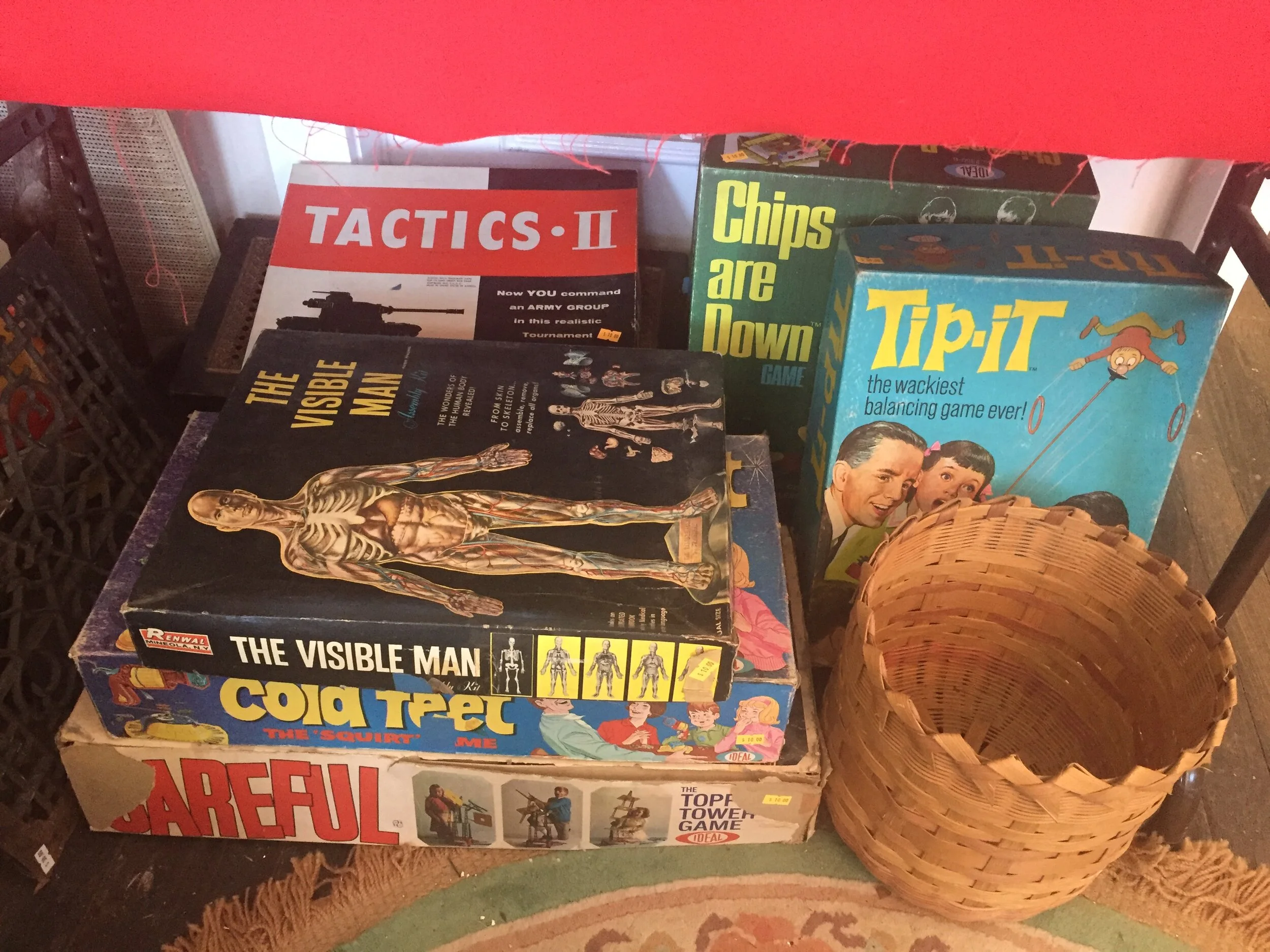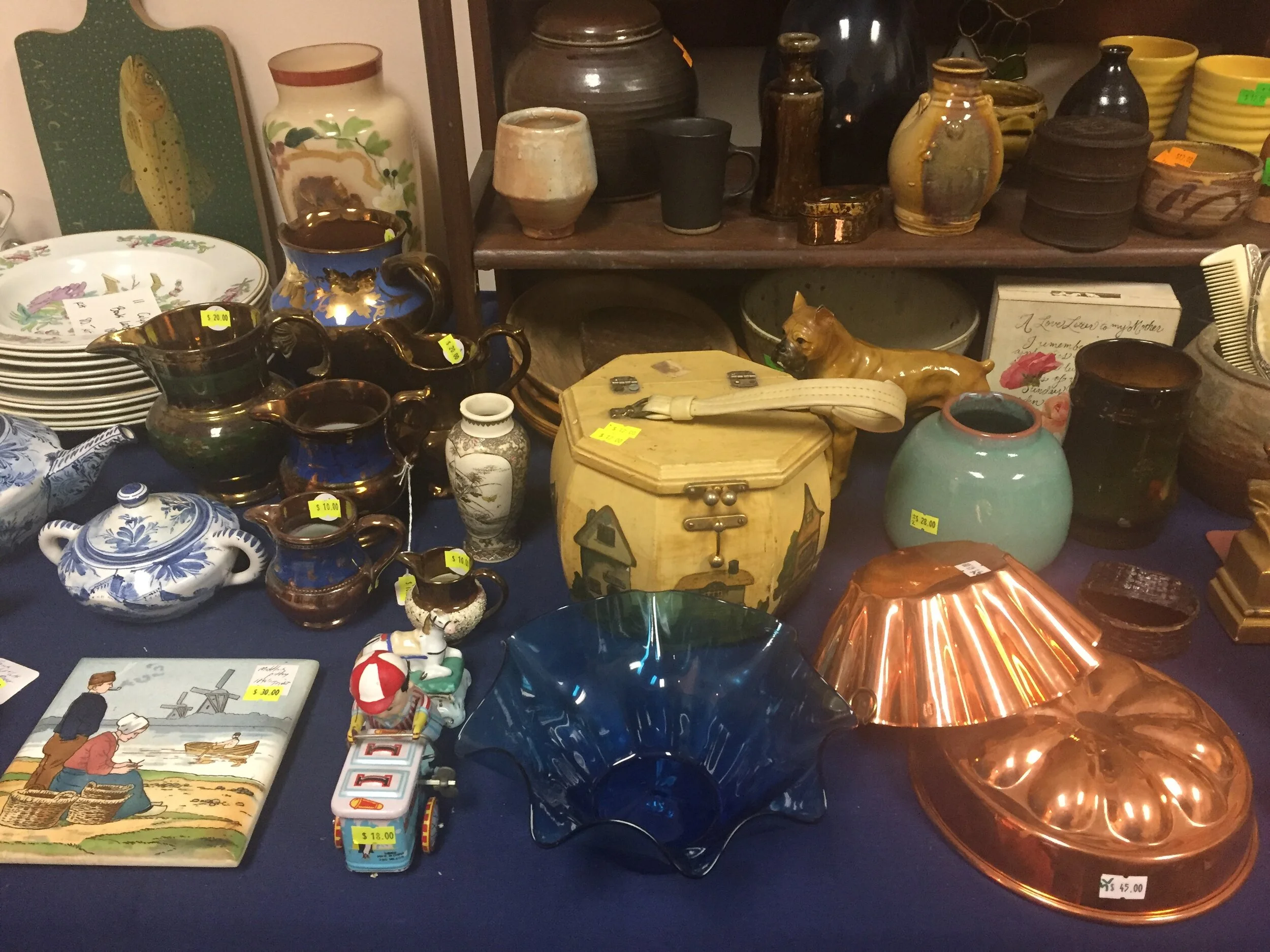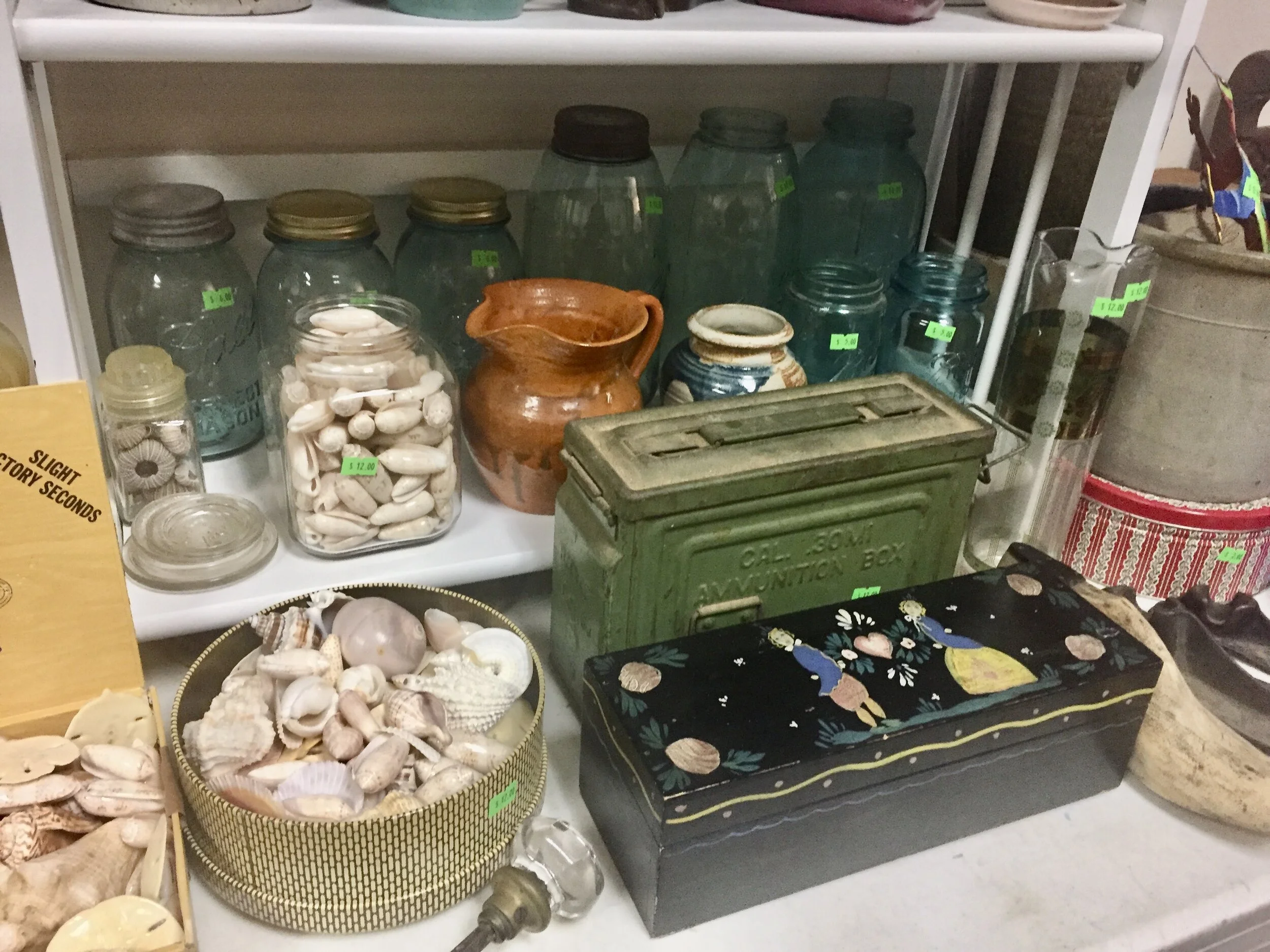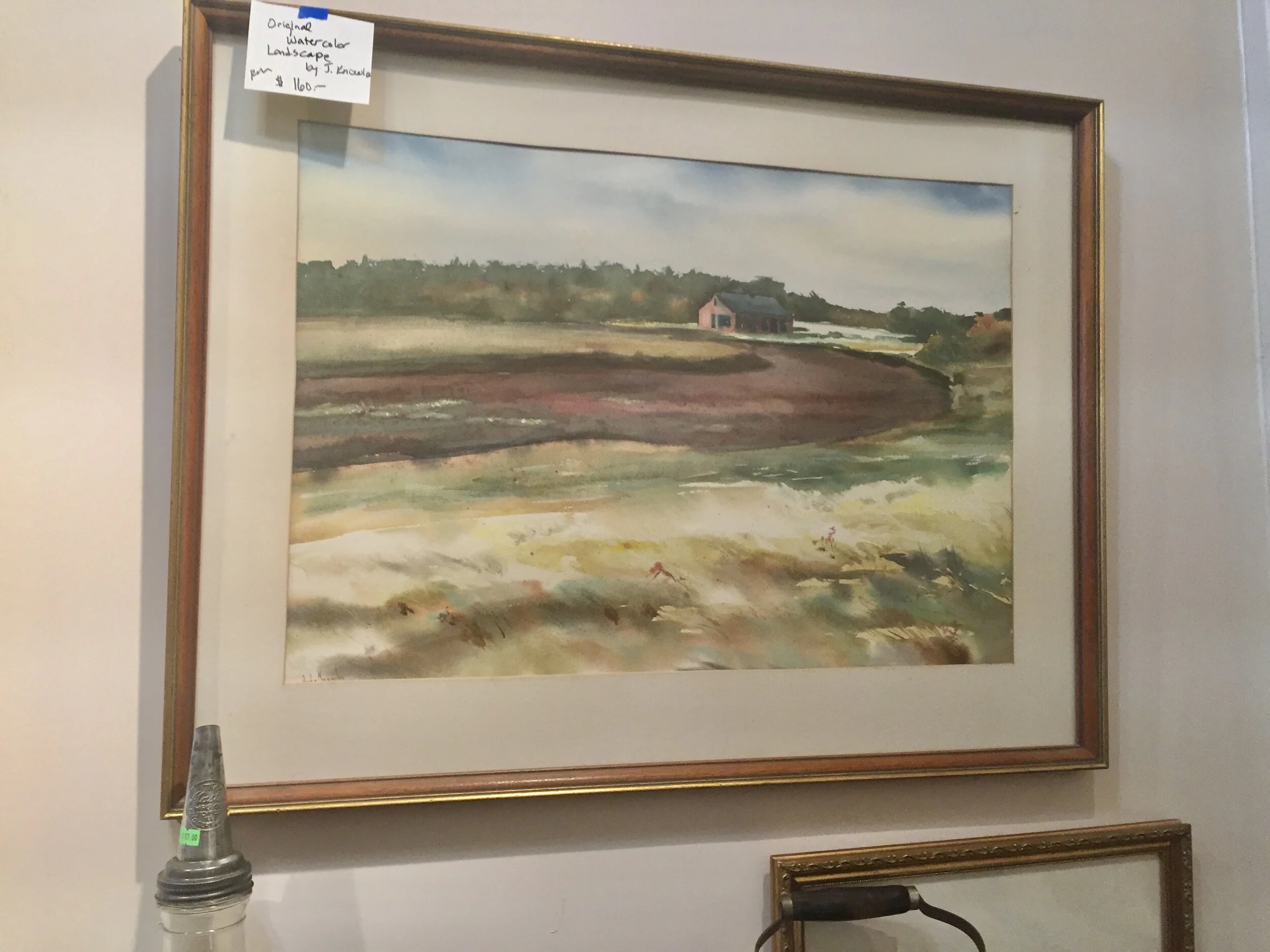 Misc: Large collection of NC pottery, crocks, face jugs, vintage games, costume jewelry, baskets, paperweights, original art: oils, acrylic, Japanese block prints, several listed artists, etc