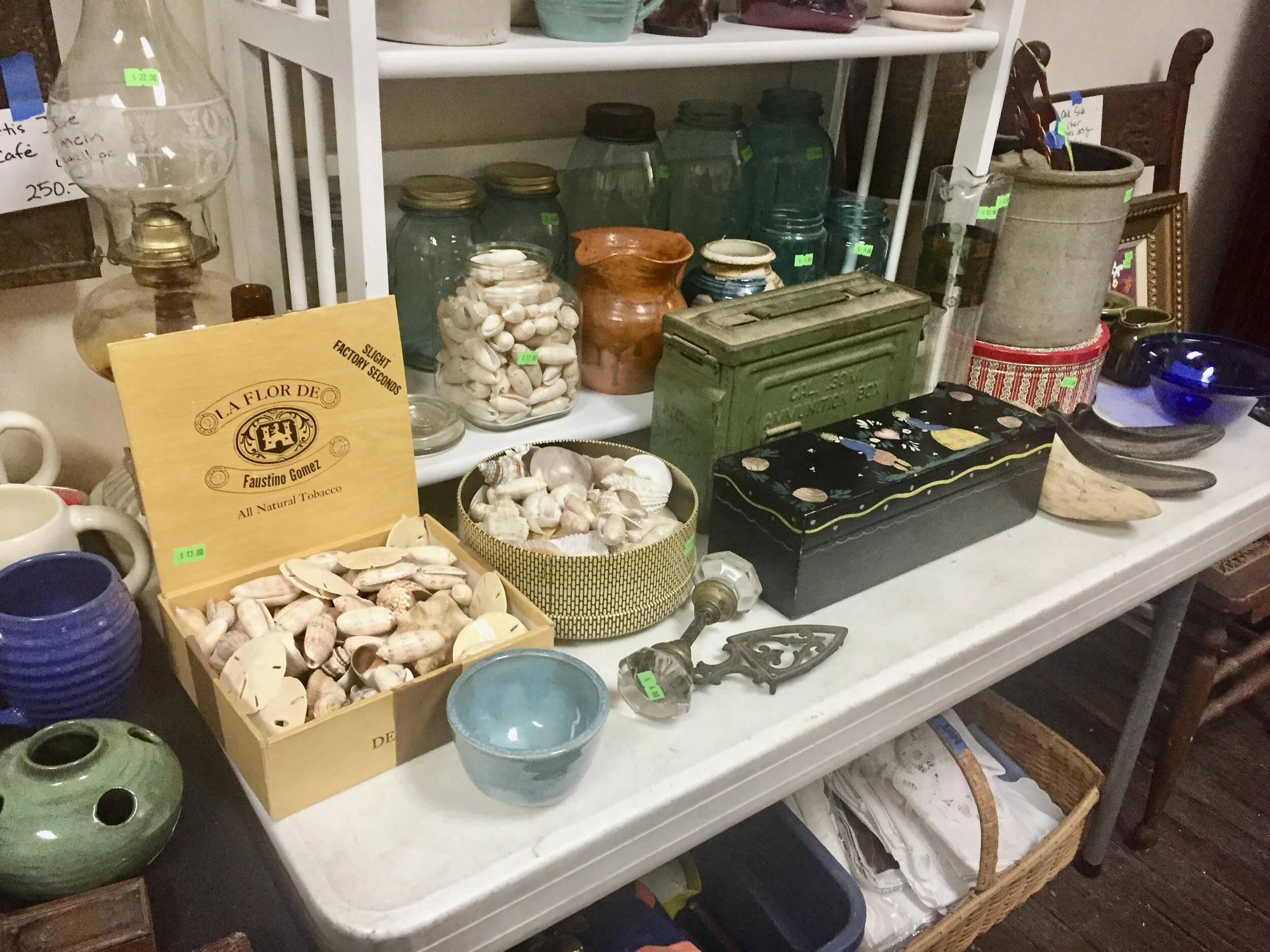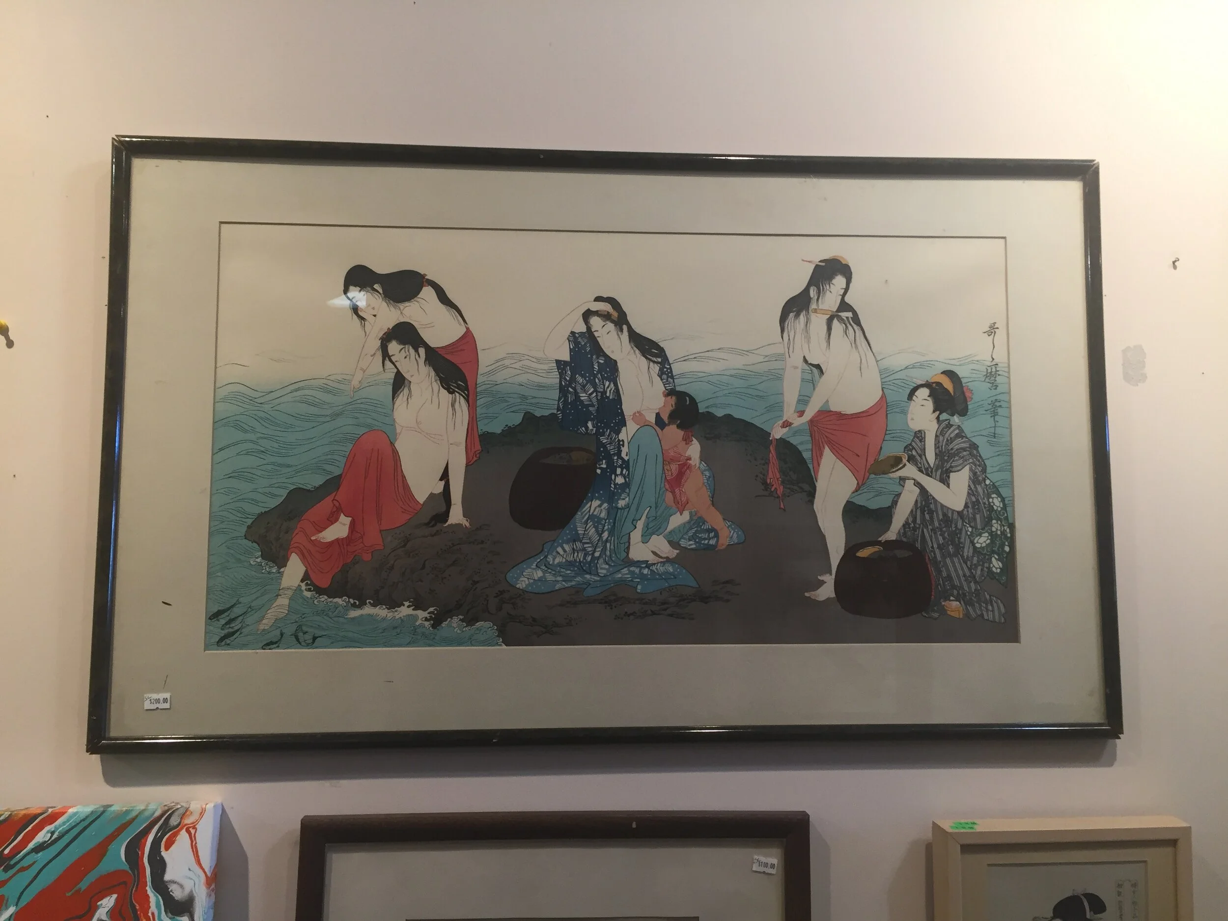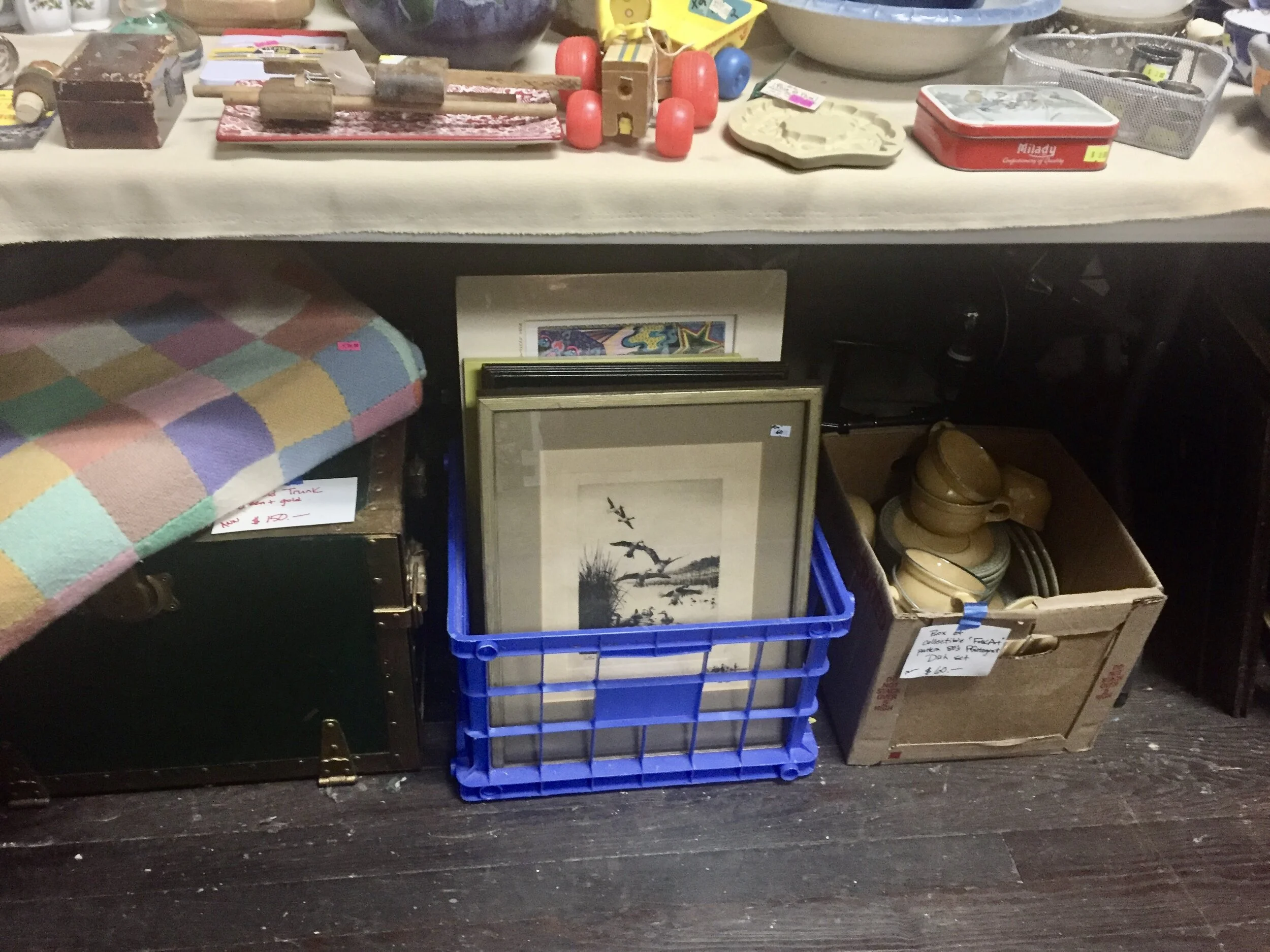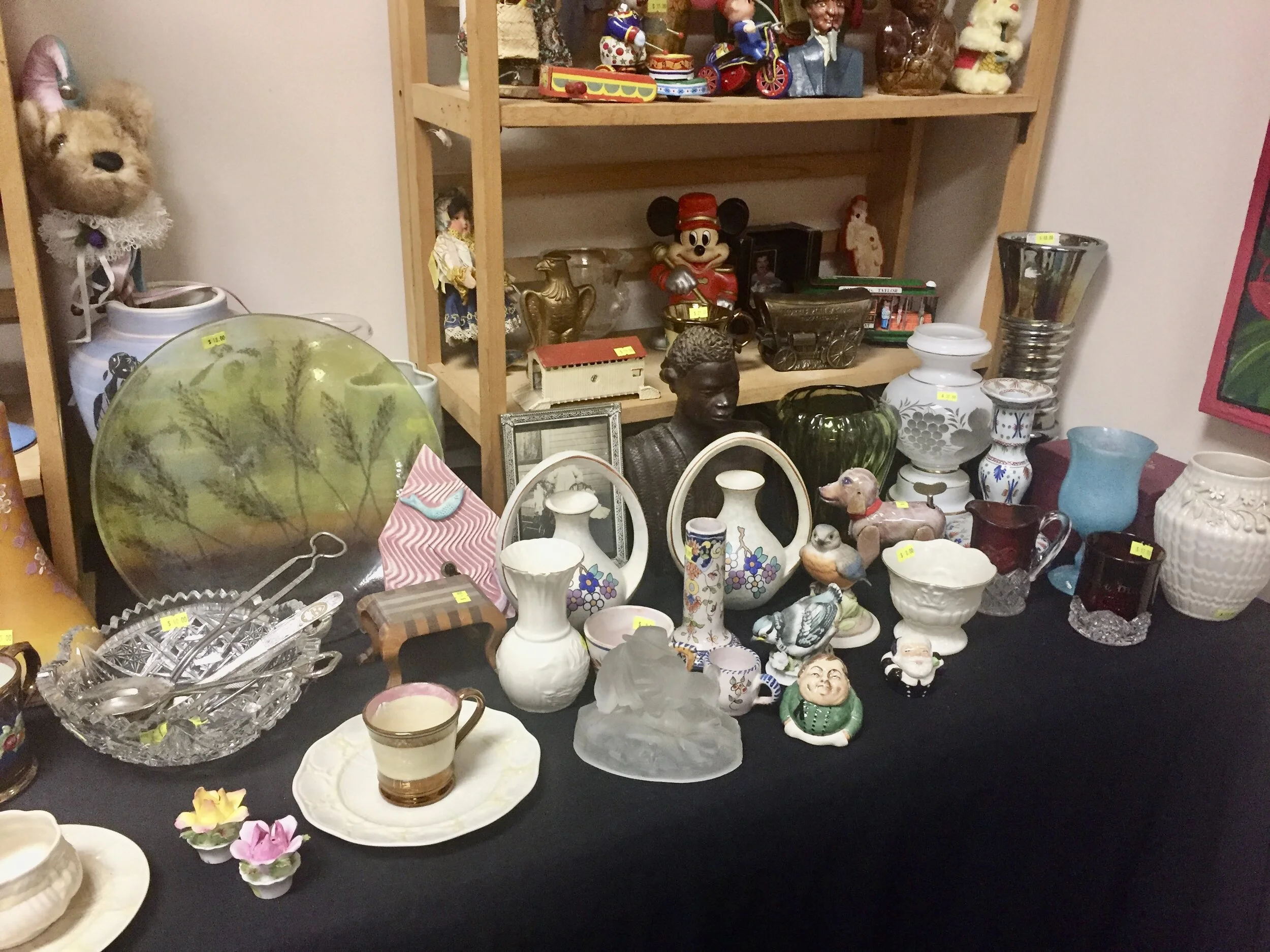 Misc: Large collection of NC pottery, crocks, face jugs, vintage games, costume jewelry, baskets, paperweights, original art: oils, acrylic, Japanese block prints, several listed artists, etc