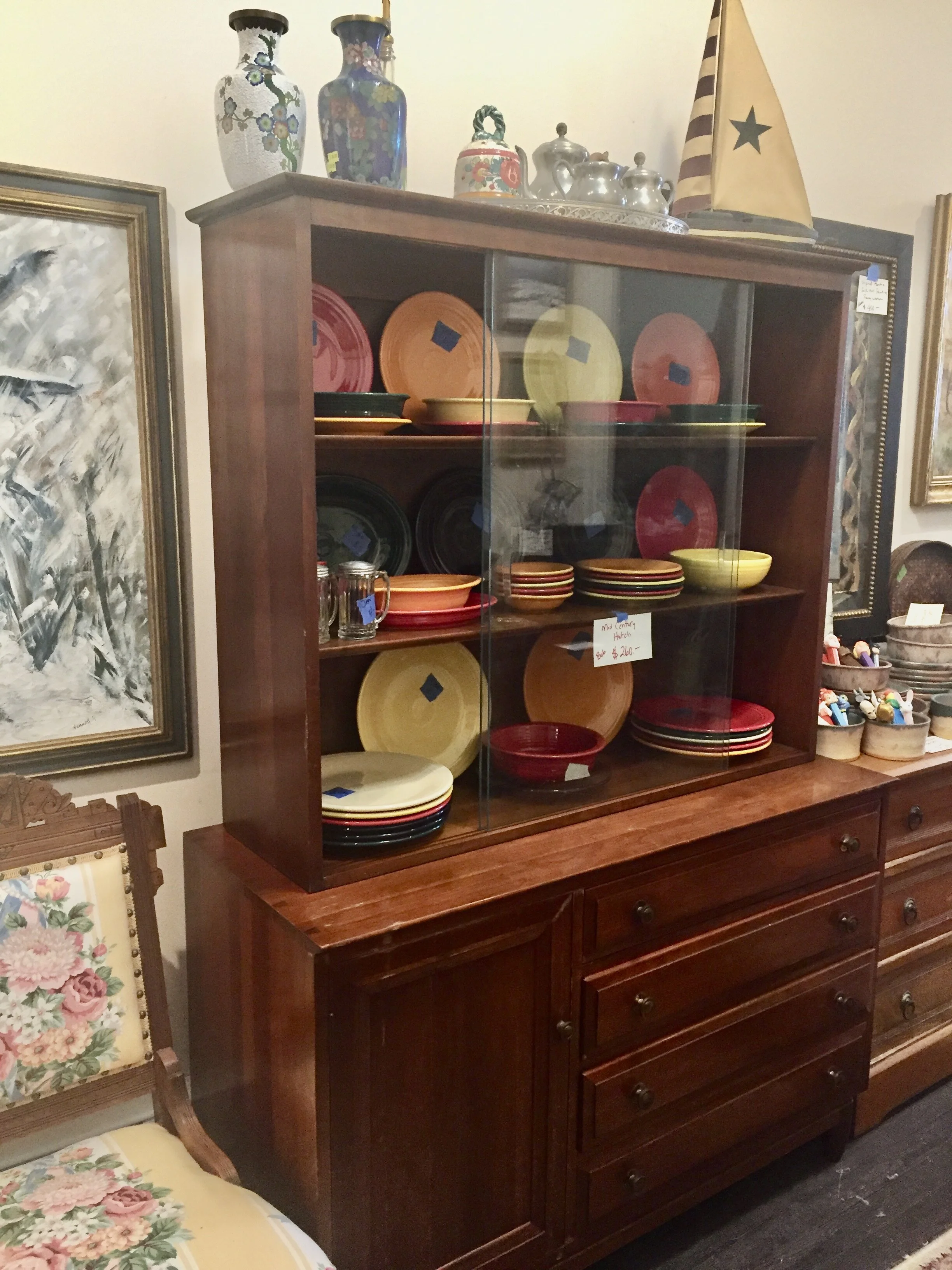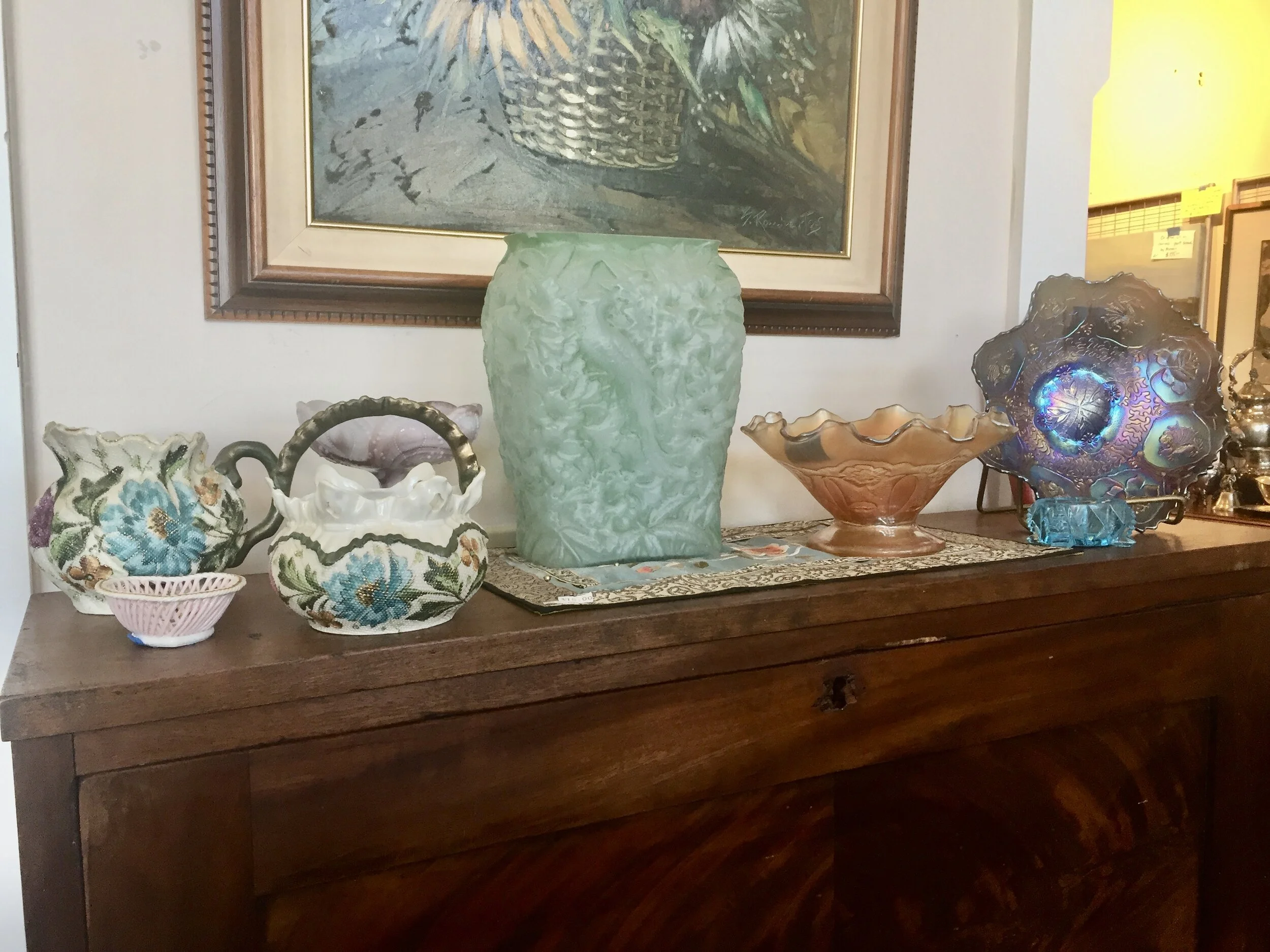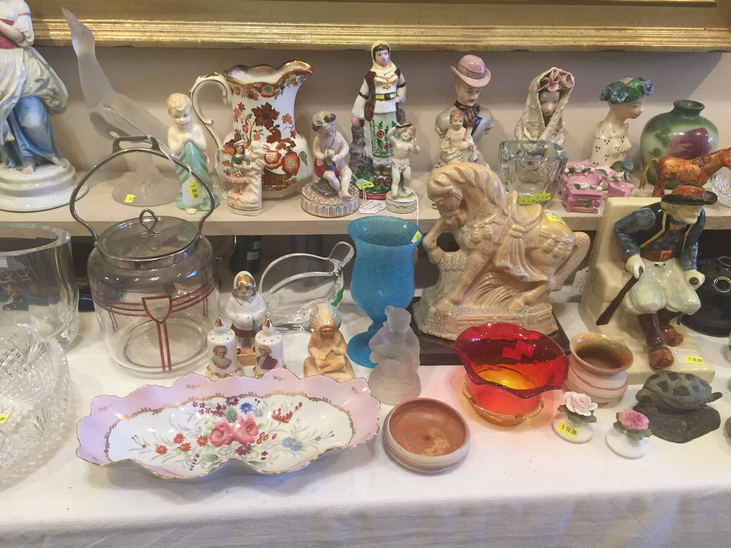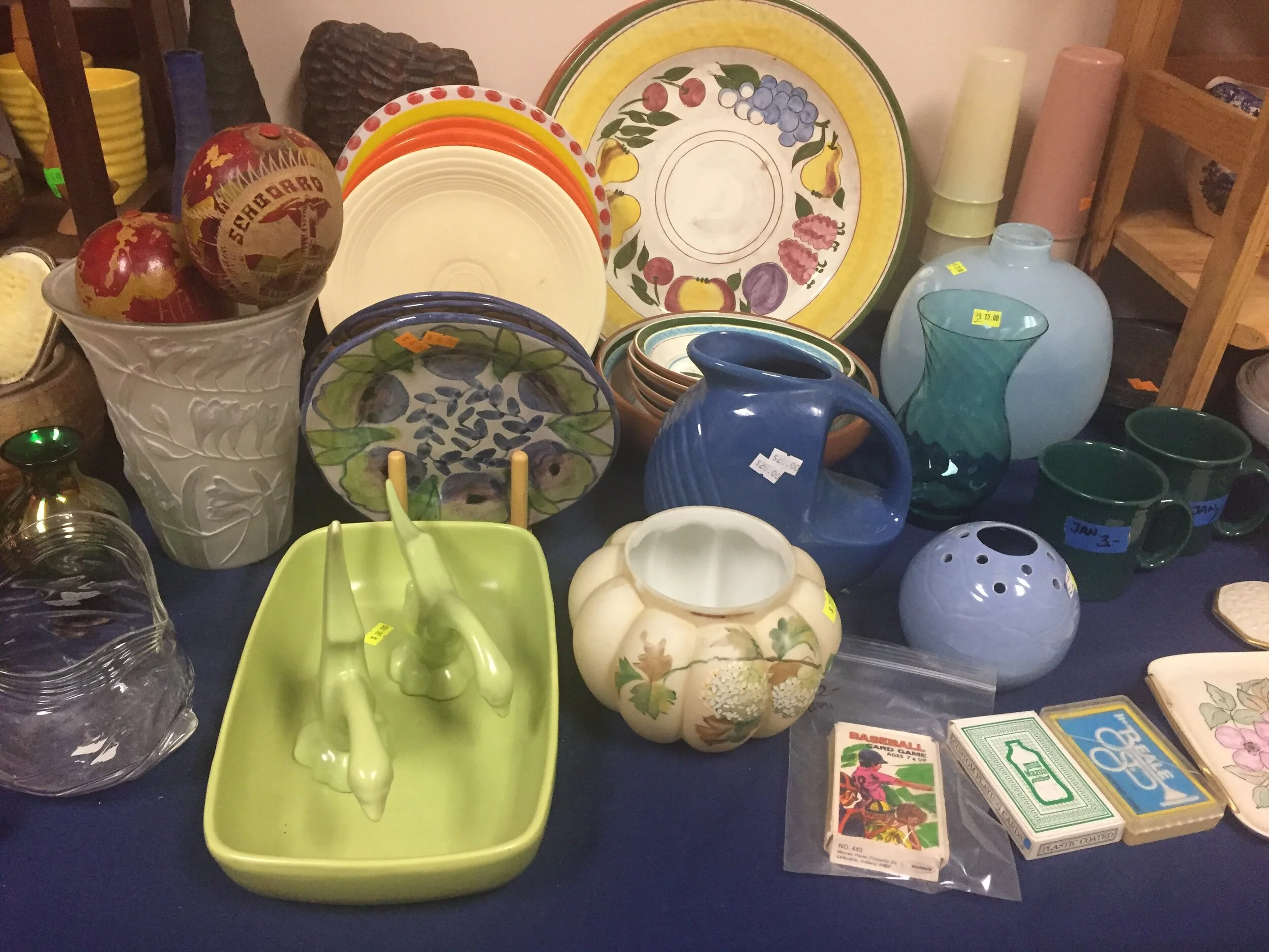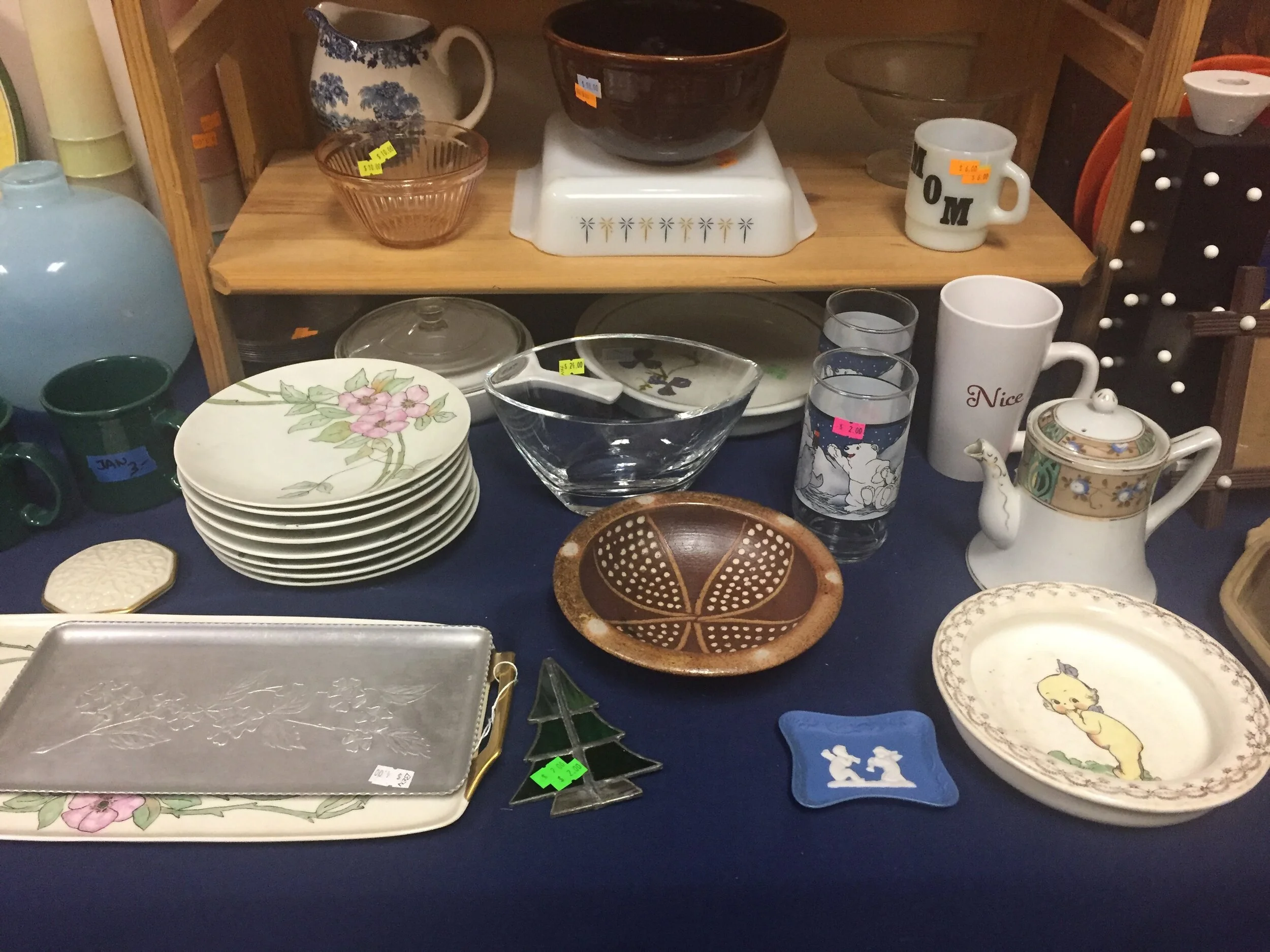 Glassware/China: Pyrex, Fiesta dishes, several sets of China, cut glass, pressed glass, Victorian figurines, hand blown glass, etc