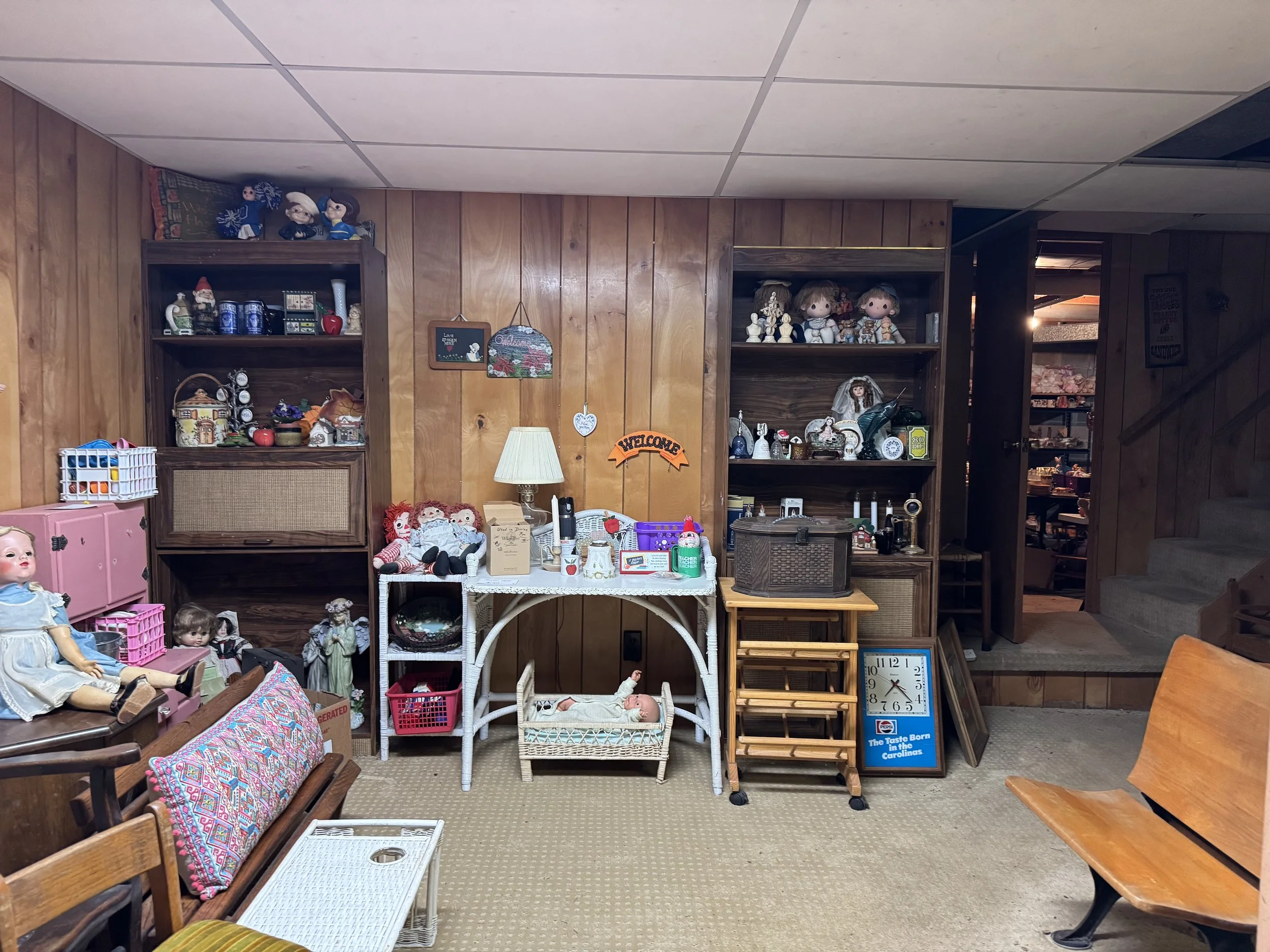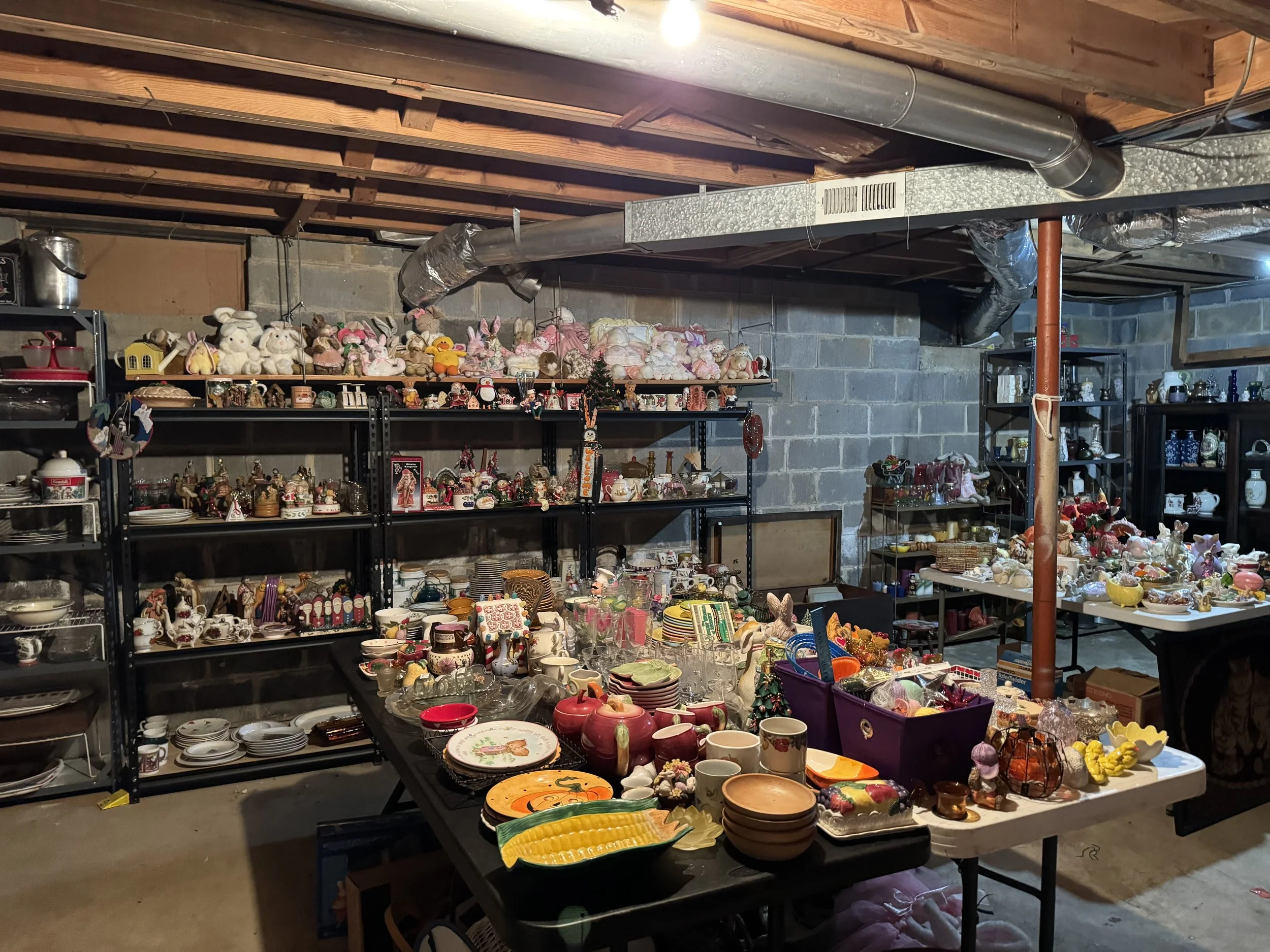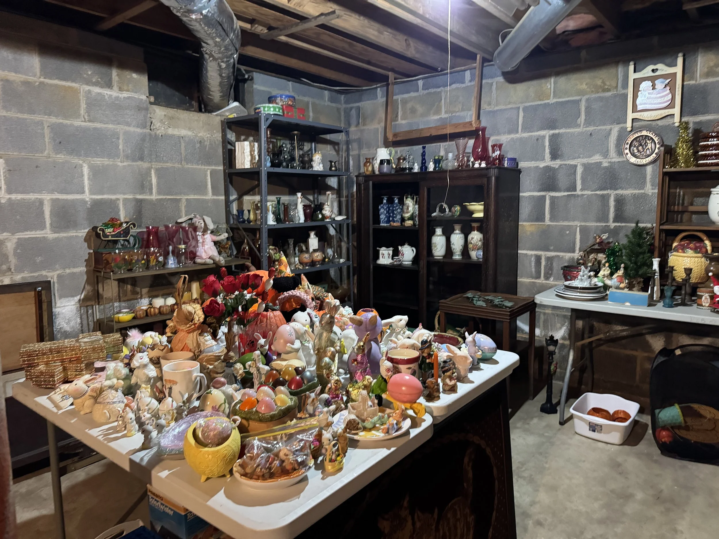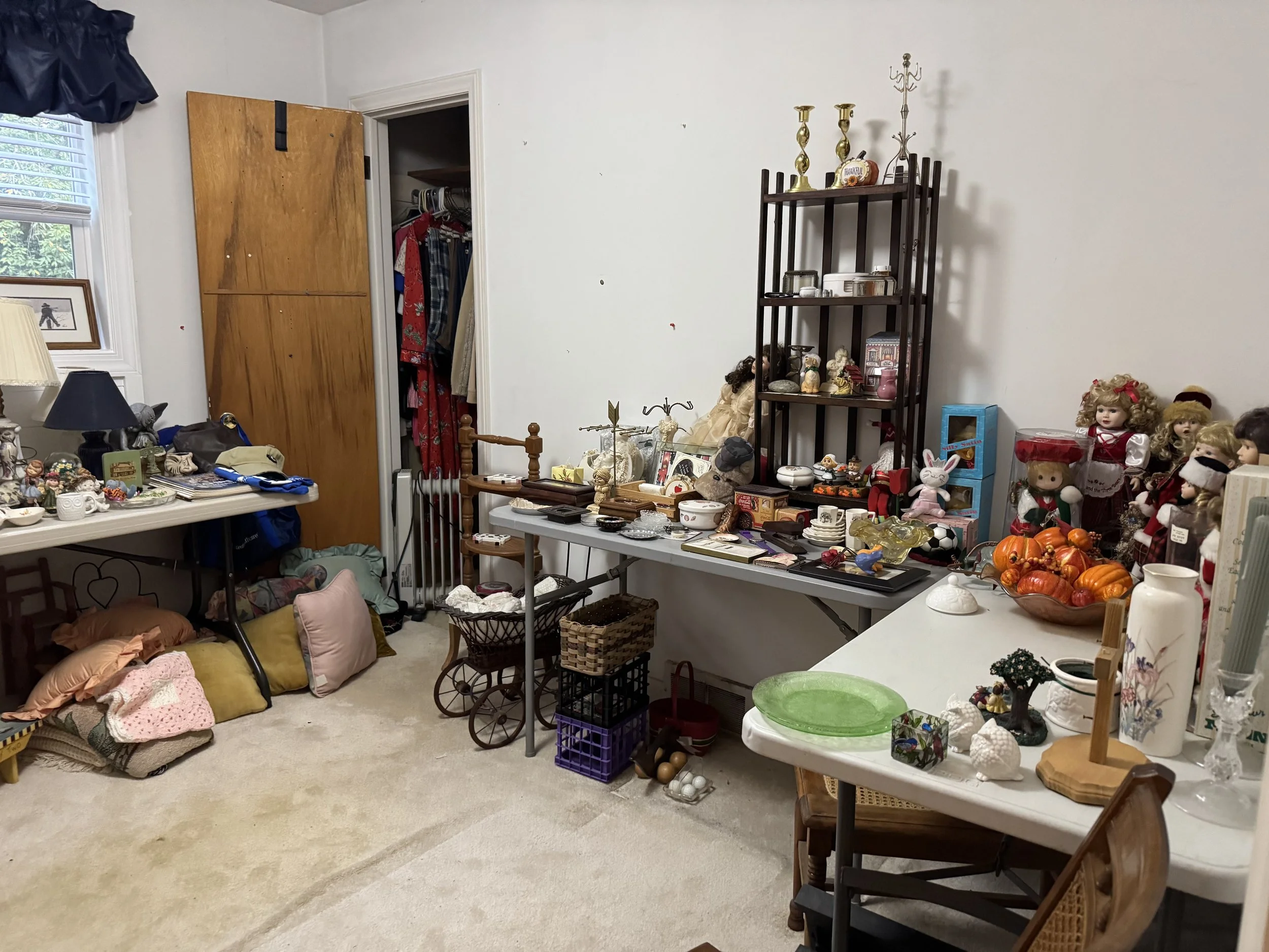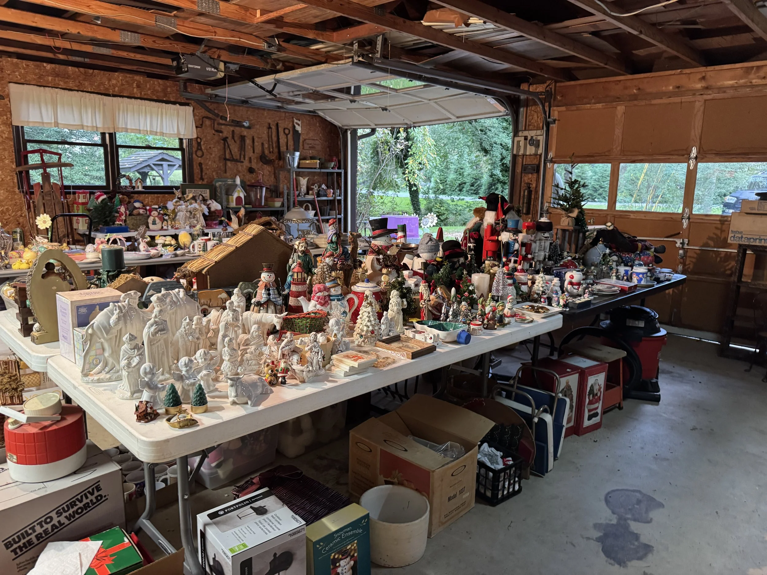 Misc: Hand tools, great organizer boxes, unusual lamps with shades, decorator items, Christmas items, Fall decor, linens, crochet items, cross stitch items, doll collections, women’s clothing size M, vintage toys and games, some vinyl, etc