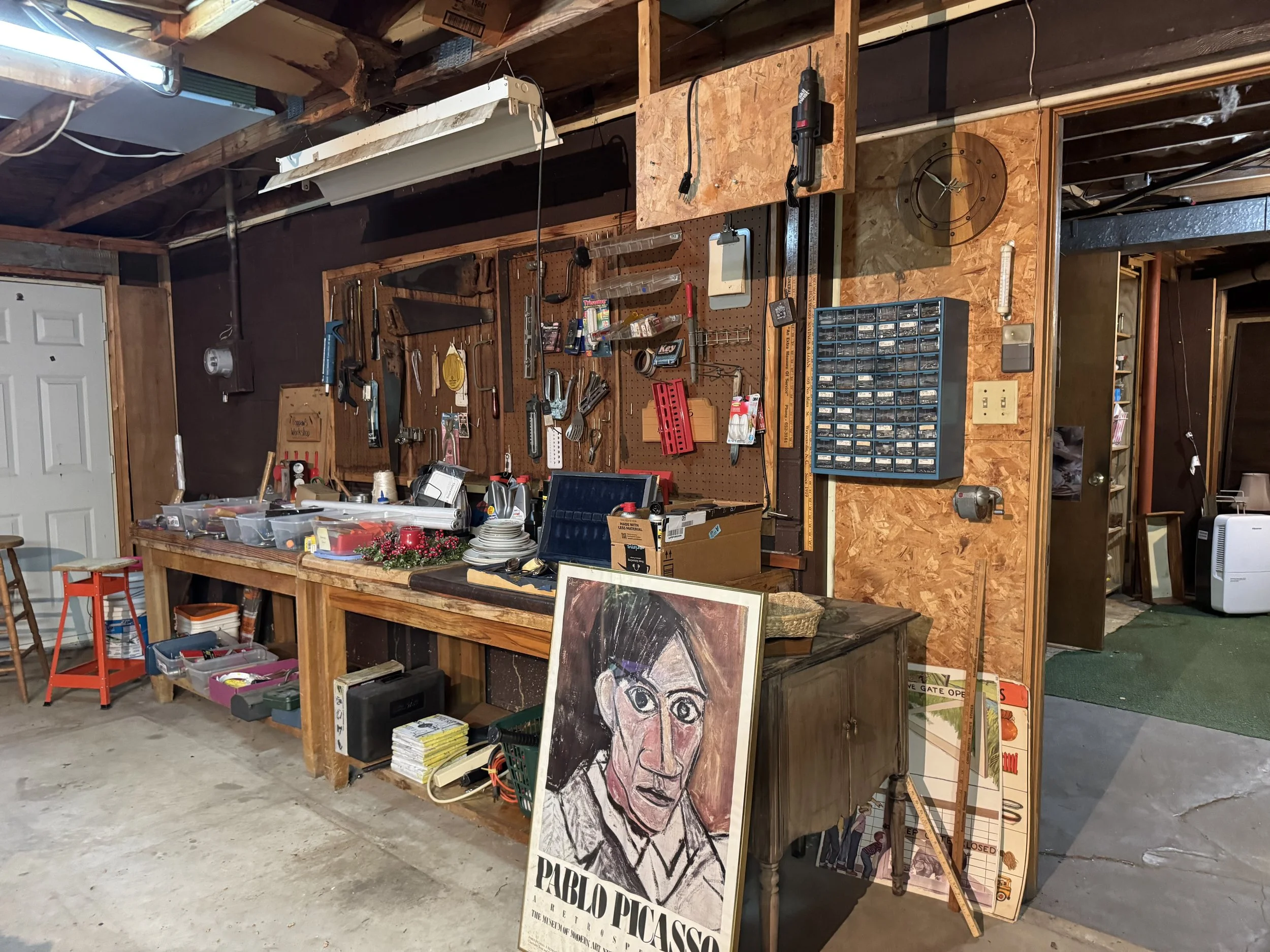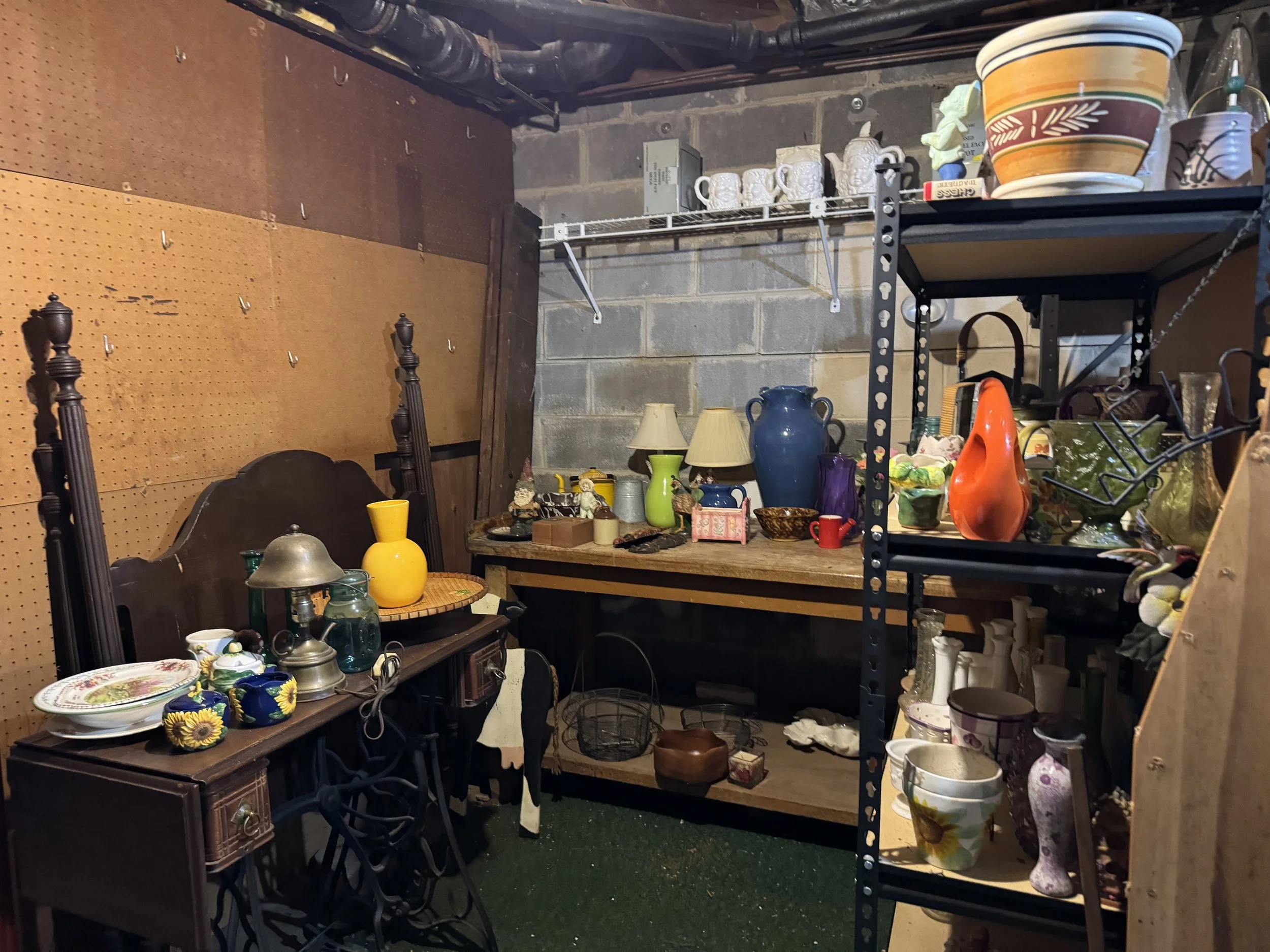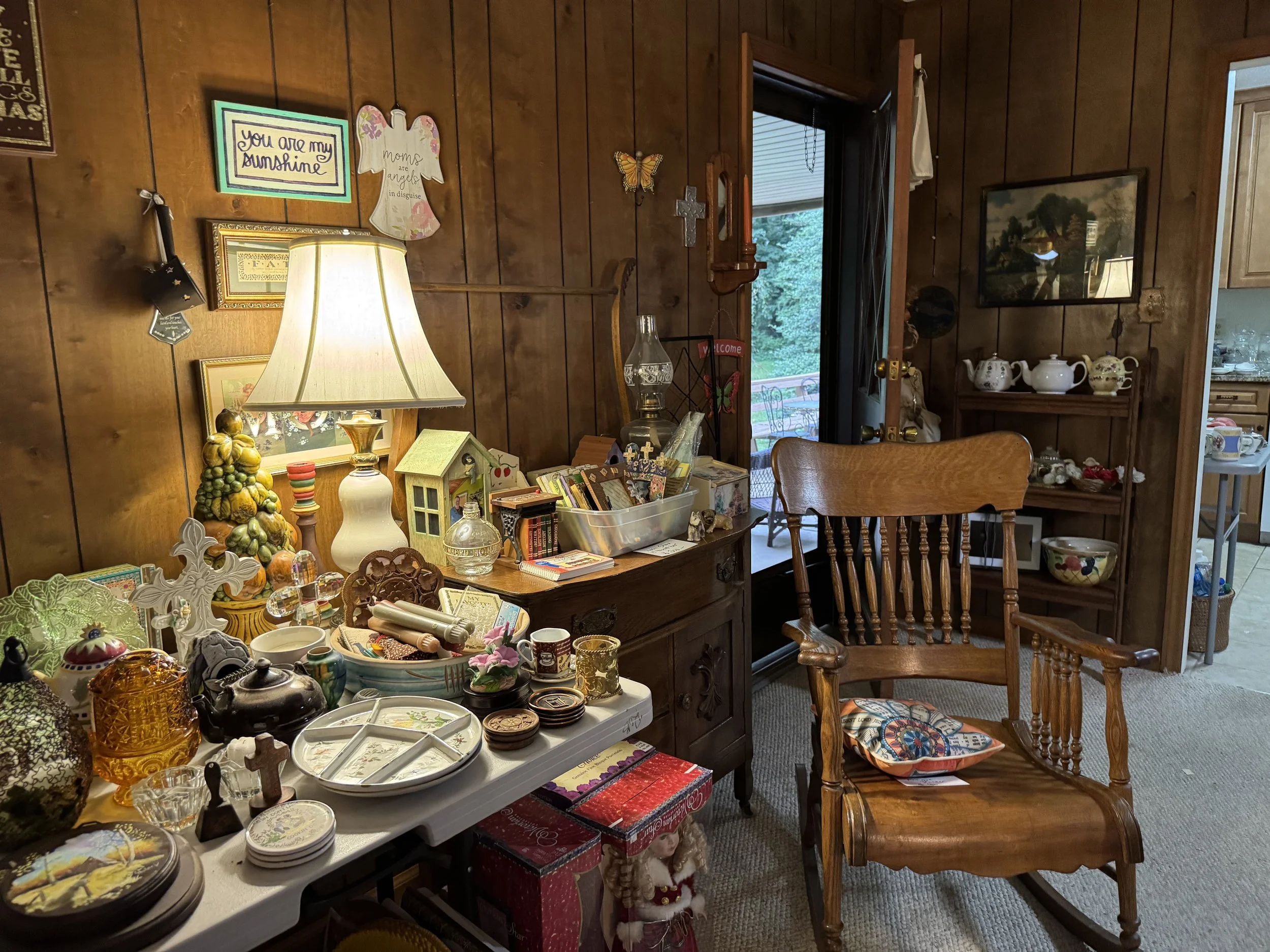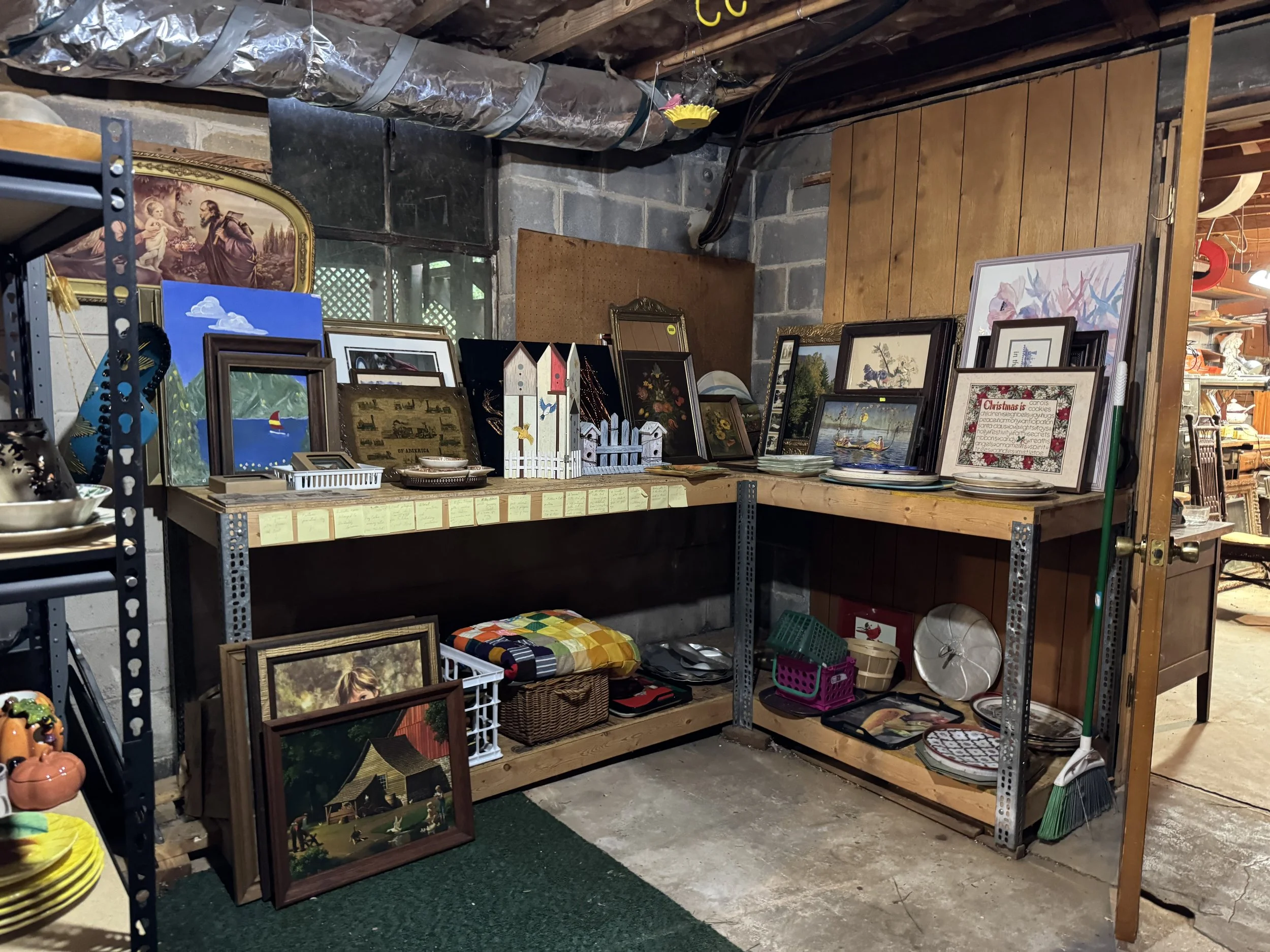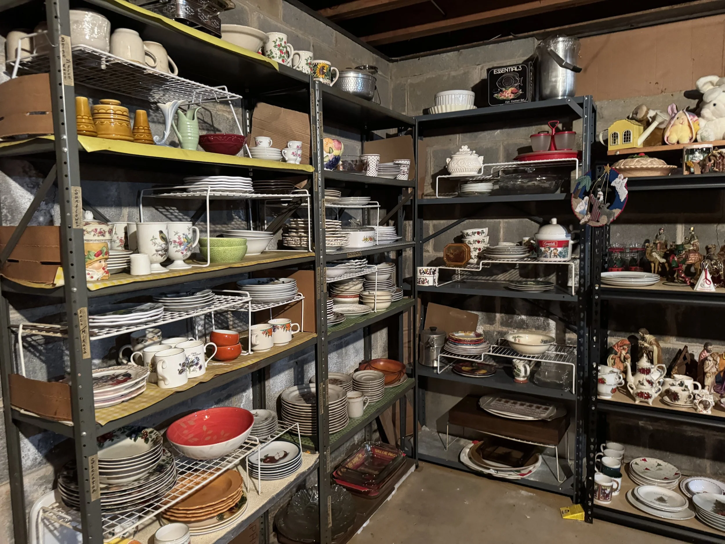 Misc: Hand tools, great organizer boxes, unusual lamps with shades, decorator items, Christmas items, Fall decor, linens, crochet items, cross stitch items, doll collections, women’s clothing size M, vintage toys and games, some vinyl, etc